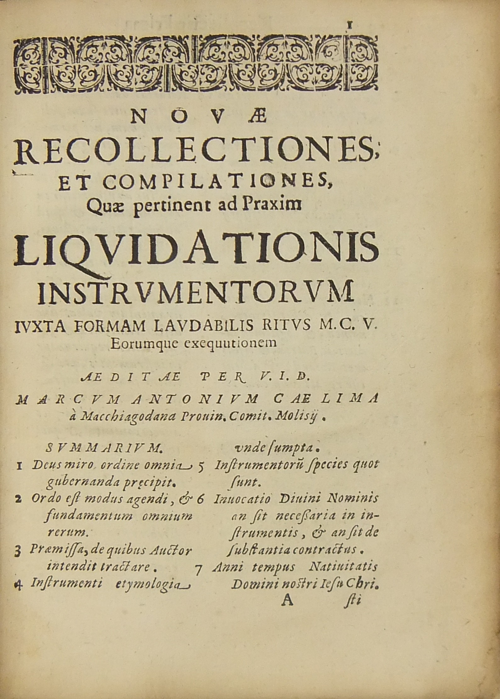 Novae recollectiones et compilationes quae pertinent ad praxim liquidationis instrumentorum iuxta formam laudabilis ritus.. Marcum Antonium Caelima a Macchiagodana prouin. comit. Molisij