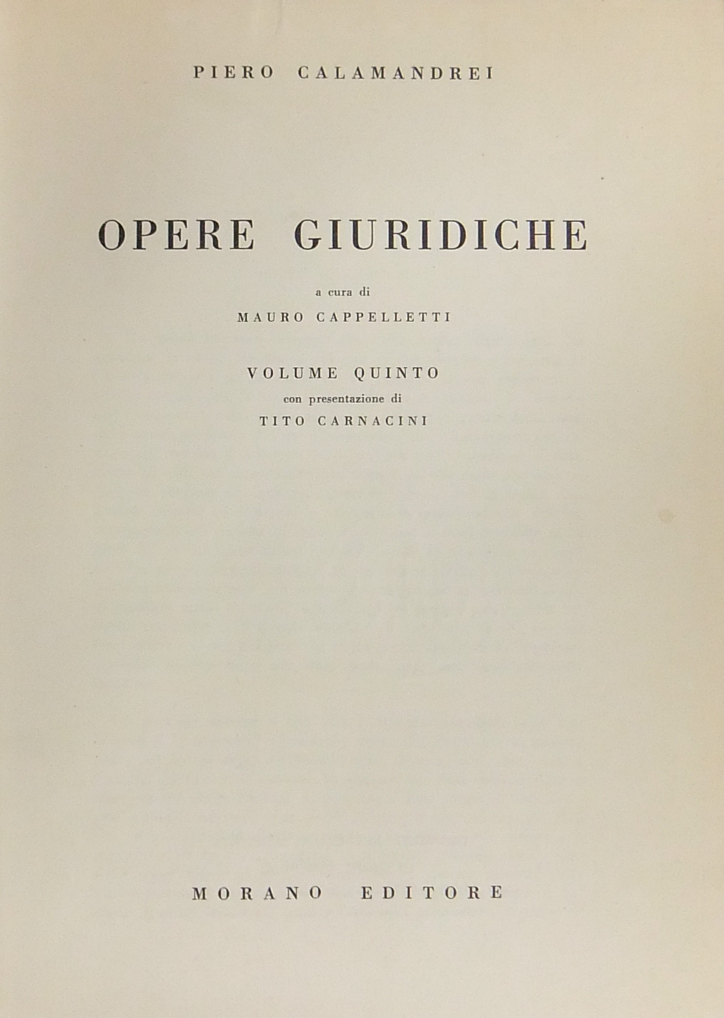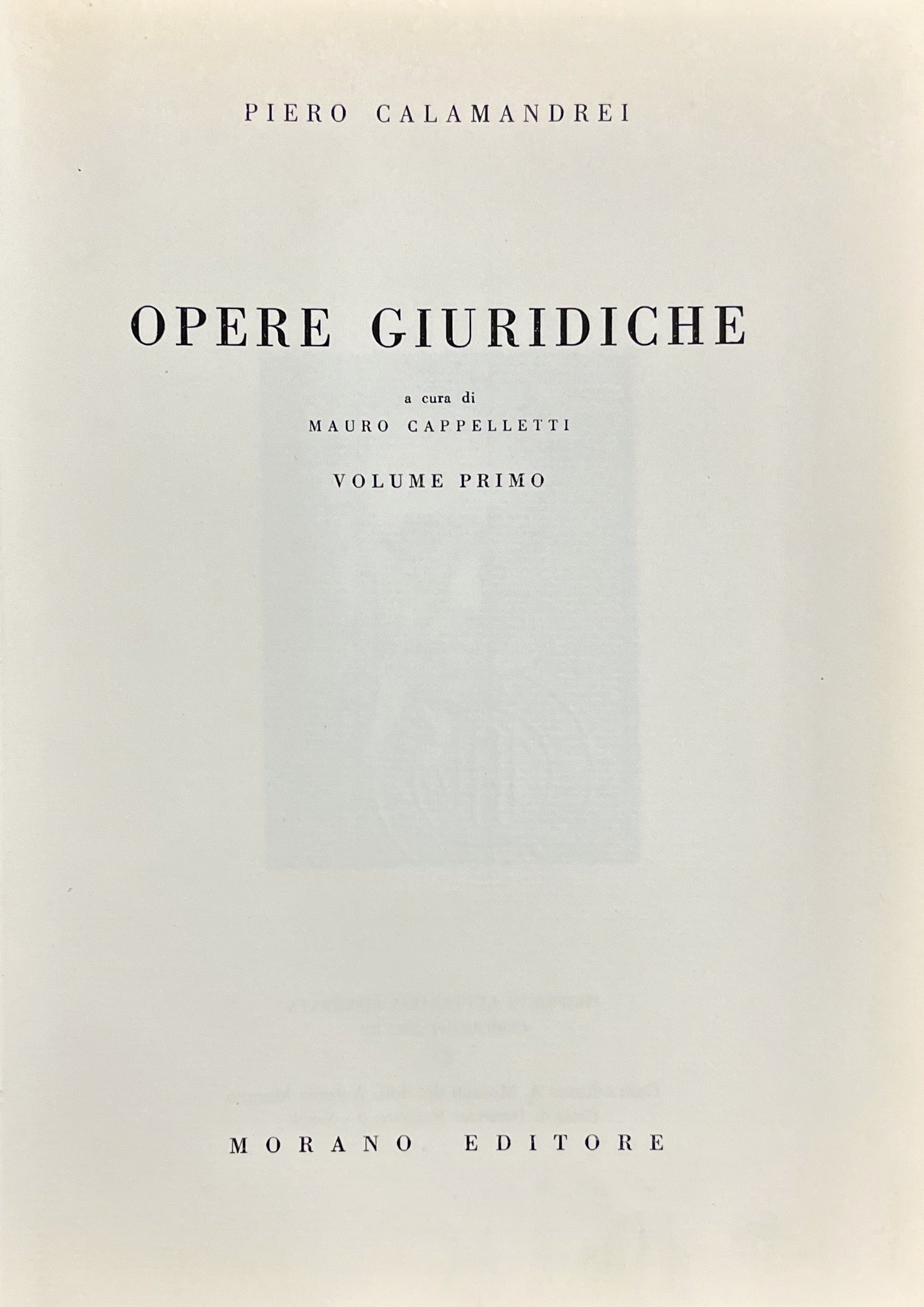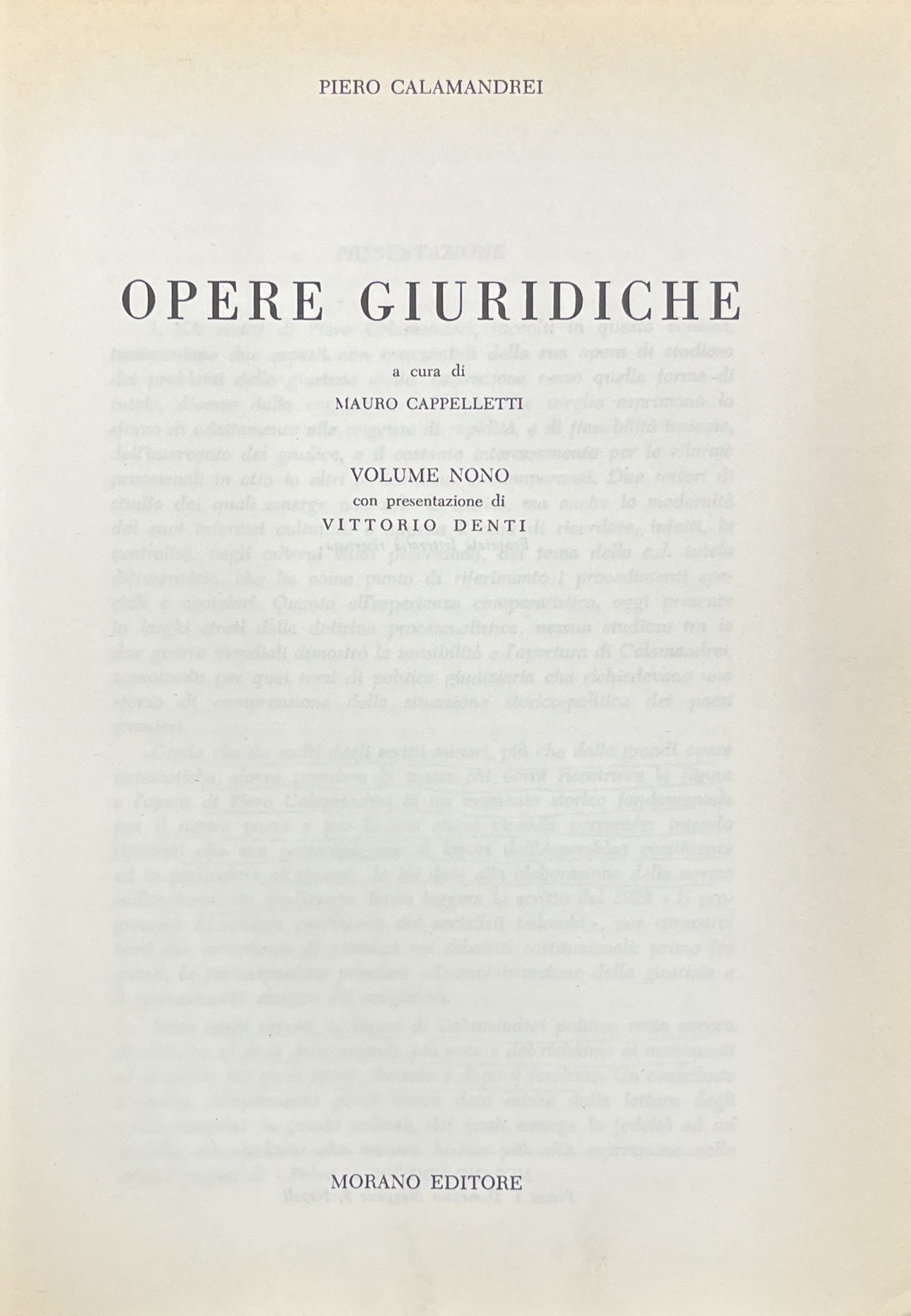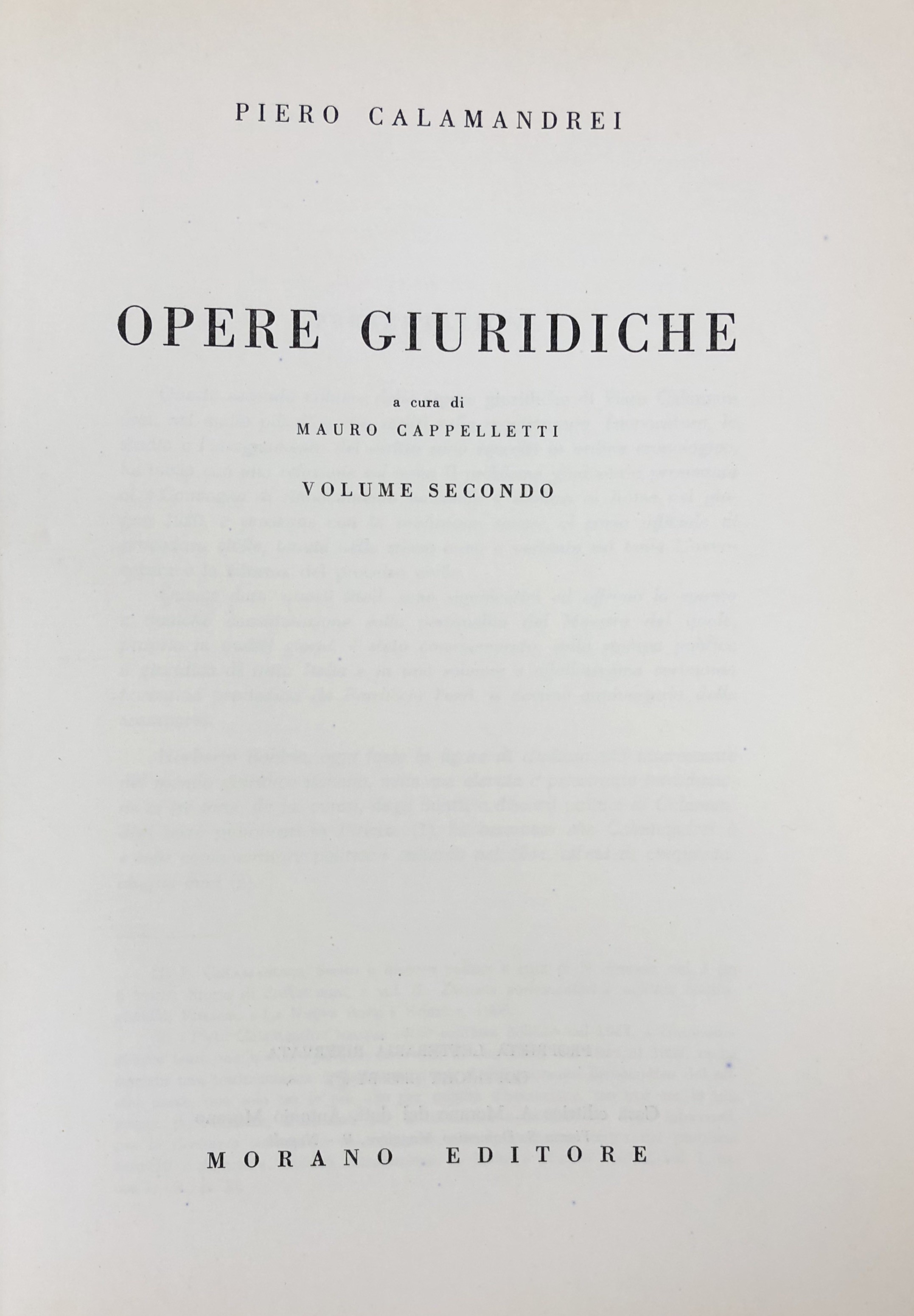 Opere giuridiche. A cura di Mauro Cappelletti. Vol. I - Problemi generali del diritto e del processo. Vol. II - Magistratura, Avvocatura, studio e insegnamento del diritto. Vol. III - Diritto e processo costituzionale. Con presentazione di Costantino Mortati. Vol. IV - Istituzioni di diritto processuale civile. Con presentazione di Enrico Tullio Liebman. In appendice Delle buone relazioni fra i giudici e gli avvocati nel nuovo processo civile (due dialoghi). Vol. V - La chiamata in garantia e altri studi sul processo di cognizione e sulle prove. Con presentazione di Tito Carnacini. Voll. VI-VII - La Cassazione civile. Con presentazione di Virgilio Andrioli. Vol. VIII - Altri studi sulla Cassazione civile sui vizi della sentenza e sulle impugnazioni. Con presentazione di Giovanni Del Pugliese. Vol. IX - Esecuzione forzata e procedimenti speciali. Diritto comparato e ordinamenti storici e stranieri. Con presentazione di Vittorio Denti. Vol. X - Problemi vari e ricordi di giuristi. In appendice Bibliografia completa per gli scritti giuridici politici e letterari di Piero Calamandrei