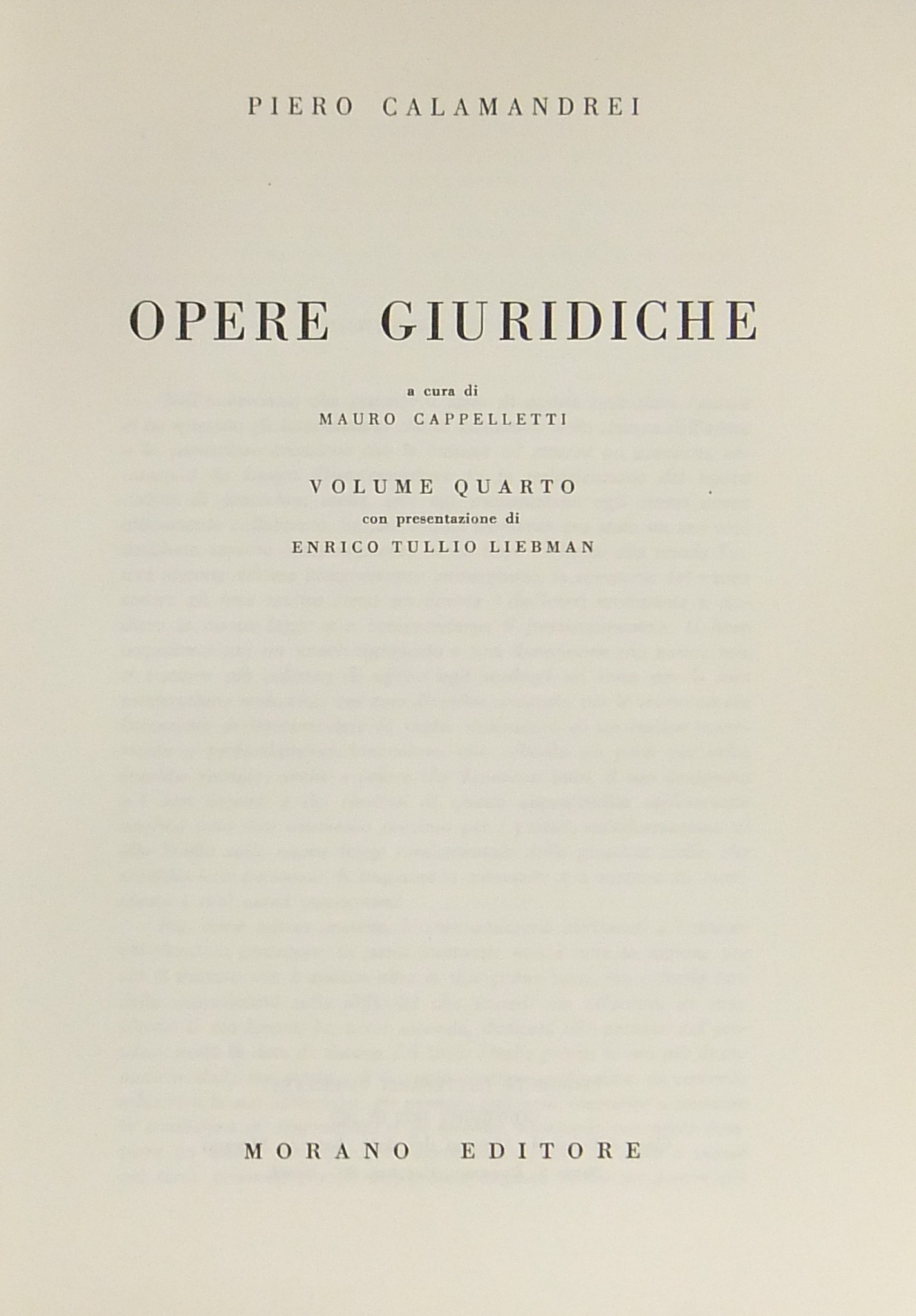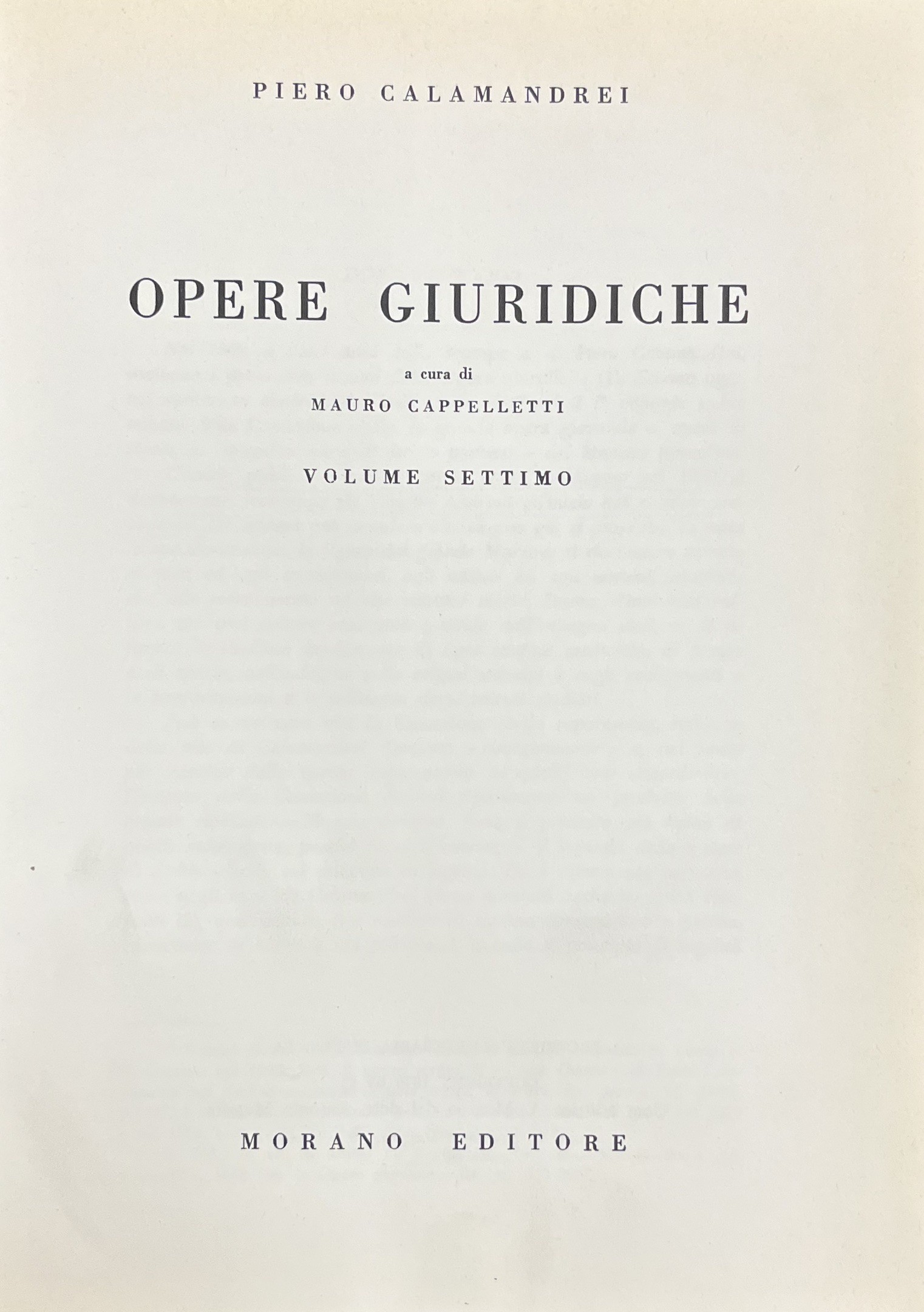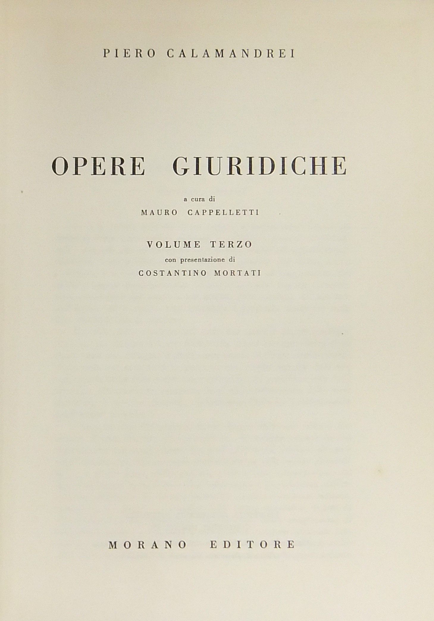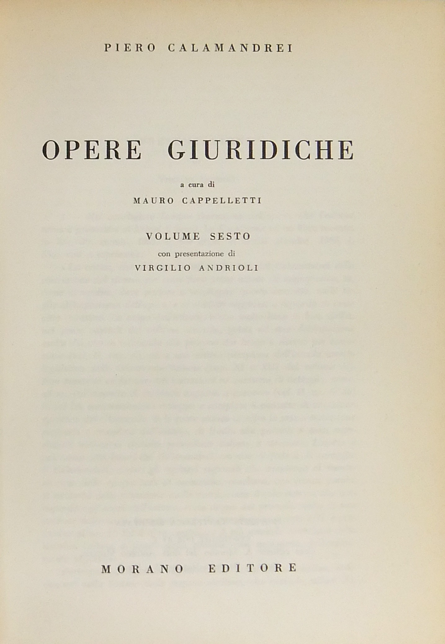 Opere giuridiche. A cura di Mauro Cappelletti. Vol. I - Problemi generali del diritto e del processo. Vol. II - Magistratura, Avvocatura, studio e insegnamento del diritto. Vol. III - Diritto e processo costituzionale. Con presentazione di Costantino Mortati. Vol. IV - Istituzioni di diritto processuale civile. Con presentazione di Enrico Tullio Liebman. In appendice Delle buone relazioni fra i giudici e gli avvocati nel nuovo processo civile (due dialoghi). Vol. V - La chiamata in garantia e altri studi sul processo di cognizione e sulle prove. Con presentazione di Tito Carnacini. Voll. VI-VII - La Cassazione civile. Con presentazione di Virgilio Andrioli. Vol. VIII - Altri studi sulla Cassazione civile sui vizi della sentenza e sulle impugnazioni. Con presentazione di Giovanni Del Pugliese. Vol. IX - Esecuzione forzata e procedimenti speciali. Diritto comparato e ordinamenti storici e stranieri. Con presentazione di Vittorio Denti. Vol. X - Problemi vari e ricordi di giuristi. In appendice Bibliografia completa per gli scritti giuridici politici e letterari di Piero Calamandrei