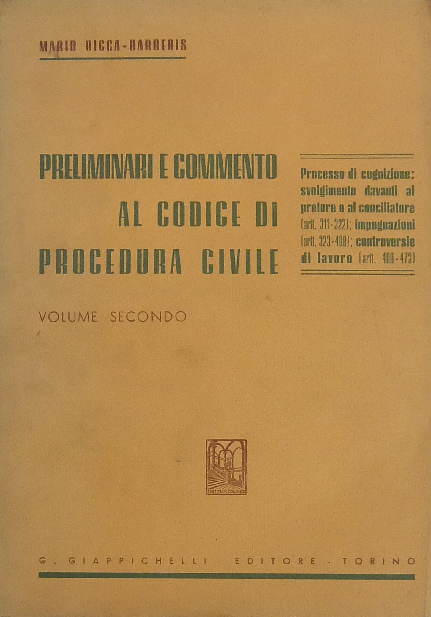 Preliminari e commento al codice di procedura civile. Vol. I - Giudice, parti, esercizio dell'azione, (artt. 1-162); processo di cognizione davanti al tribunale, (artt. 163-310); Vol. II - Processo di cognizione: svolgimento davanti al pretore e al conciliatore, (artt. 311-322); impugnazioni, (artt. 323-408); controversie di lavoro, (artt. 409-473)
