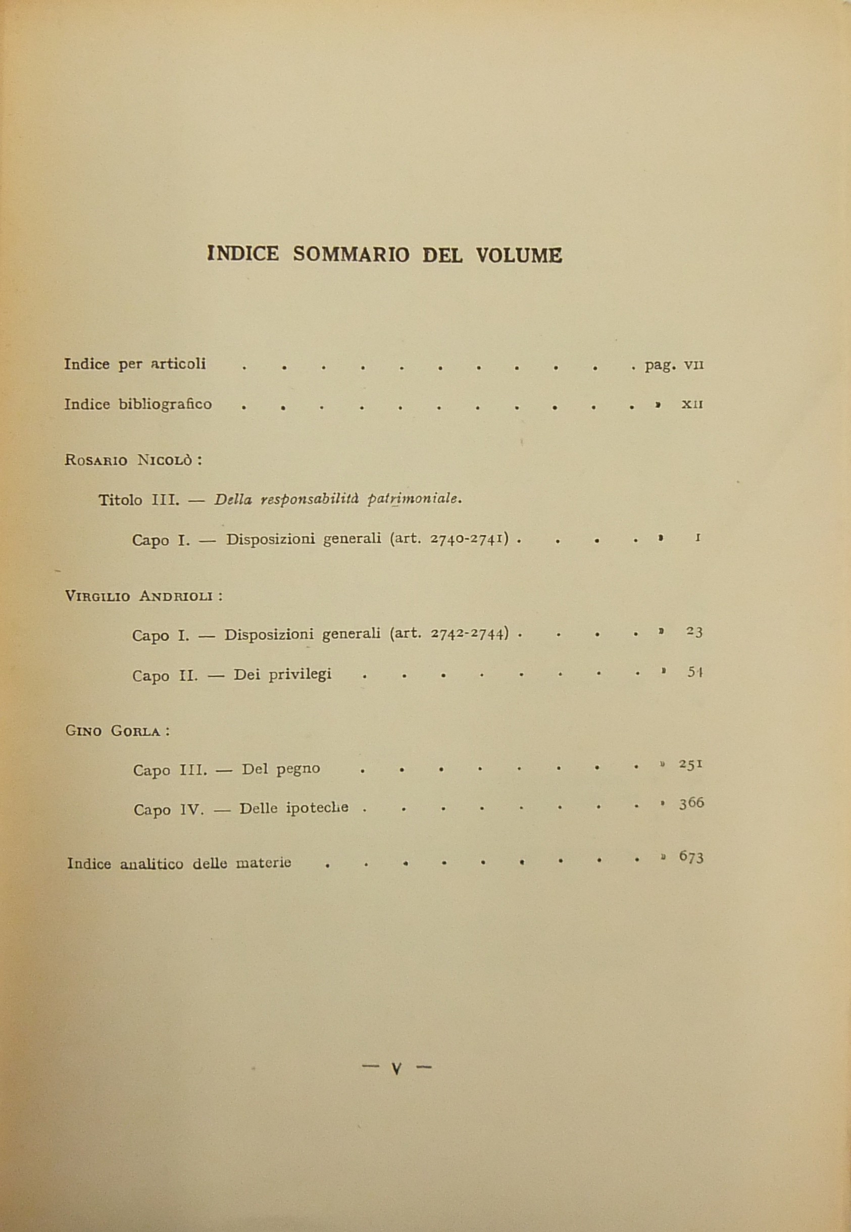Responsabilità patrimoniale. Concorso dei creditori e cause di prelazione (Nicolò). Surrogazione dell'indennità alla cosa. Diminuzione della garanzia patrimoniale. Divieto del patto commissorio. Privilegi (Andrioli). Pegno. Ipoteca (Gorla). Art. 2740-2899