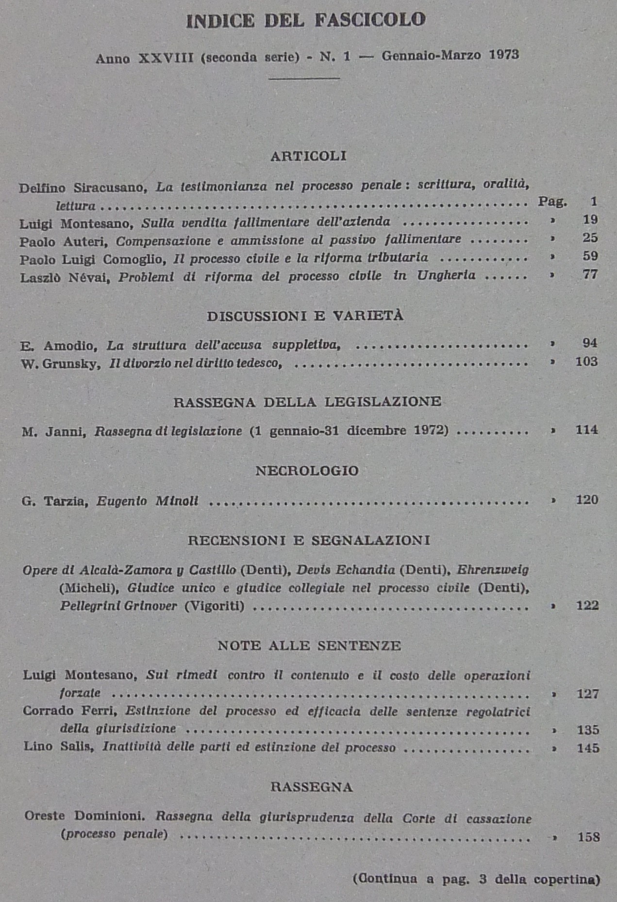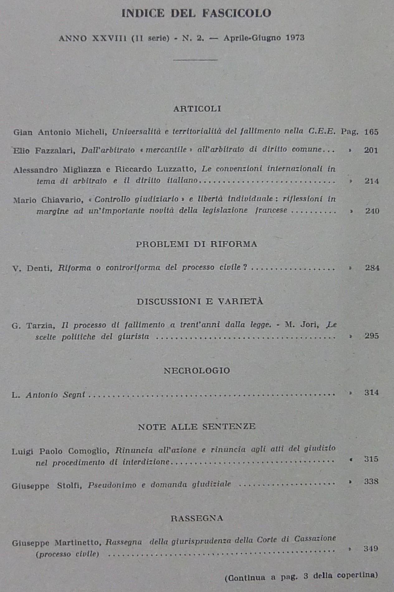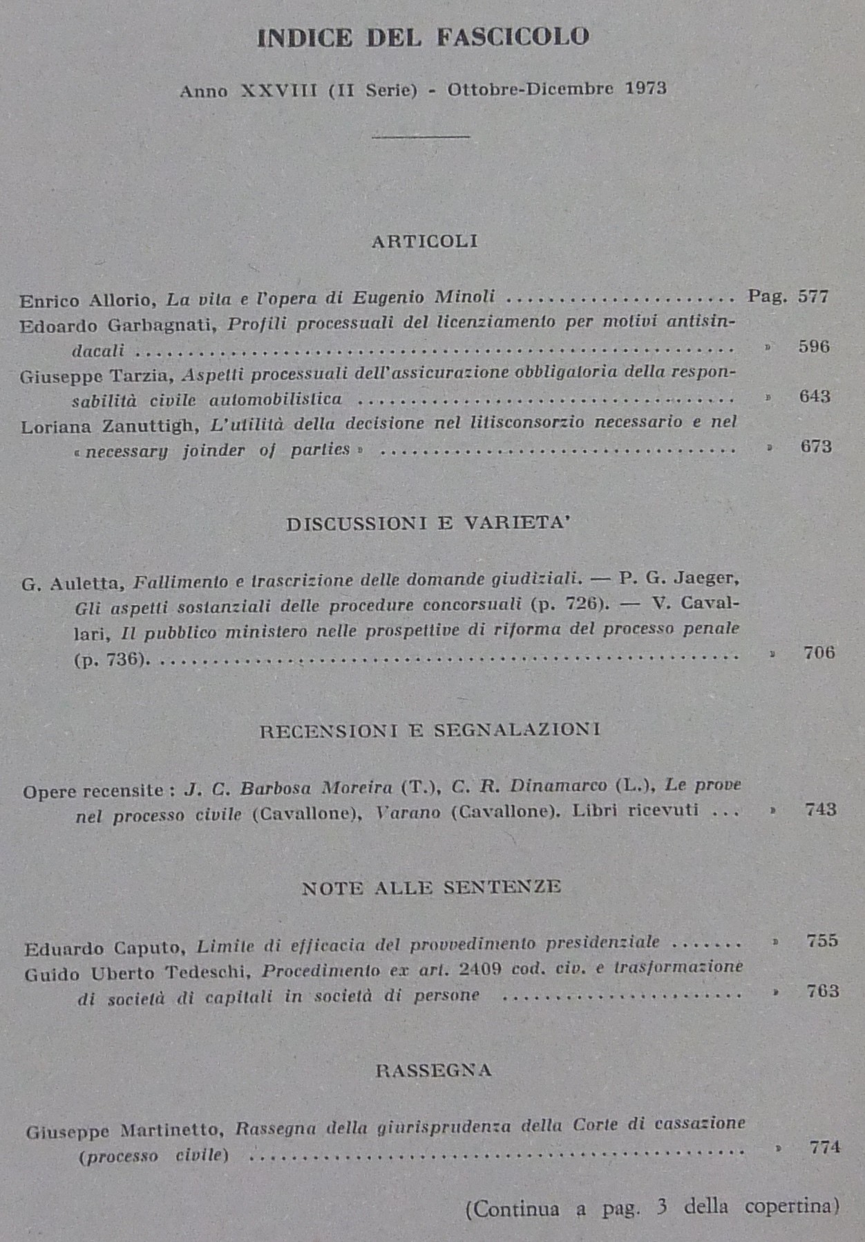 Allorio E. - Amodio E. - Andrioli V. - Auletta G. - Cappelletti M. - Denti V. - Fazzalari E. - Ferri C. - Garbagnati E. - Micheli G.A. - Montesano L. - Salis L. - Stolfi G. - Taruffo M. - Tarzia G. - Tedeschi G.U. et alii