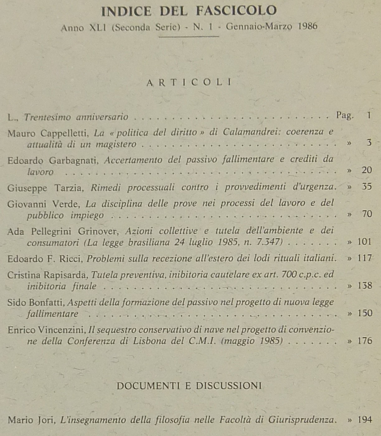 Andrioli V. - Cappelletti M. - Costantino G. - Garbagnati E. - Irti N. - Liebman E.T. - Picardi N. - Pototschnig U. - Ricci E.F. - Tarello G. - Tarzia G. - Taruffo M. - Trabucchi A. - Verde G. et alii