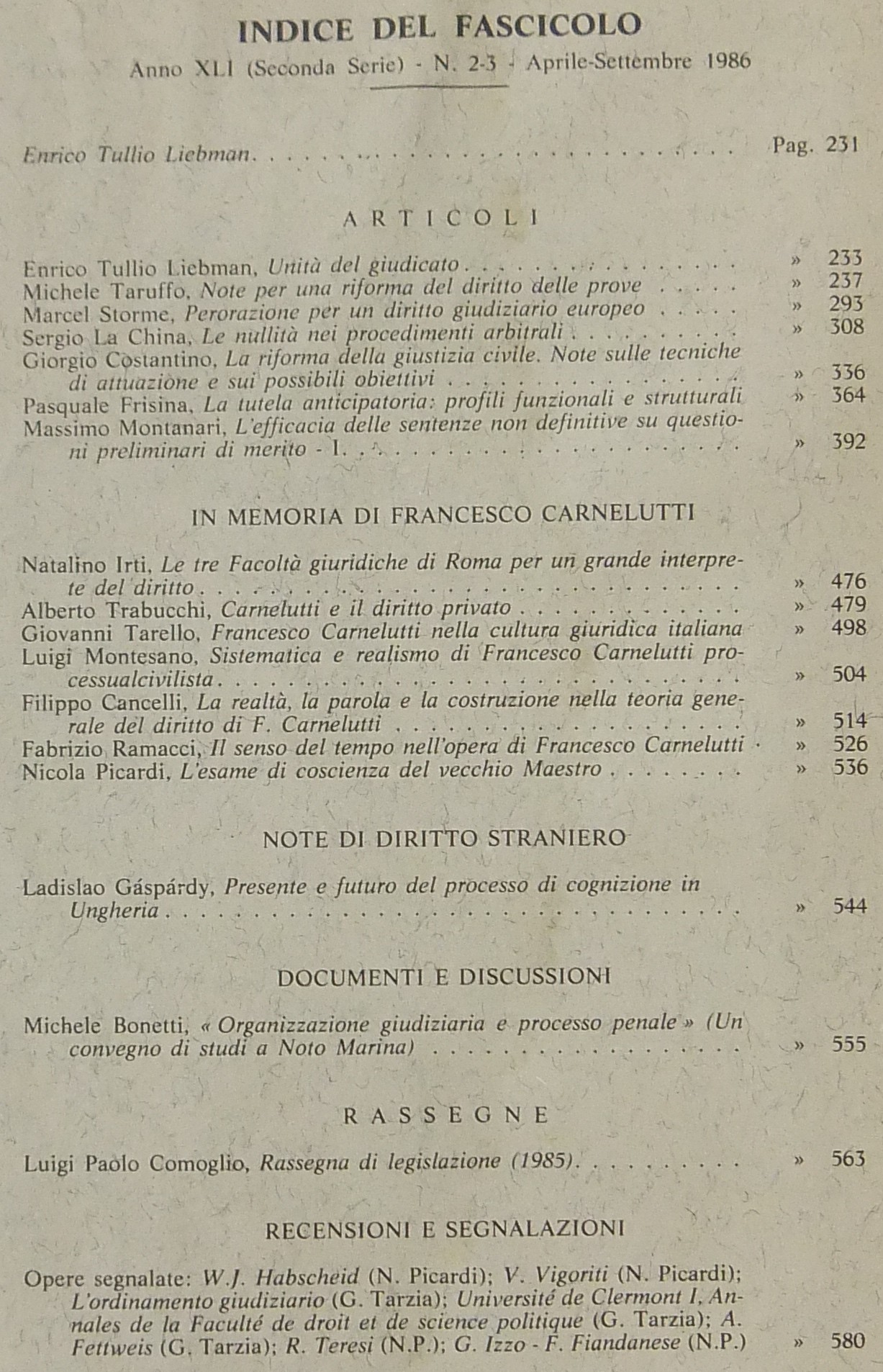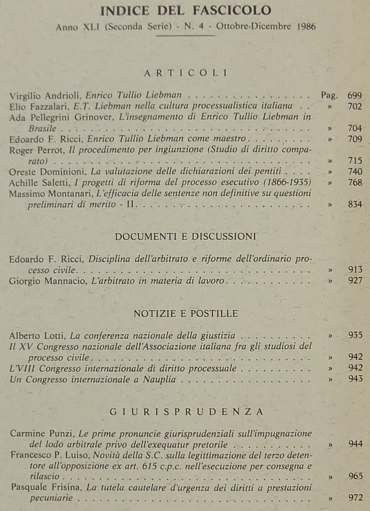 Rivista di Diritto Processuale. Annata 1986. Diretta da: Francesco Carnelutti, Giuseppe Chiovenda, Piero Calamandrei, Enrico Tullio Liebman. Anno XLI (Seconda Serie)