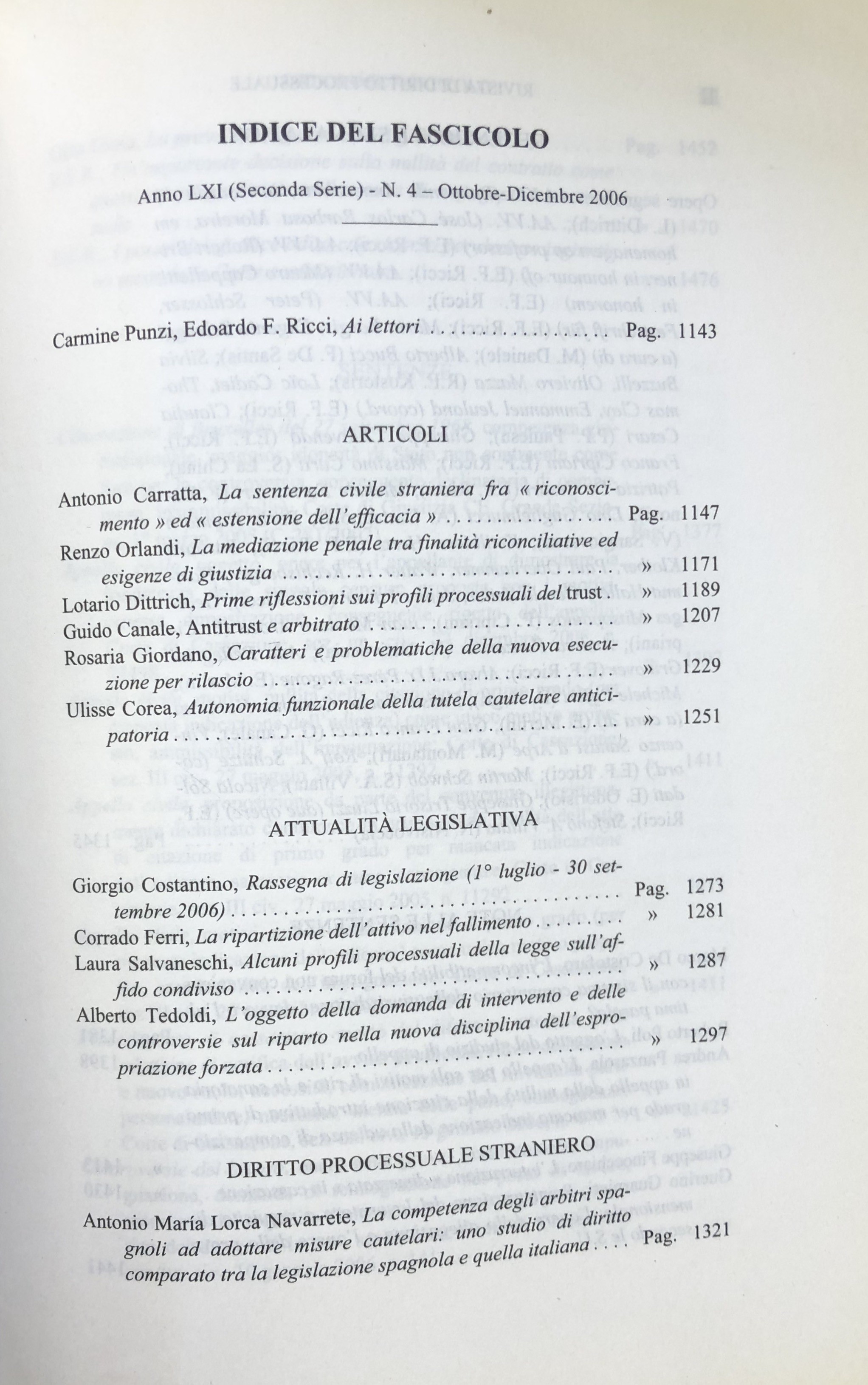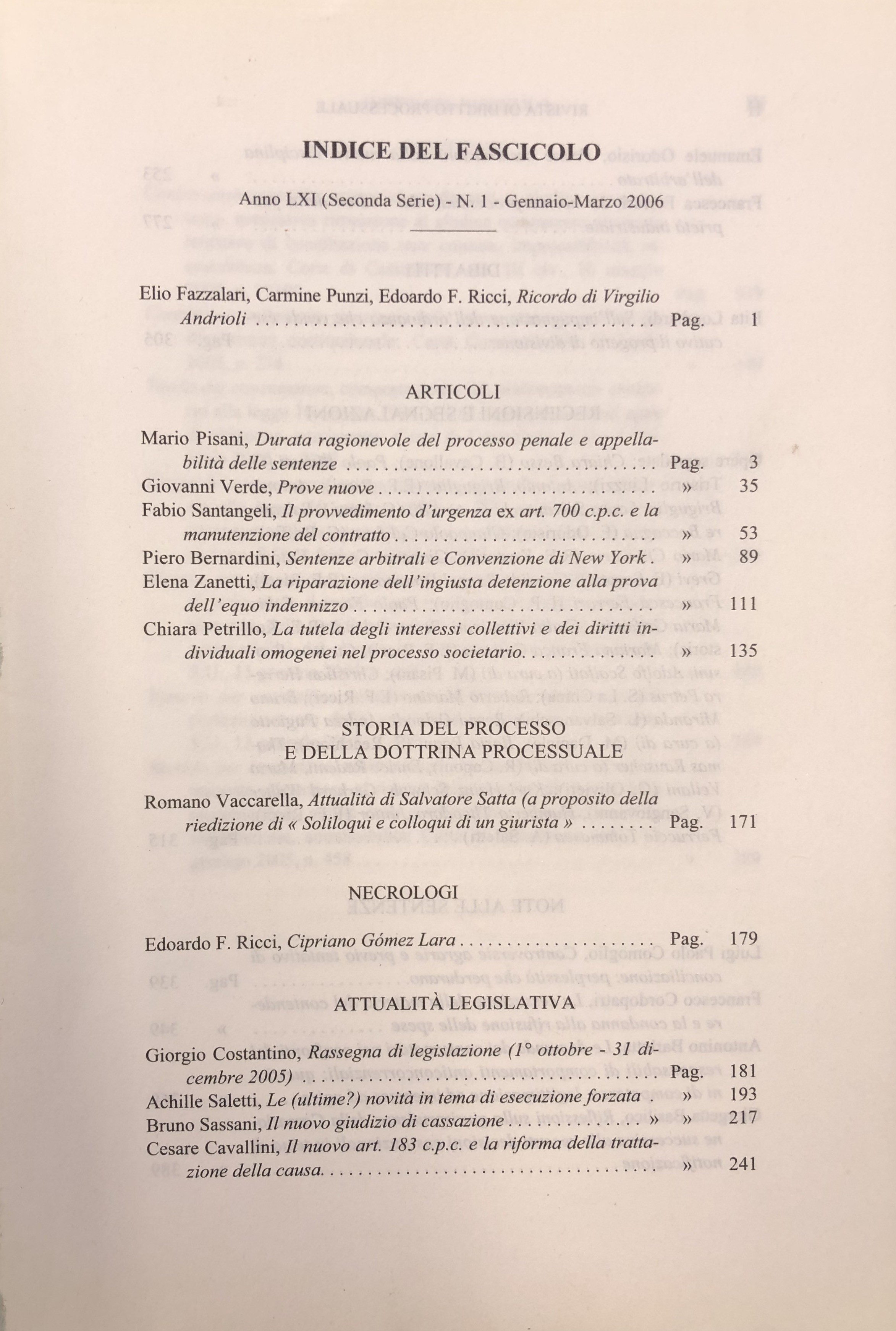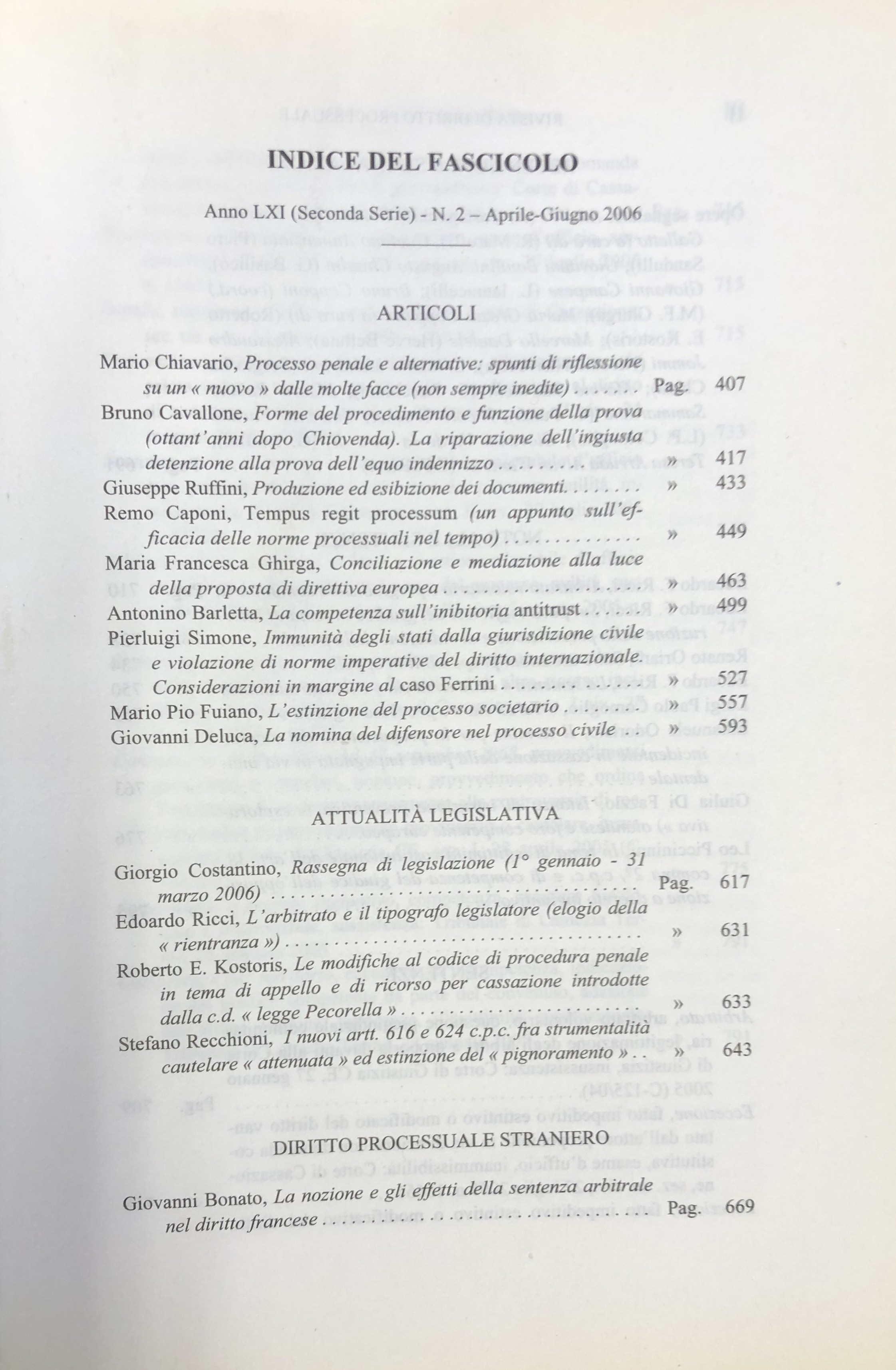 Rivista di Diritto Processuale. Annata 2006. Diretta da: Francesco Carnelutti, Giuseppe Chiovenda, Piero Calamandrei, Enrico Tullio Liebman. Anno LXI (Seconda Serie)