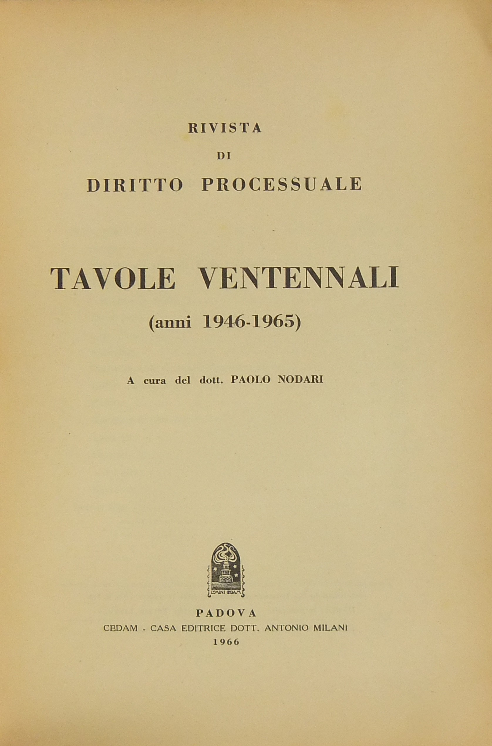 Rivista di Diritto Processuale. Diretta da: Francesco Carnelutti, Giuseppe Chiovenda, Piero Calamandrei, Enrico Tullio Liebman. Tavole ventennali 1946-1965