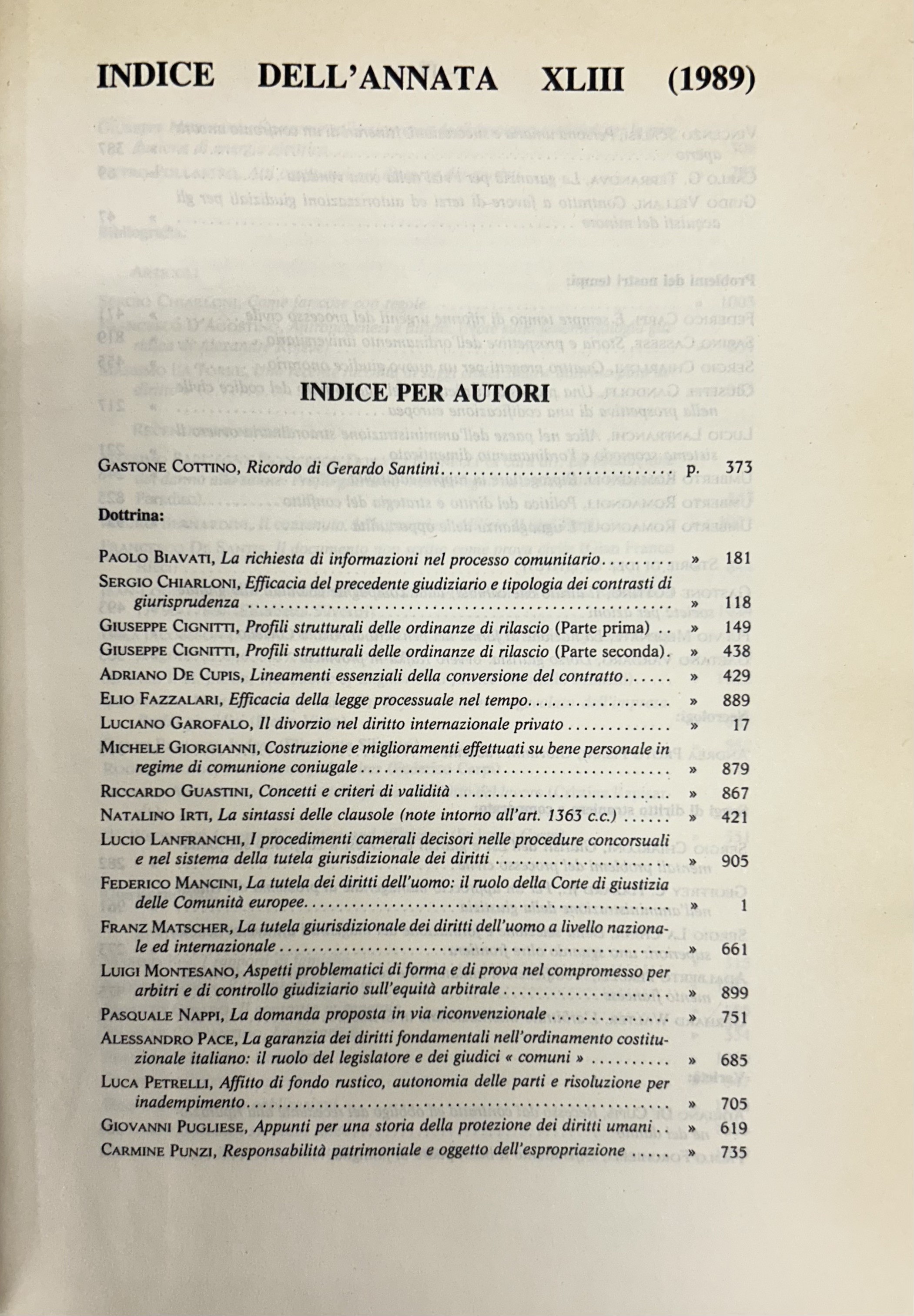 Rivista trimestrale di diritto e procedura civile. Fondata da: A. Cicu, E. Redenti e T. Carnacini. Diretta da: G. Auletta, E Bassanelli, M. Bin, F. Carpi, G. De Nova, G. Franchi, F. Galgano, M. Giorgianni, N. Irti, G.F. Mancini, L. Mengoni, U. Romagnoli, F. Santoro Passarelli, M. Taruffo. Anno XLIII - 1989