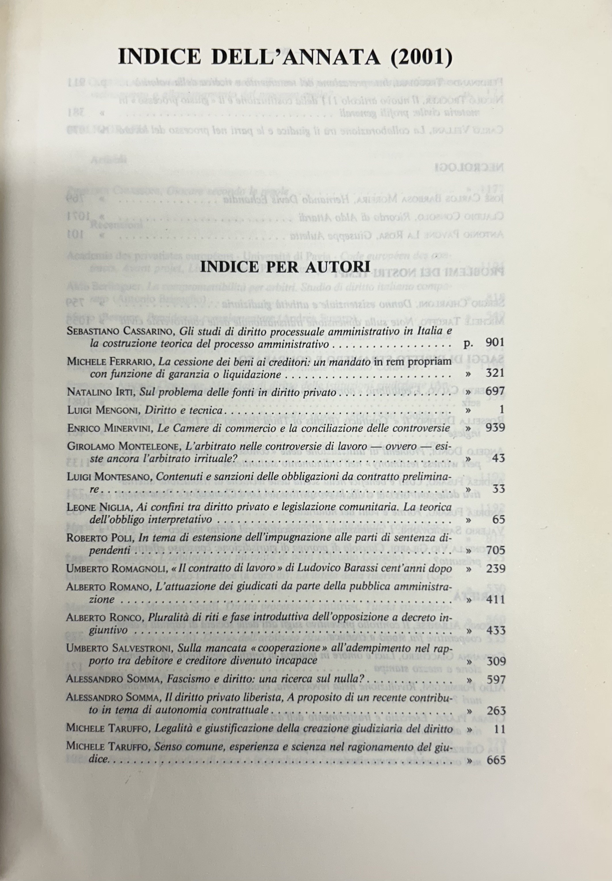Rivista trimestrale di diritto e procedura civile. Fondata da: A. Cicu, E. Redenti e T. Carnacini. Diretta da: G. Alpa, G. Debenedetti, M. Bin, S. Chiarloni, C. Consolo, R. Costi, G. De Nova, F. Galgano, N. Irti, N. Lipari, F.P. Luiso, M. Taruffo. Anno LV - 2001