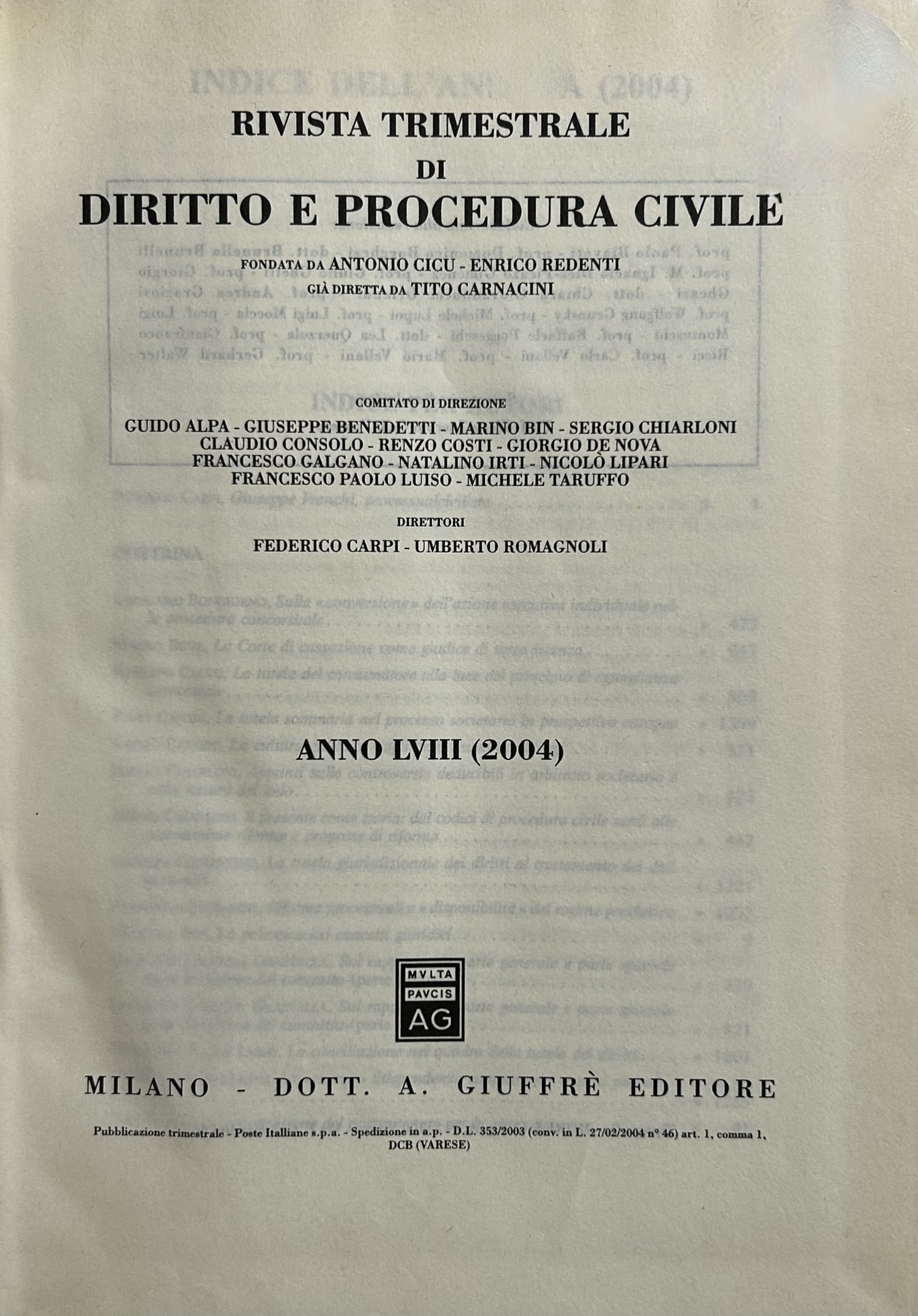 Rivista trimestrale di diritto e procedura civile. Fondata da: A. Cicu, E. Redenti e T. Carnacini. Diretta da: G. Alpa, G. Debenedetti, M. Bin, S. Chiarloni, C. Consolo, R. Costi, G. De Nova, F. Galgano, N. Irti, N. Lipari, F.P. Luiso, M. Taruffo. Anno LVIII - 2004