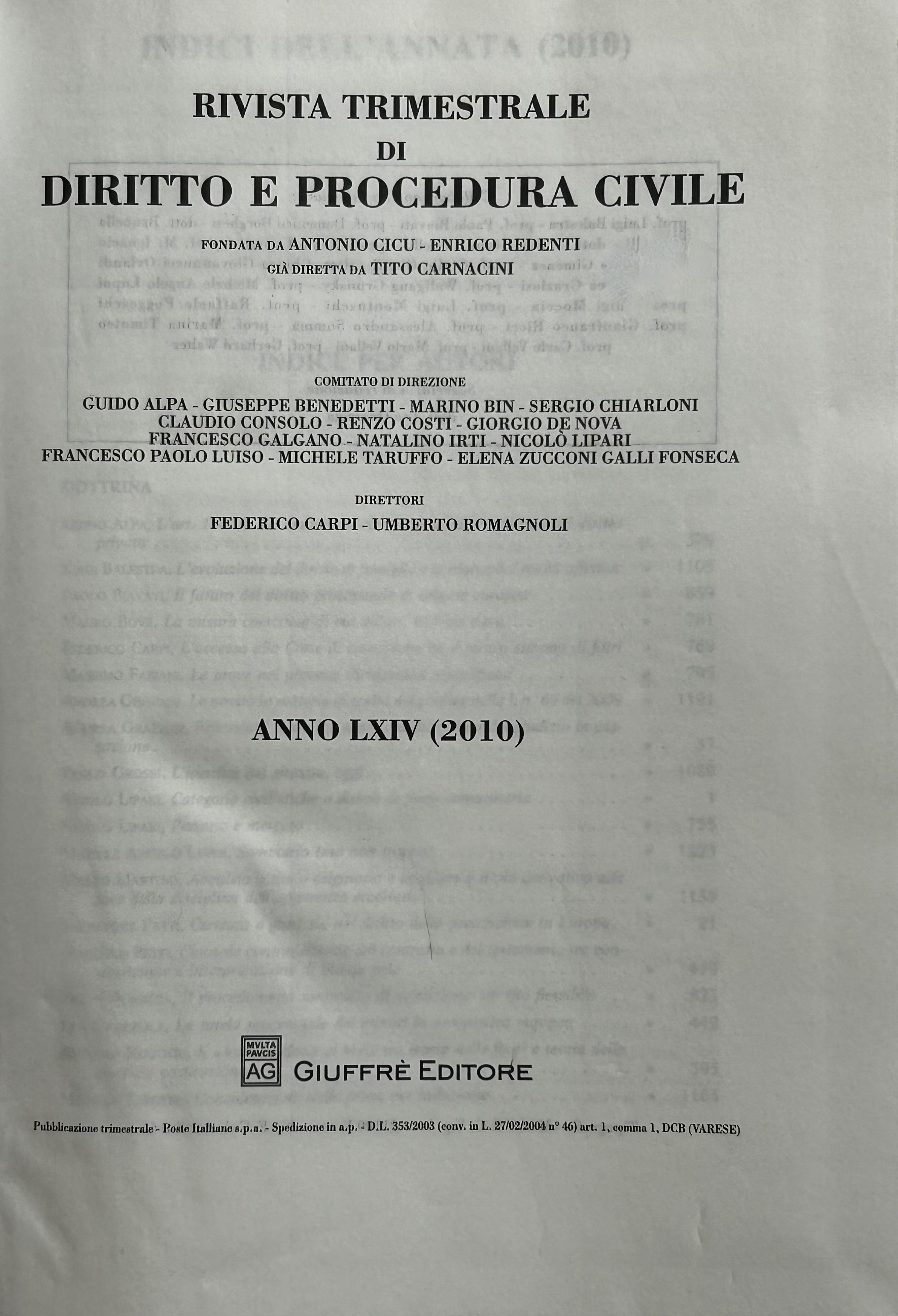 Rivista trimestrale di diritto e procedura civile. Fondata da: A. Cicu, E. Redenti e T. Carnacini. Diretta da: G. Alpa, G. Debenedetti, M. Bin, S. Chiarloni, C. Consolo, R. Costi, G. De Nova, F. Galgano, N. Irti, N. Lipari, F.P. Luiso, M. Taruffo. Anno LXIV - 2010