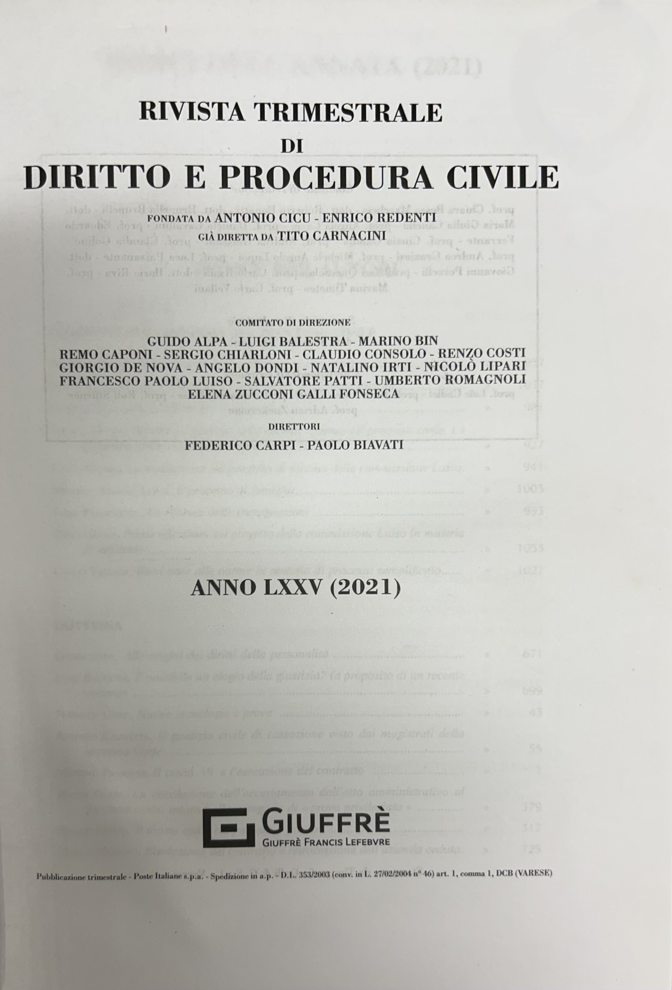 Rivista trimestrale di diritto e procedura civile. Fondata da: A. Cicu, E. Redenti e T. Carnacini. Diretta da: G. Alpa, L. Balestra, P. Biavati, M. Bin, R. Caponi, F. Carpi, S. Chiarloni, C. Consolo, R. Costi, G. De Nova, N. Irti, N. Lipari, F.P. Luiso, S. Patti, U. Romagnoli, M. Taruffo, E. Zucconi Galli Fonseca. Anno LXXV - 2021