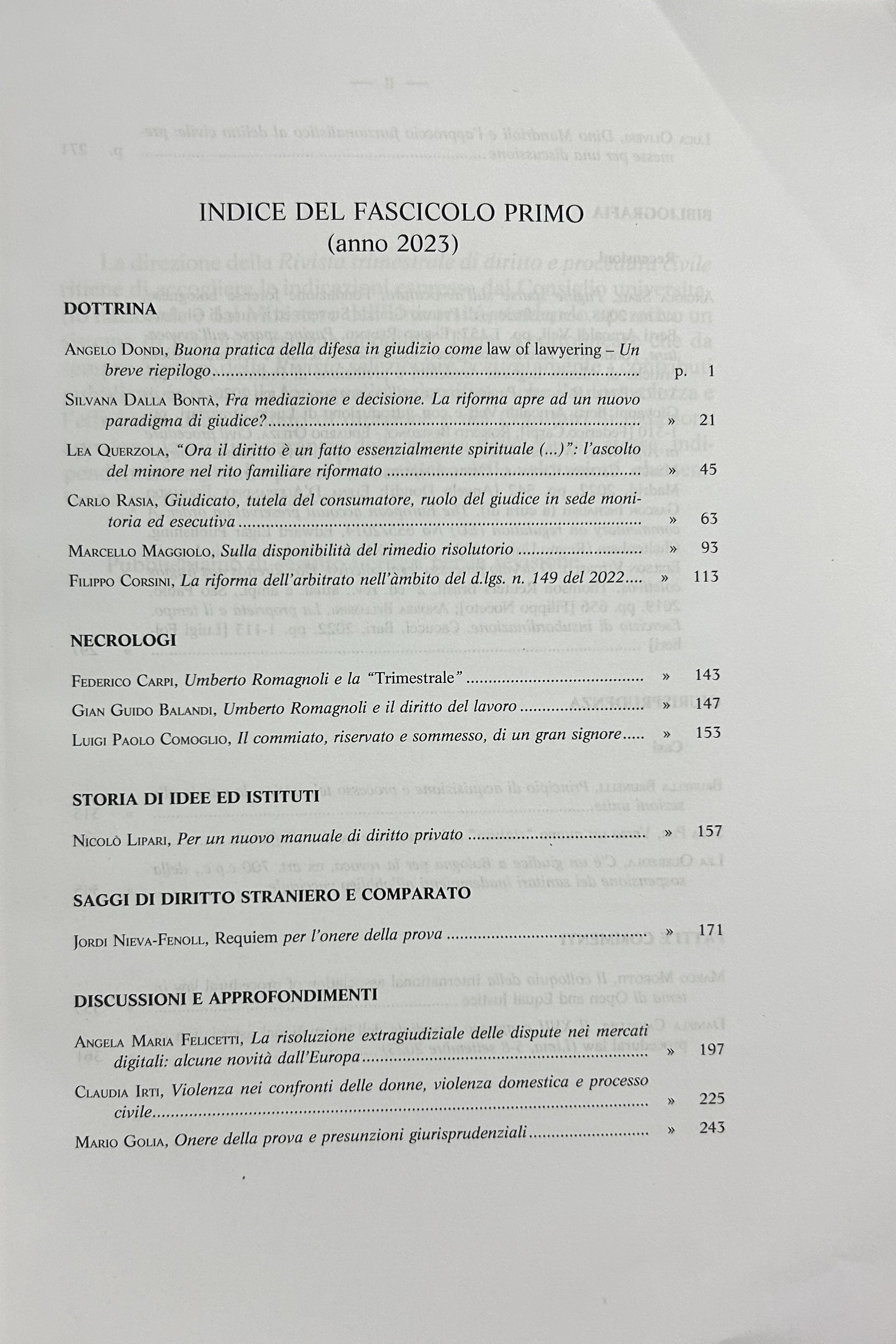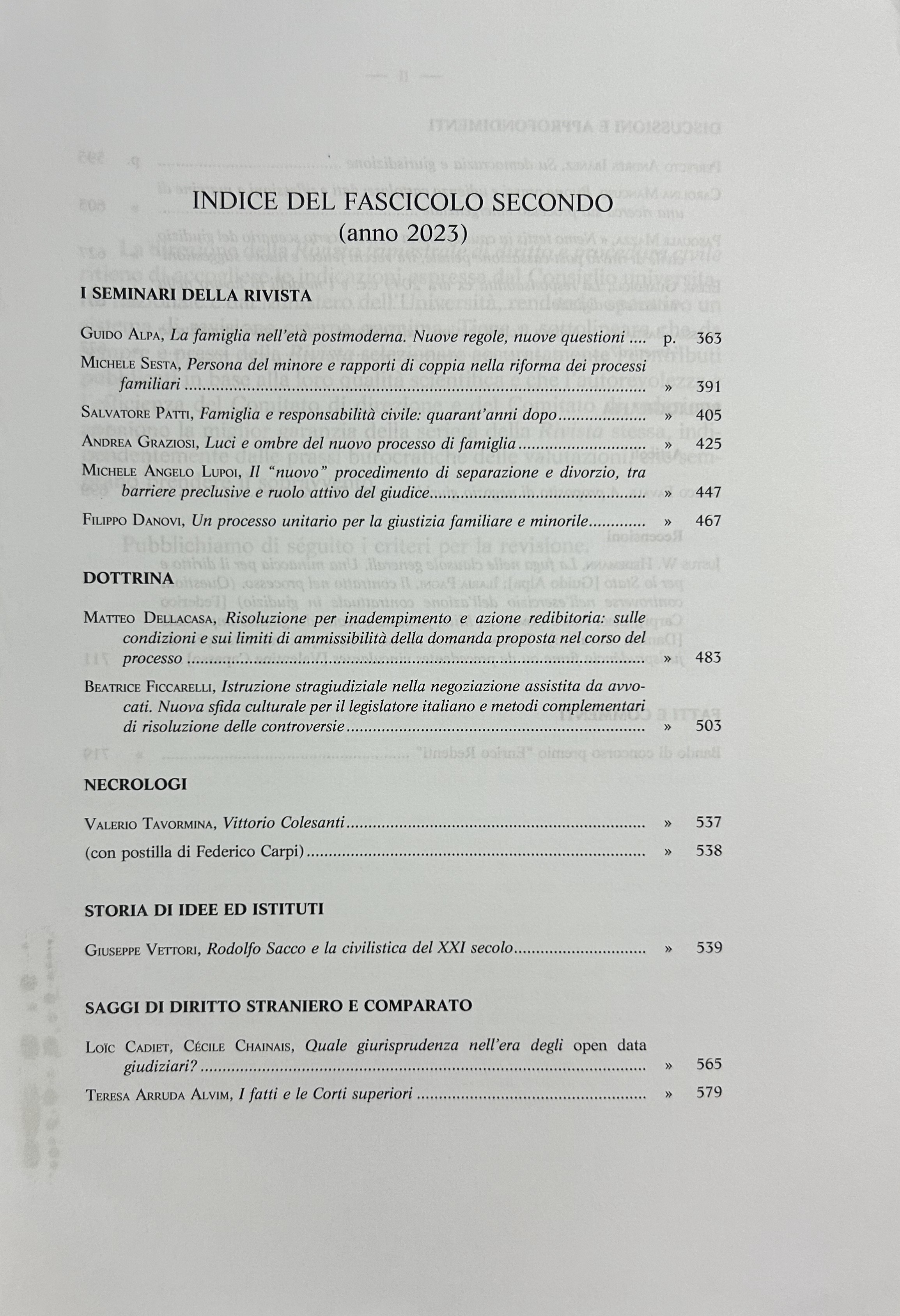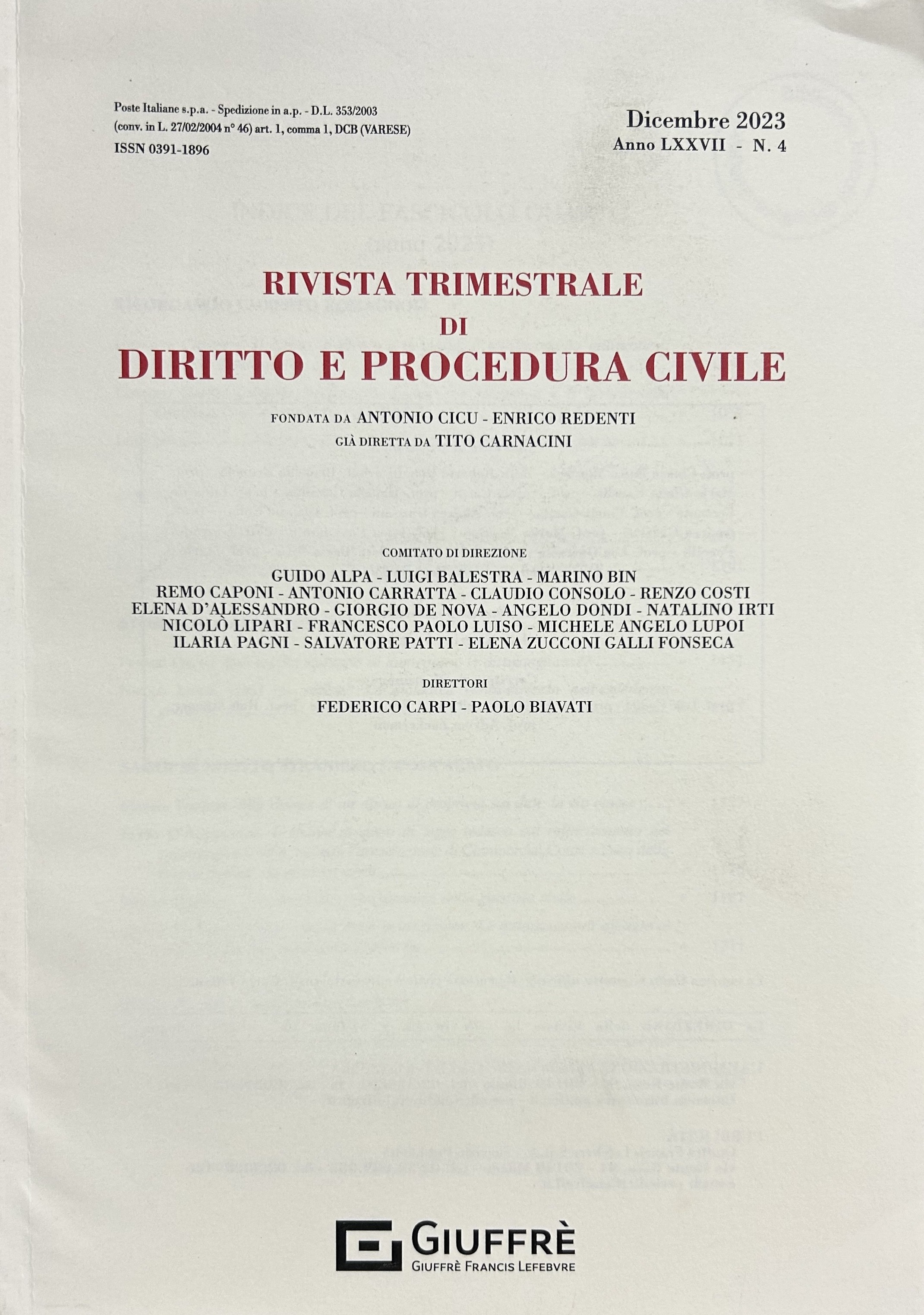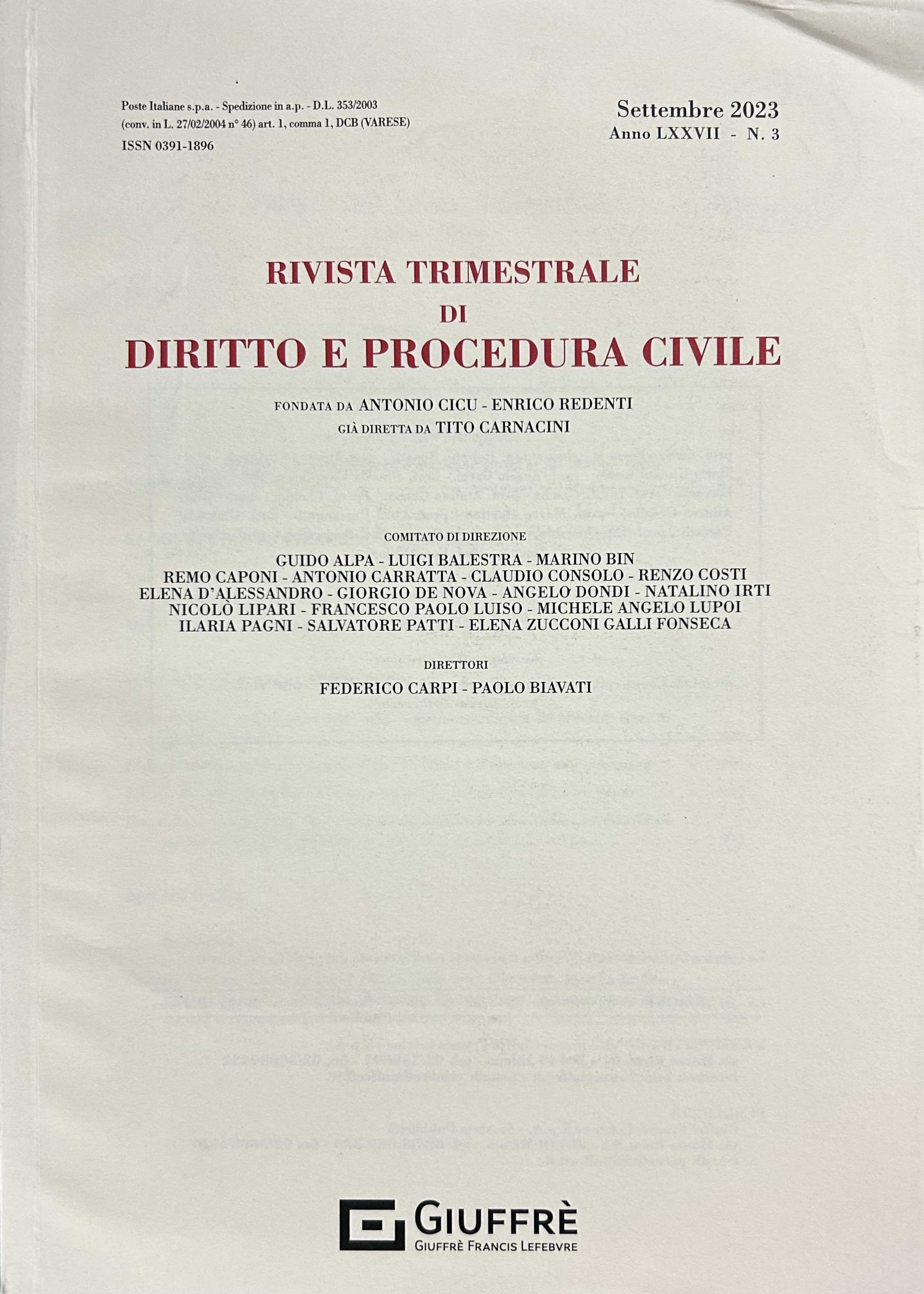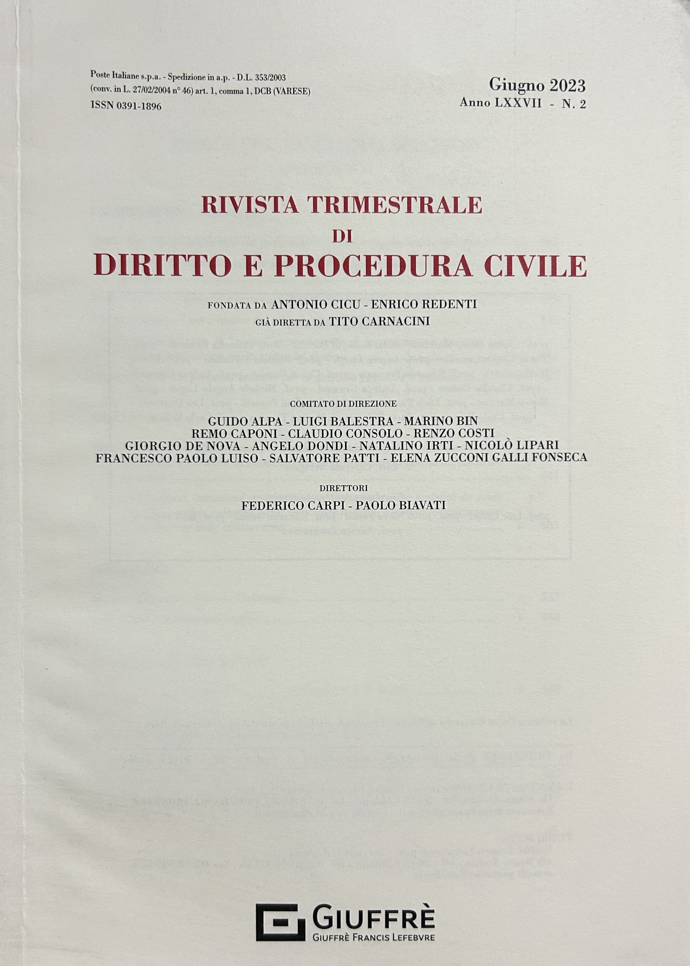 Rivista trimestrale di diritto e procedura civile. Fondata da: A. Cicu, E. Redenti e T. Carnacini. Diretta da: G. Alpa, L. Balestra, P. Biavati, M. Bin, R. Caponi, F. Carpi, S. Chiarloni, C. Consolo, R. Costi, G. De Nova, N. Irti, N. Lipari, F.P. Luiso, S. Patti, U. Romagnoli, M. Taruffo, E. Zucconi Galli Fonseca. Anno LXXVII - 2023