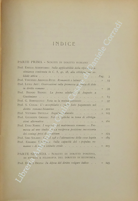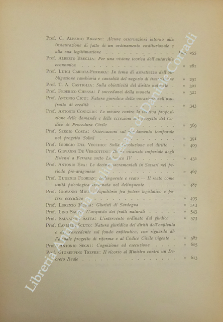 Scritti di: Albertario, V. Arangio-Ruiz, Aru, Besta, Biggini, Biondi, Bortolucci, Breglia, Cariota-Ferrara, Castiglia, Chessa, Cicu, Coniglio, Costa, Cugia, De Vergottini, G. Del Vecchio, Devilla, Era, Florian, G. Grosso, Miele, Mossa, Nardi, Salis, Satta, Scuto, Segni, Solazzi, Treves, Volterra.