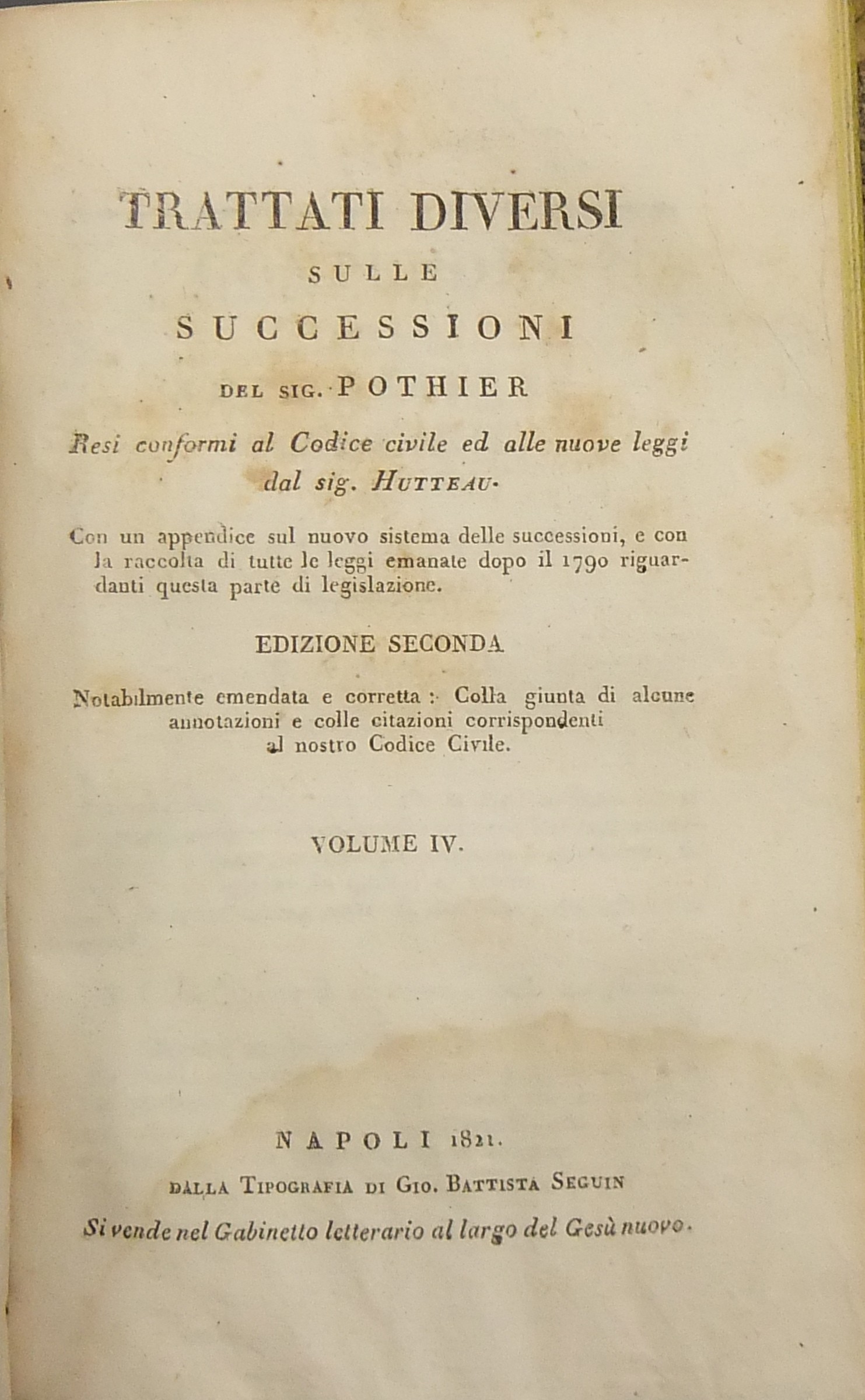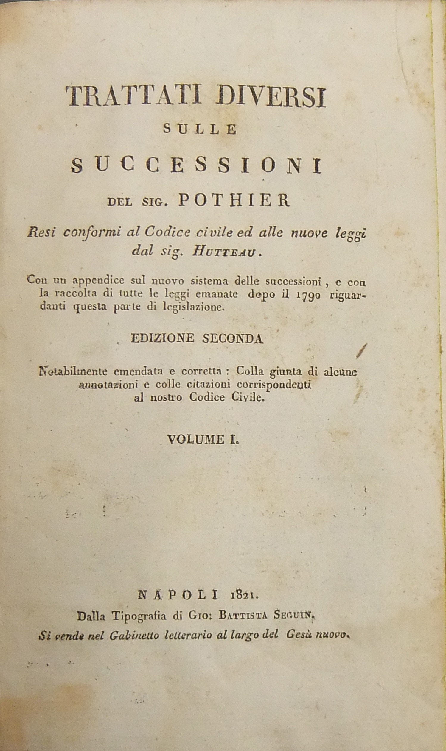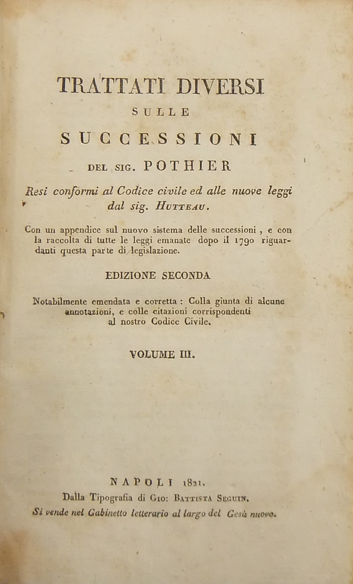 Trattati diversi sulle successioni. Resi conformi al Codice civile ed alle nuove leggi dal sig. Hutteau. Con un'appendice sul nuovo sistema delle successioni e con la raccolta di tutte le leggi emanate dopo il 1790 riguardanti questa parte di legislazione