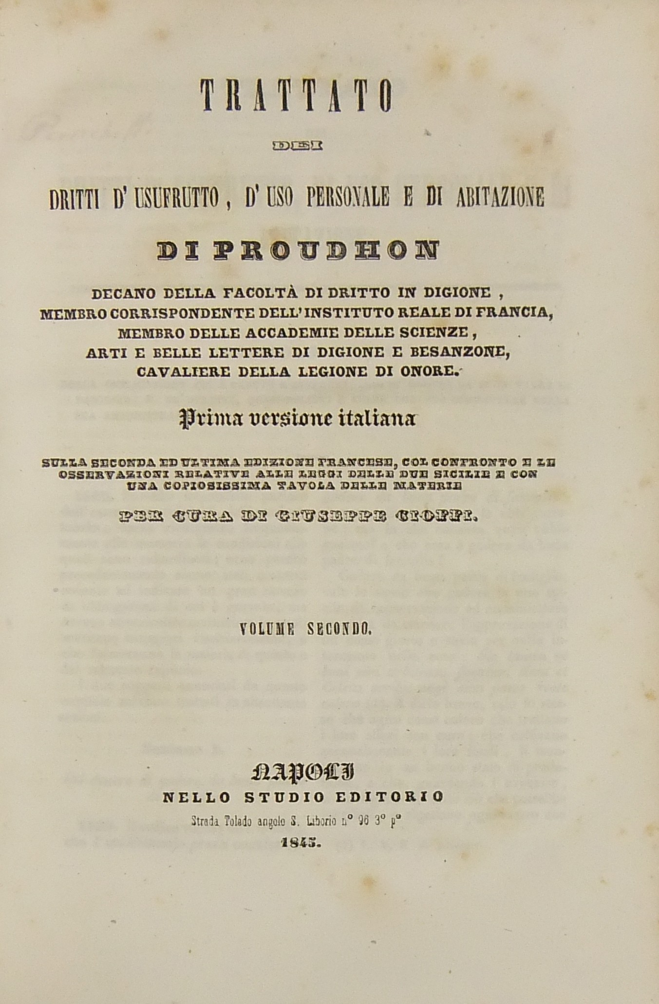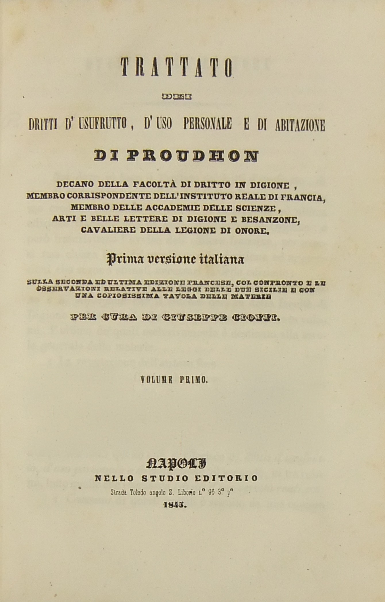Trattato dei dritti d'usufrutto, d'uso personale e di abitazione. Prima versione italiana sulla seconda ed ultima edizione francese col confronto e le osservazioni relative alle leggi delle Due Sicilie e con una copiosissima tavola delle materie. Per cura di Giuseppe Cioffi