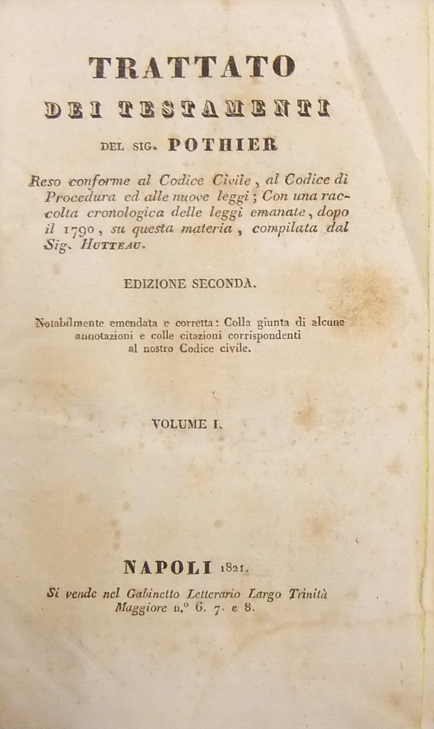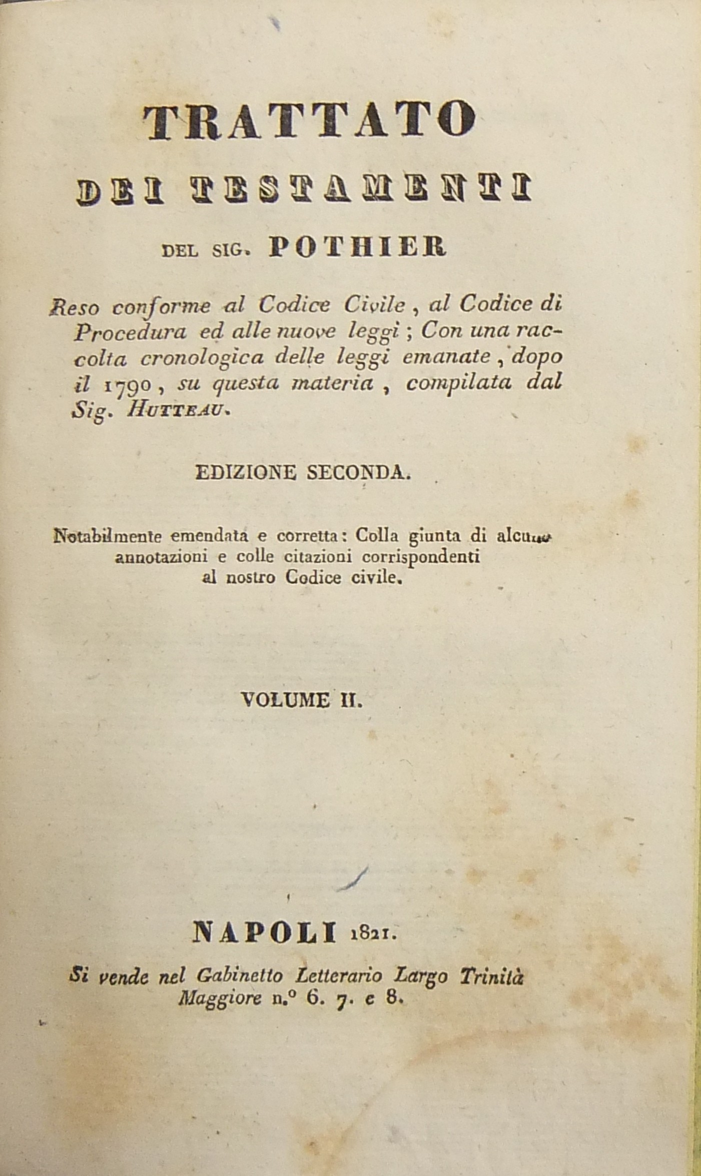 Trattato dei testamenti. Reso conforme al Codice civile, al Codice di Procedura ed alle nuove leggi; Con una raccolta cronologica delle leggi emanate, dopo il 1790, su questa materia, compilata dal Sig. Hutteau