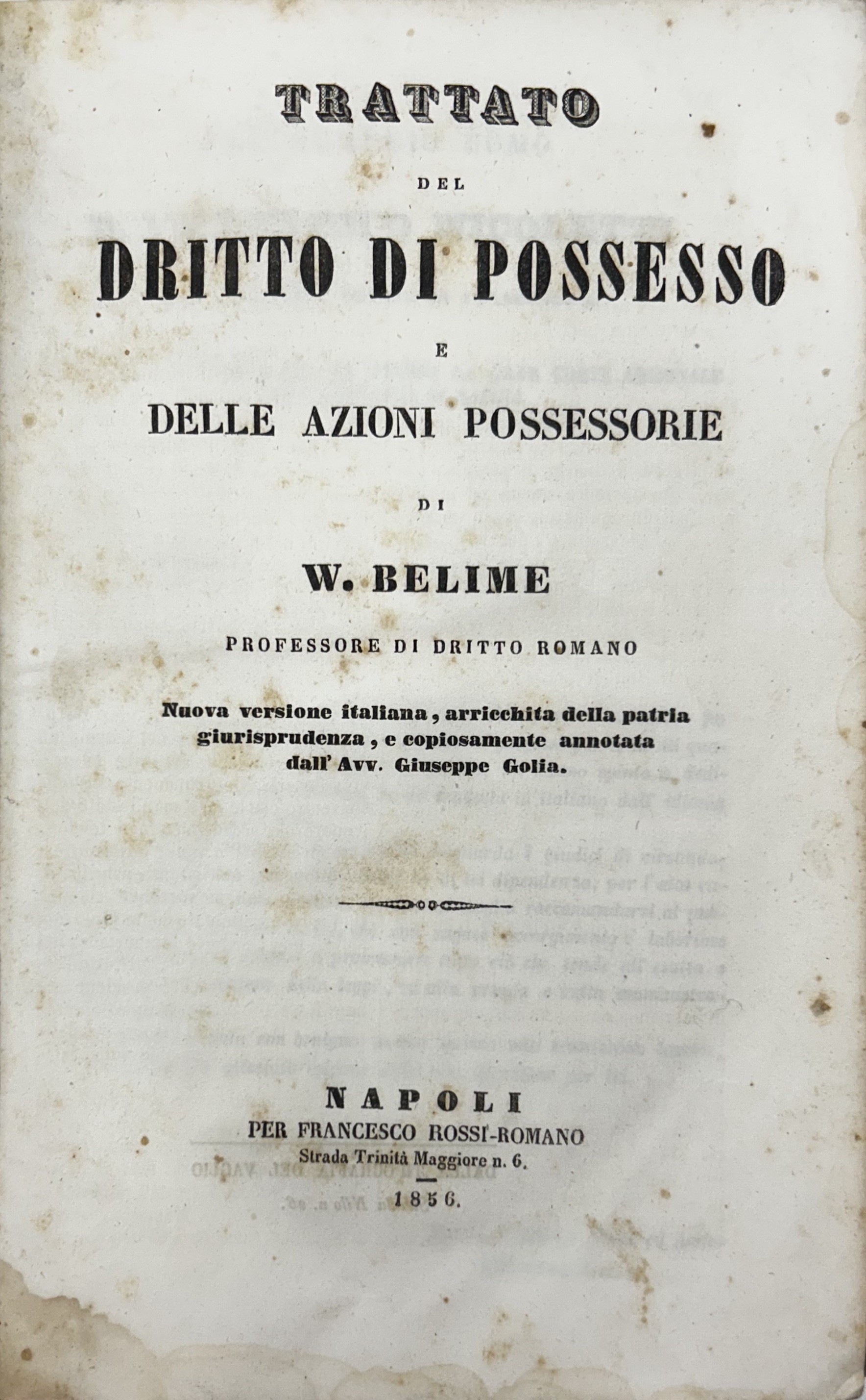 Trattato del diritto di possesso e delle azioni possessorie. Nuova versione italiana, arricchita della patria giurisprudenza, e copiosamente annotata dall'Avv. Giuseppe Golia