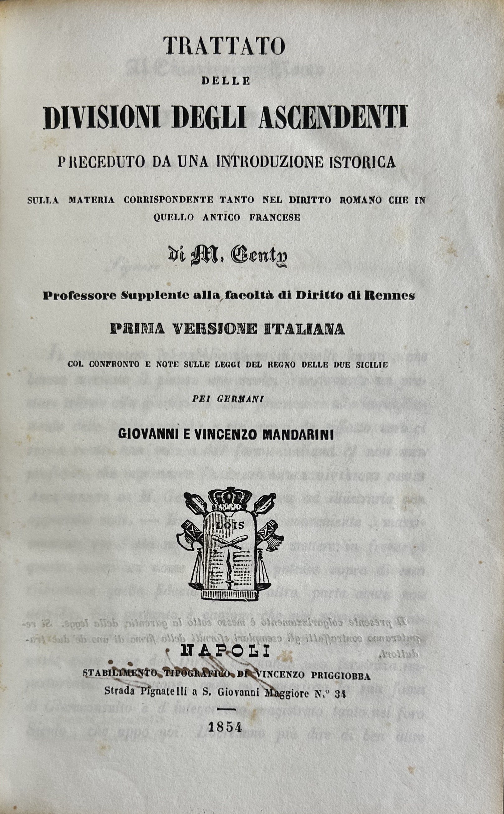 Trattato delle divisioni degli ascendenti. Preceduto da una introduzione istorica sulla materia corrispondente tanto nel diritto romano che in quello antico francese. Prima versione italiana col confronto e note sulle Leggi del Regno delle Due Sicilie pei germani Giovanni e Vincenzo Mandarini