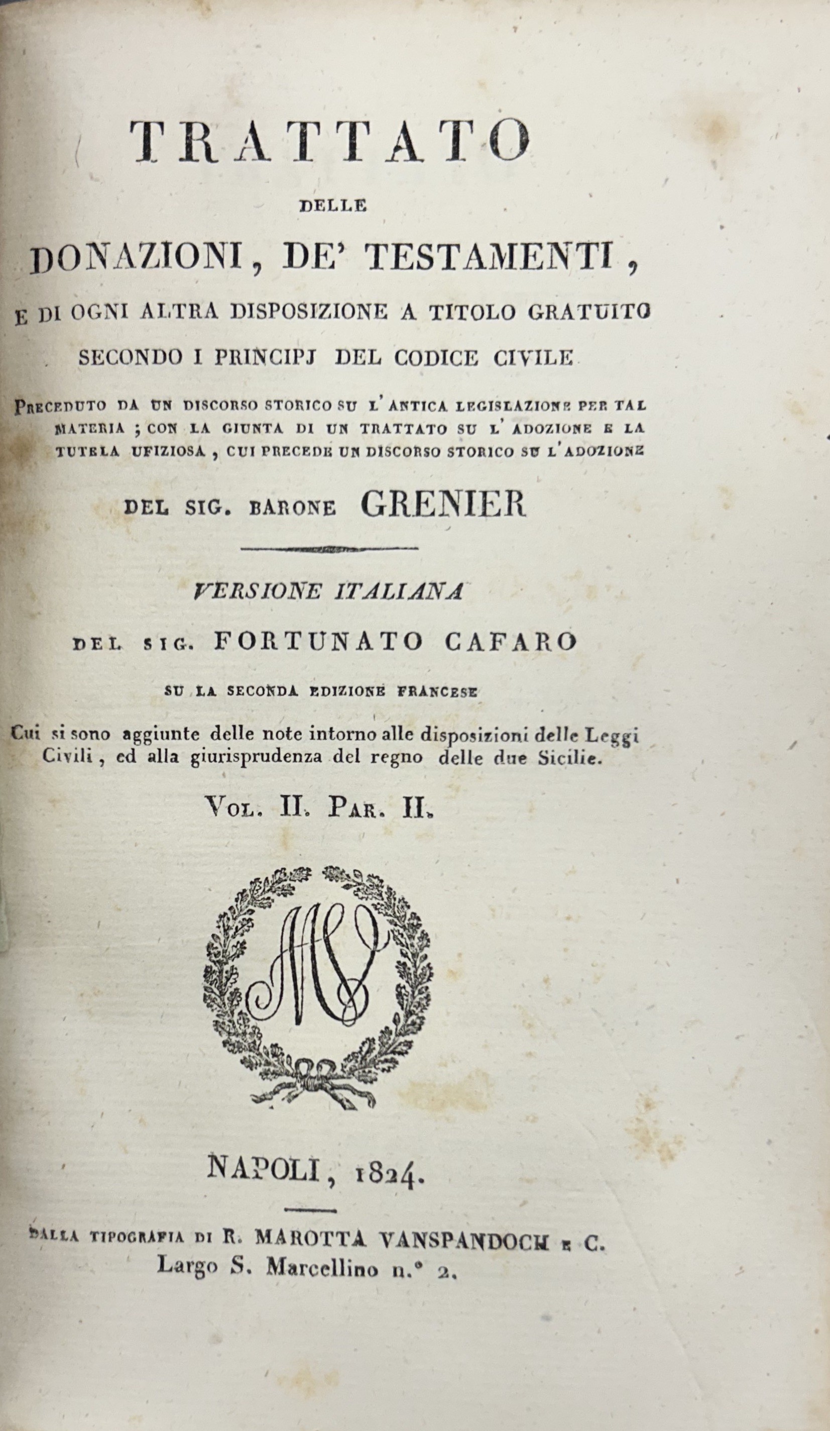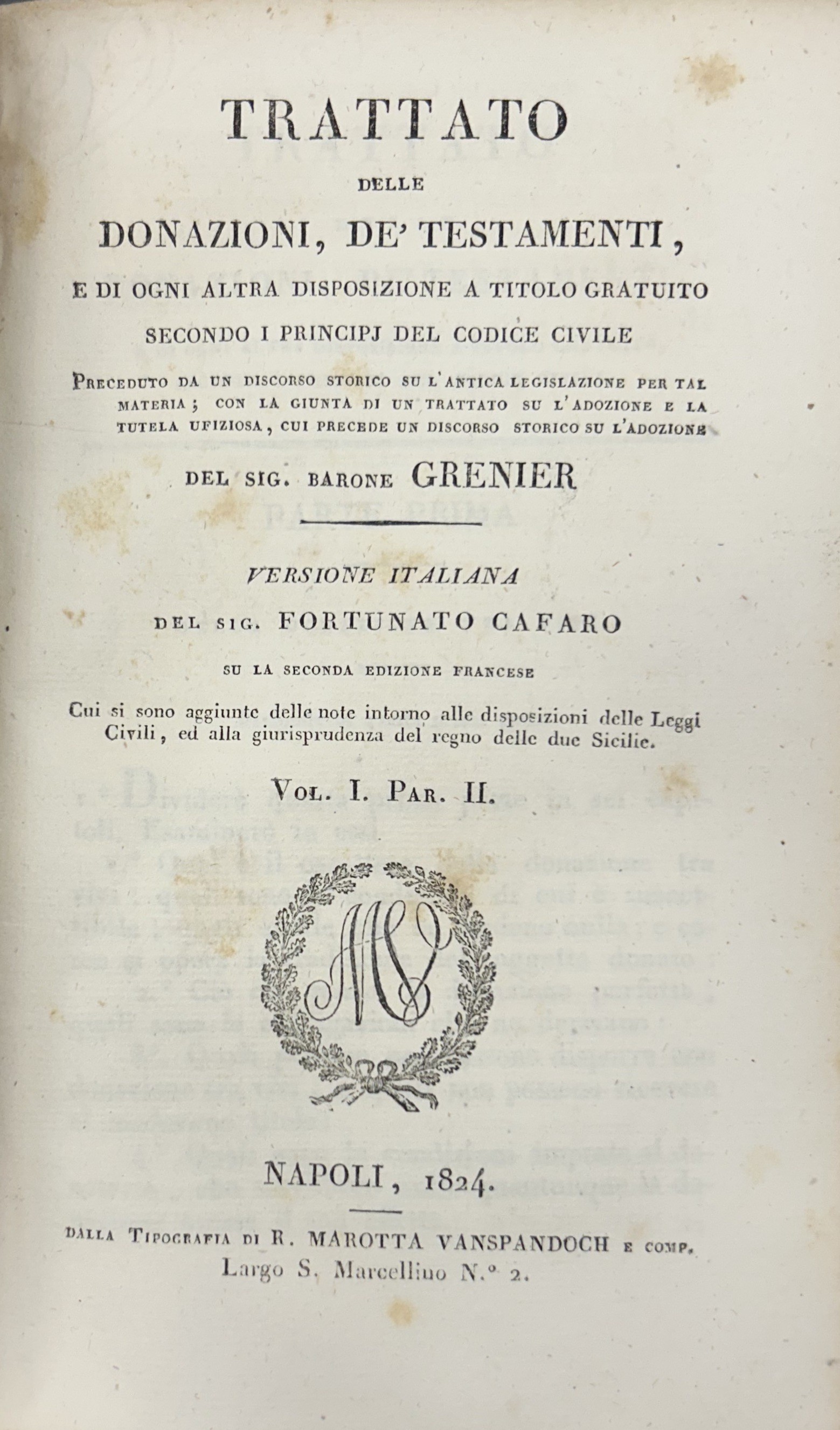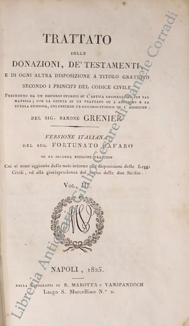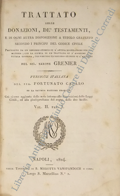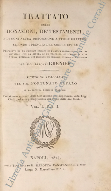 Trattato delle donazioni, de' testamenti, e di ogni altra disposizione a titolo gratuito secondo i principj del codice civile... Versione italiana del Sig. Fortunato Cafaro su la seconda edizione francese