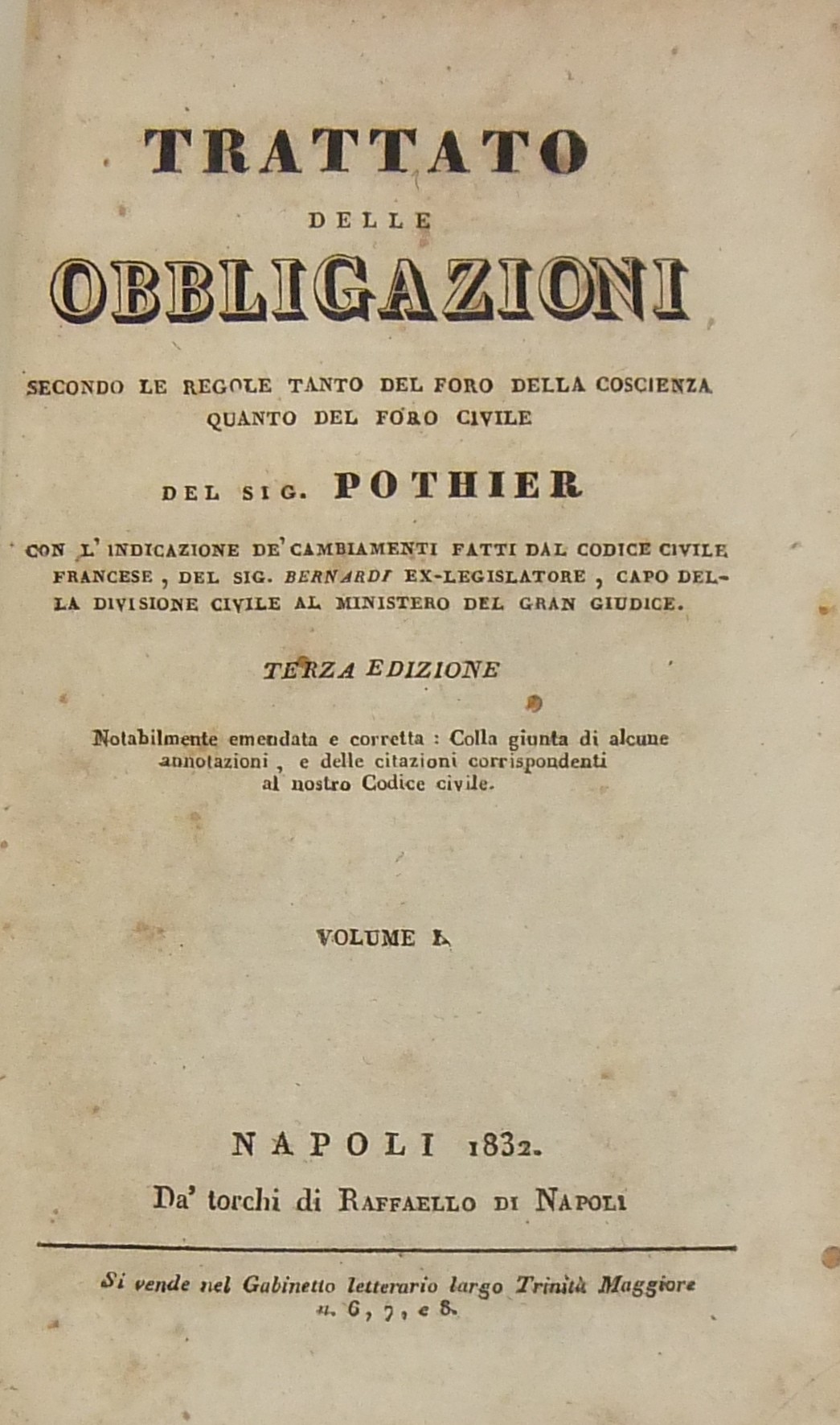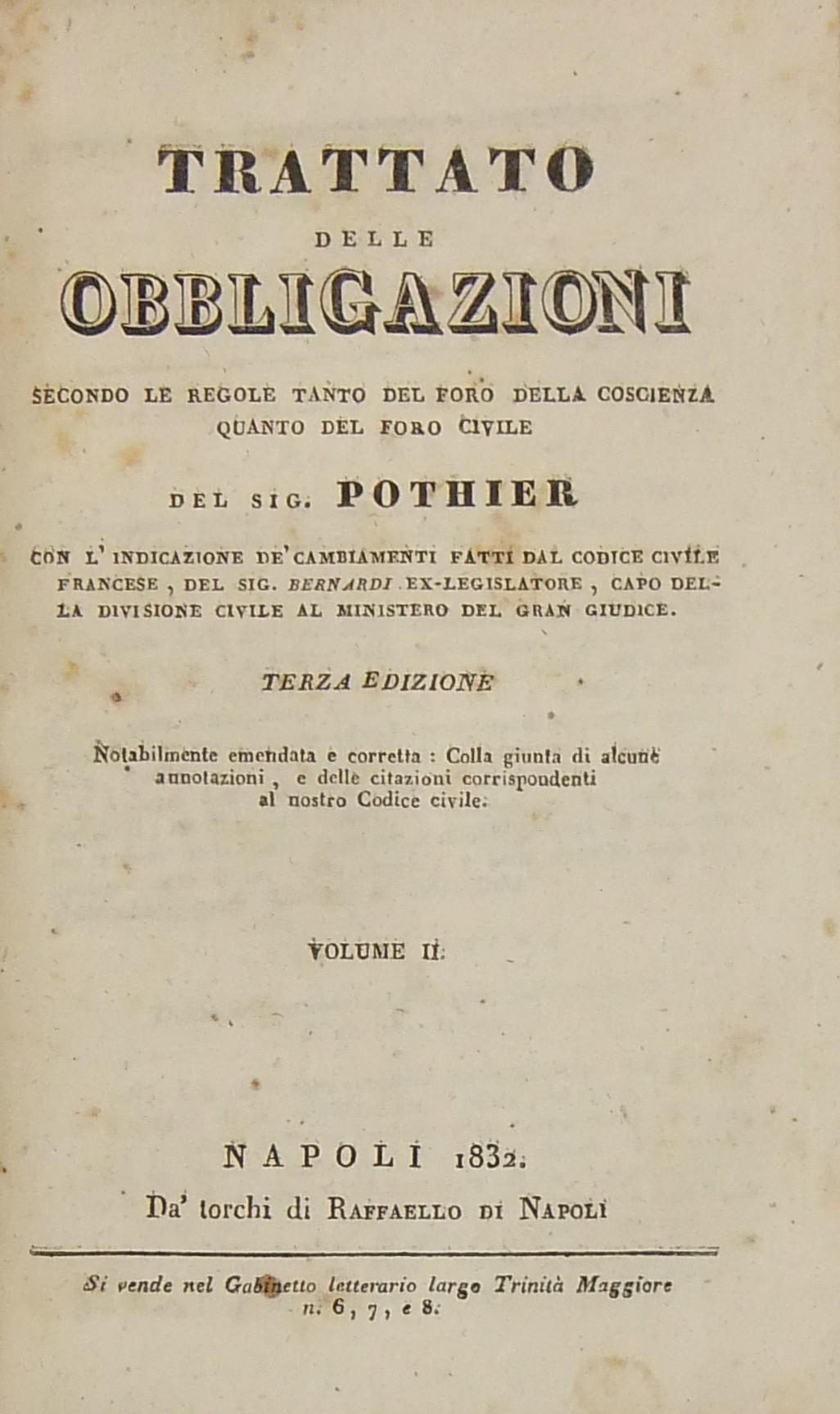 Trattato delle obbligazioni secondo le regole tanto del foro della coscienza quanto del foro civile. Con l'indicazione de' cambiamenti fatti dal Codice civile francese, del Sig. Bernardi ex-legislatore, capo della divisione civile al Ministero del Gran Giudice
