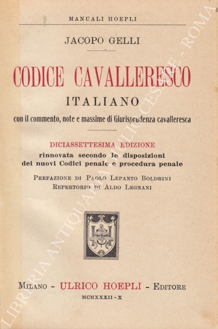 Diciassettesima edizione rinnovata secondo le disposizioni dei nuovi Codici penale e procedura penale. Prefazione di Paolo Lepanto Boldrini. Repertorio di Aldo LegnaniÂ