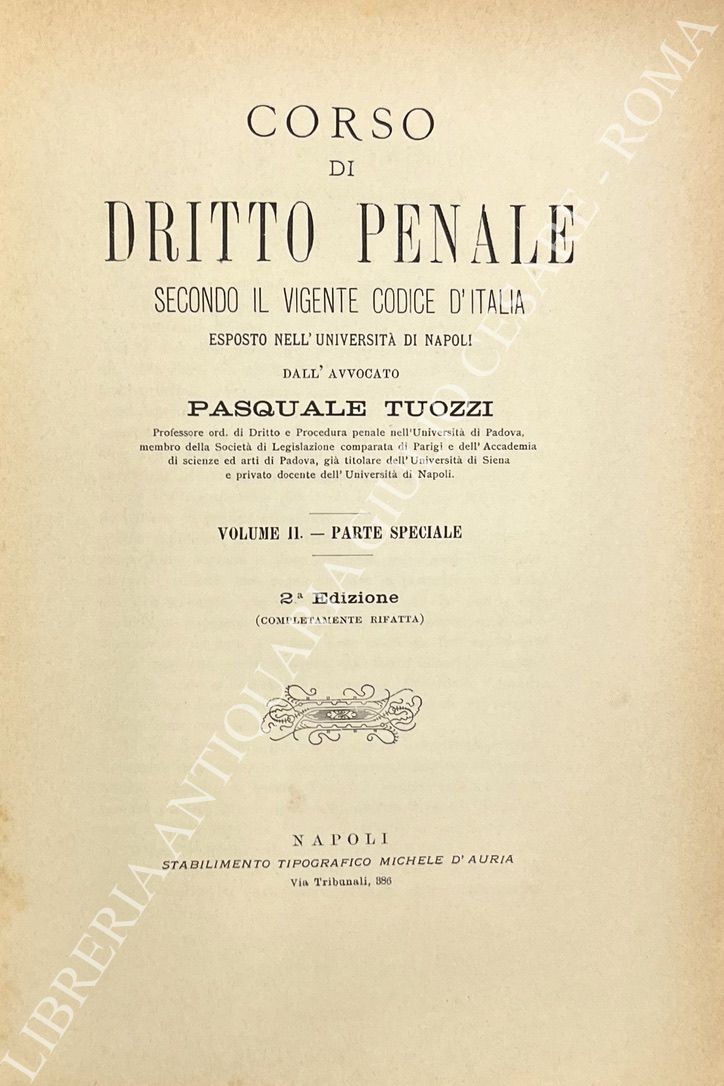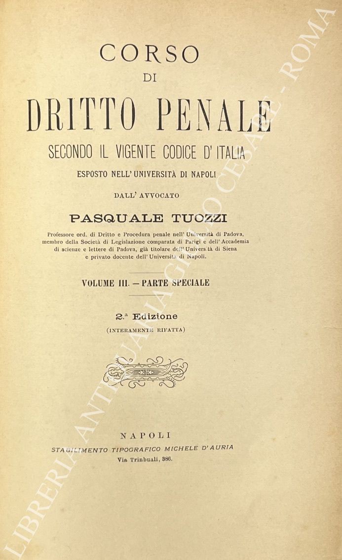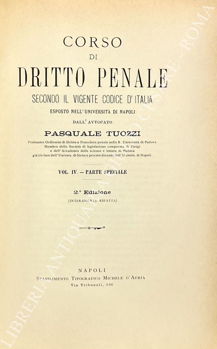 Corso di dritto penale secondo il vigente codice d'Italia esposto nell'Università di Napoli. Vol. I - Parte generale; Vol. II, III e IV - Parte speciale