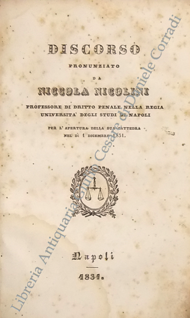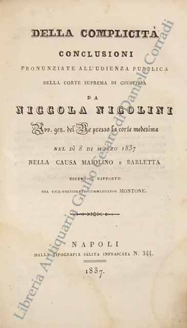Del tentativo. Trattato. UNITO A: Discorso pronunziato da... Napoli, 1831, pp. 28. UNITO A: Della complicità . Conclusioni pronunziate all'udienza pubblica della Corte Suprema di Giustizia... Napoli, 1837, pp. 28