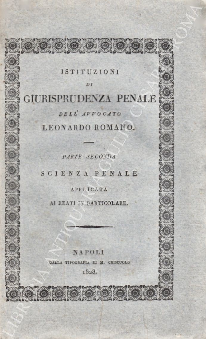 Istituzioni di giurisprudenza penale dell'avvocato Leonardo Romano. Parte prima - Scienza penale; Parte seconda - Scienza penale applicata ai reati in particolare