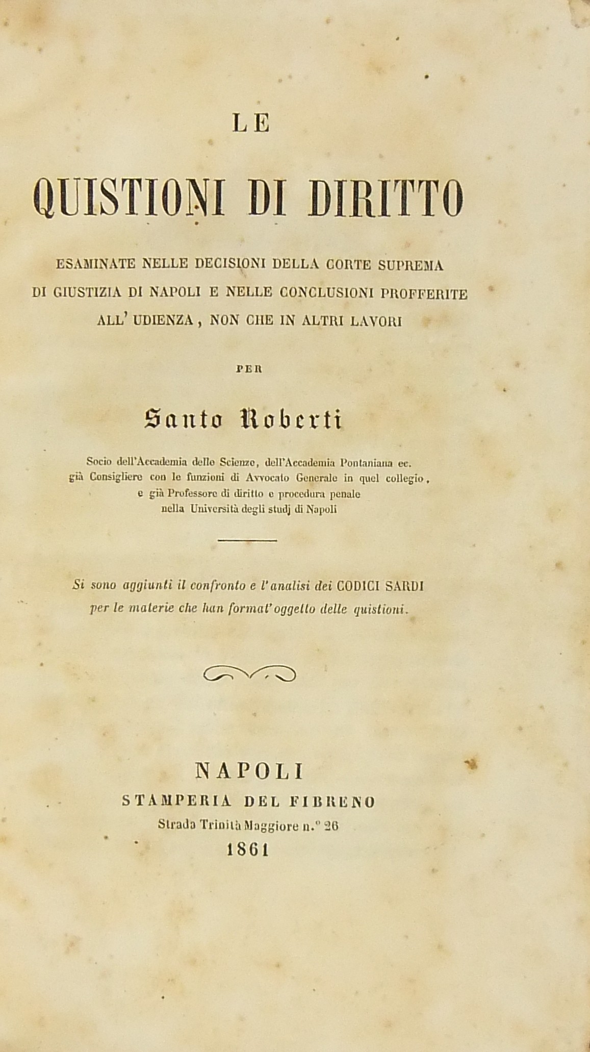 Le quistioni di diritto esaminate nelle decisioni della Corte Suprema di Giustizia di Napoli e nelle conclusioni profferite all'udienza non che in altri lavori.. Si sono aggiunti il confronto e l'analisi dei Codici Sardi per le materie che han format'oggetto delle quistioni