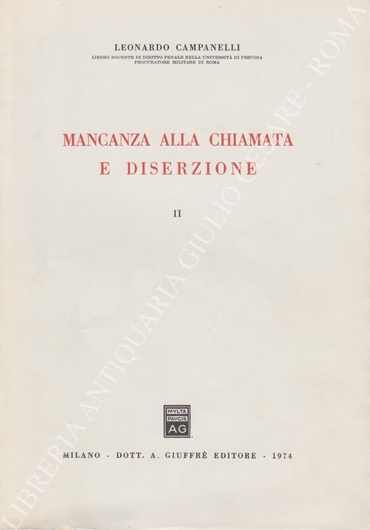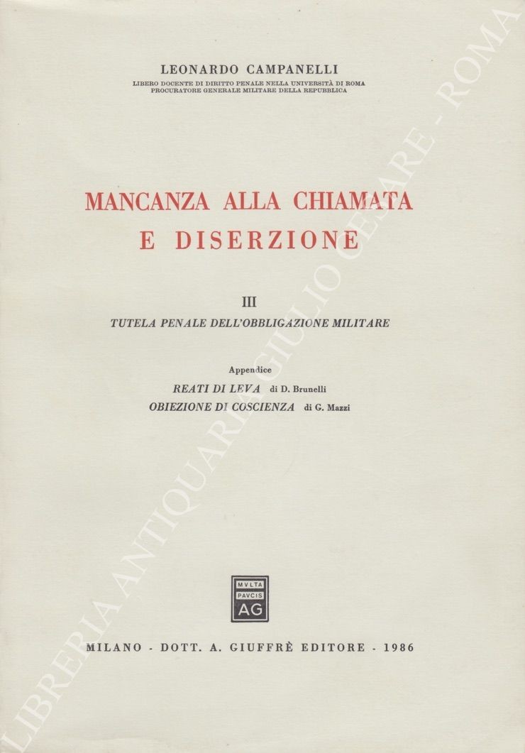 Mancanza alla chiamata e diserzione. Vol. I - Reati di mancanza alla chiamata; Vol. II - Reati di mancanza alla chiamata (Parte Terza), Reati di diserzione; Vol. III - Tutela penale dell'obbligazione militare. Appendice: Reati di leva (di D. Brunelli), Obiezione di coscienza (di G. Mazzi)