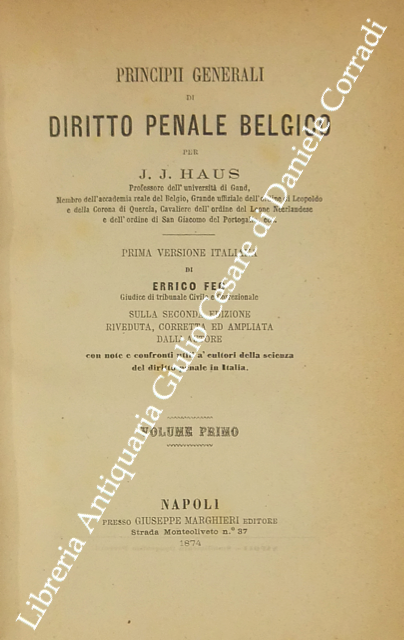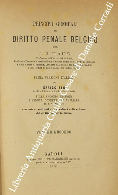 Principii generali di diritto penale belgico. Prima versione italiana di Enrico Feo sulla seconda edizione riveduta corretta ed ampliata dall'Autore con note e confronti utili a' cultori della scienza del diritto penale in Italia