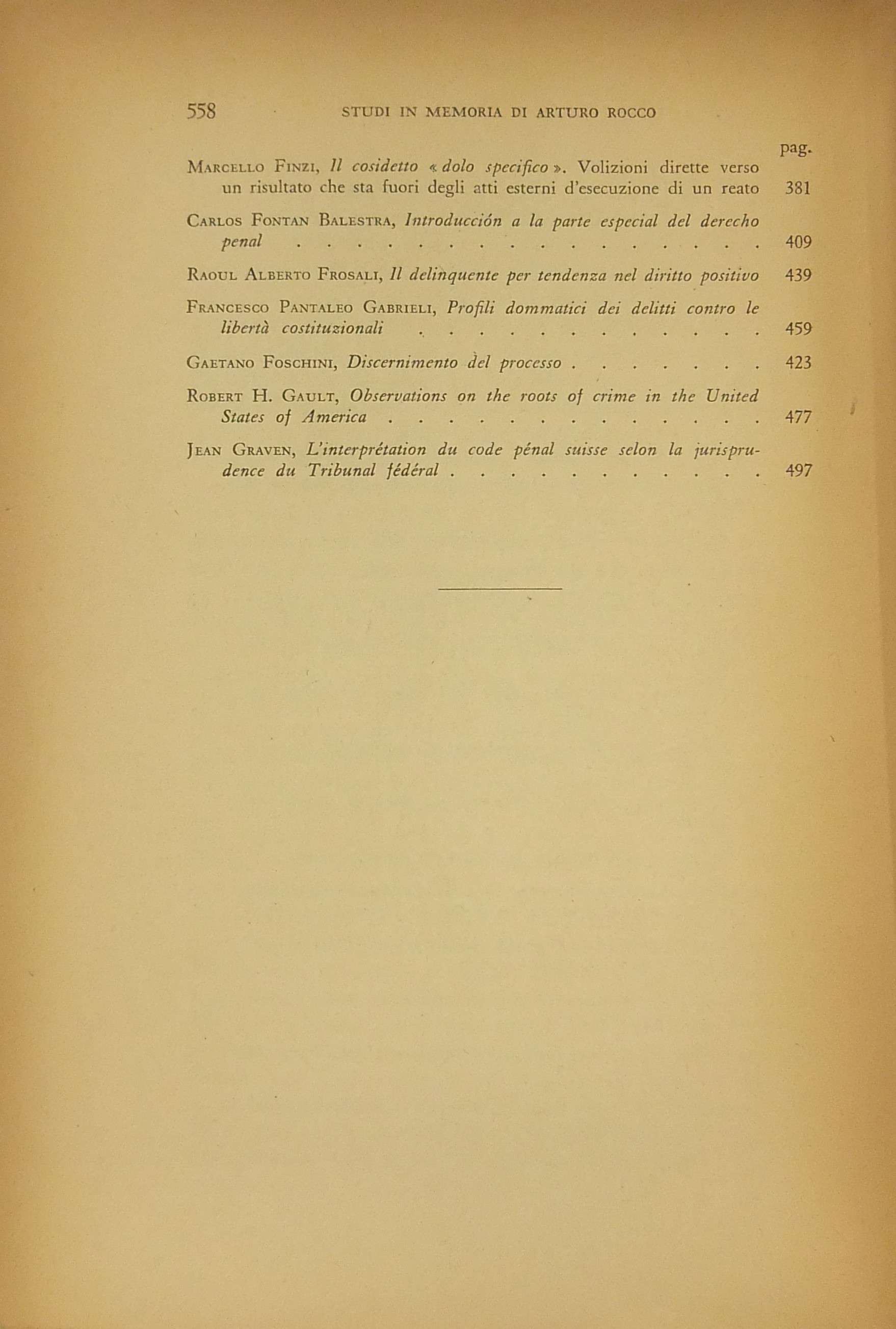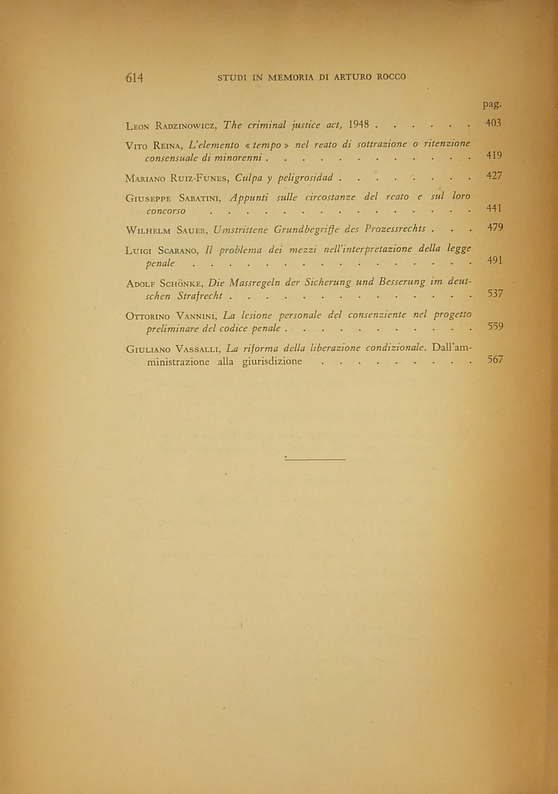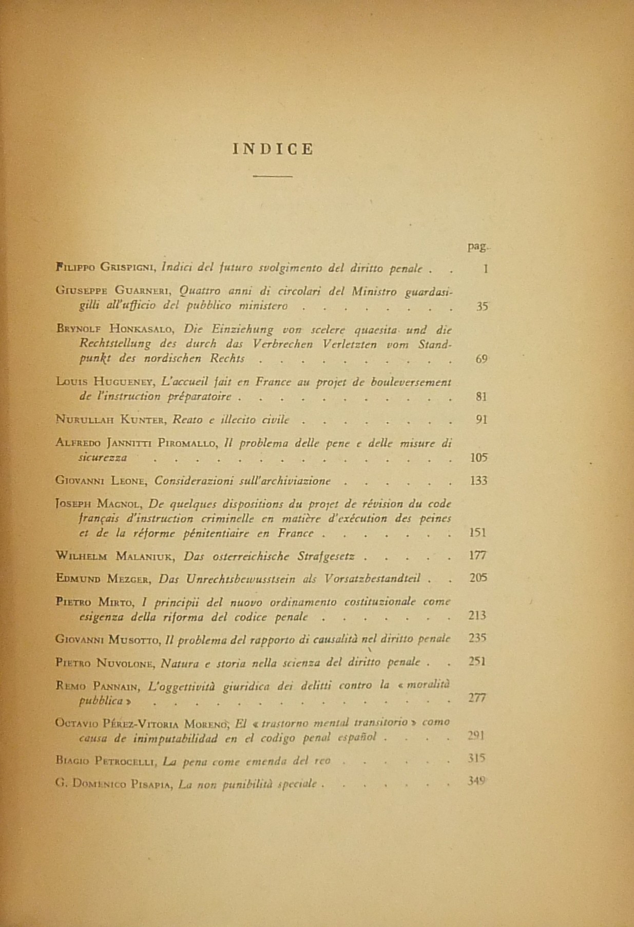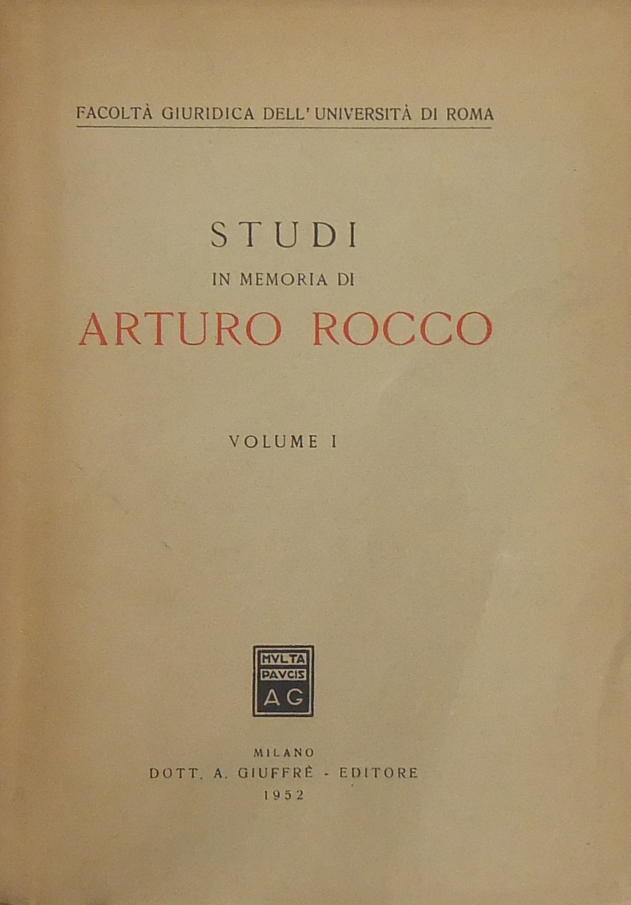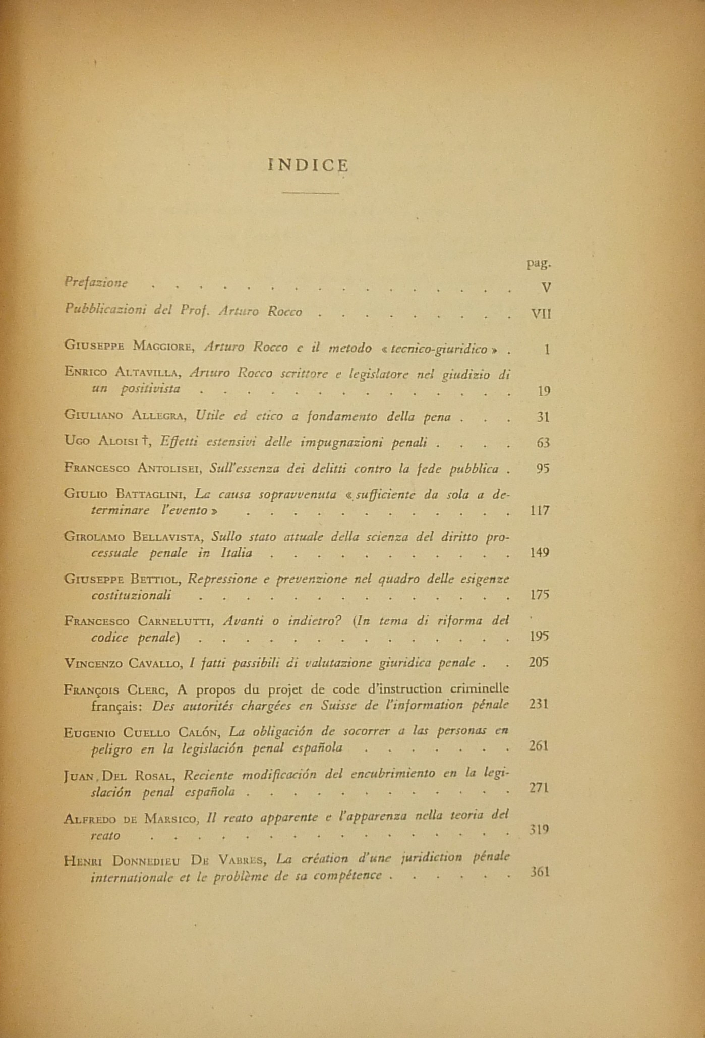 Ritratto fotografico di Arturo Rocco ad inizio volume. Scritti di: Allegra, ,Aloisi, Antolisei, Altavilla, Battaglini, Bellavista, Bettiol, Carnelutti, Cavallo, Clerc, Cuello Calon, De Marsico, Del Rosal, Donnedieu, De Vabres, Finzi, Fontan Balestra, G.Foschini, Frosali, Gabrieli, Gault, Graven, Grispigni, Guarneri, Honkasalo, Hugueney, Kunter, A.Jannitti Piromallo, G. Leone, Maggiore, Magnol, Malaniuk, Mezger, Mirto, Musotto, Nuvolone, Pannain, Perez Vitoria Moreno, Petrocelli, Pisapia, Radzinowicz, Reina, Ruiz Funes, Sabatini, Sauer, Scarano, Schonke, Vannini, G.Vassalli.