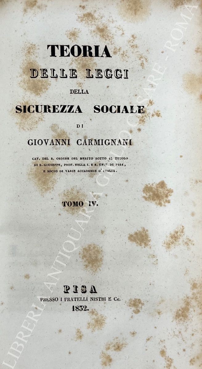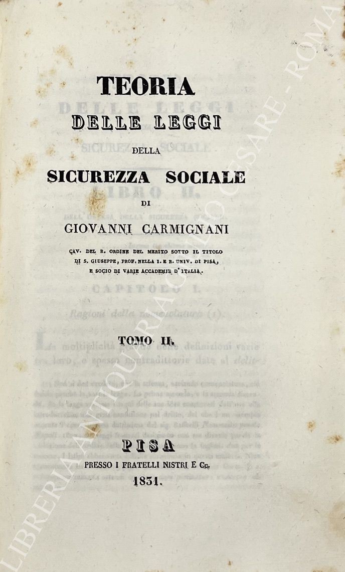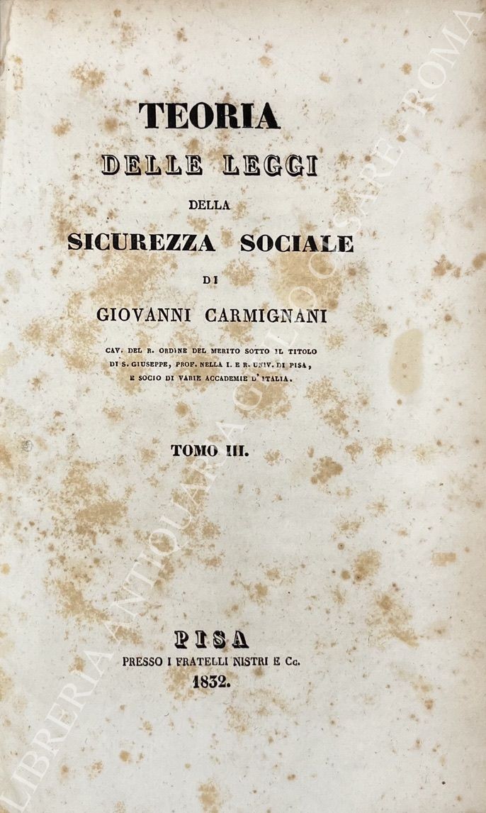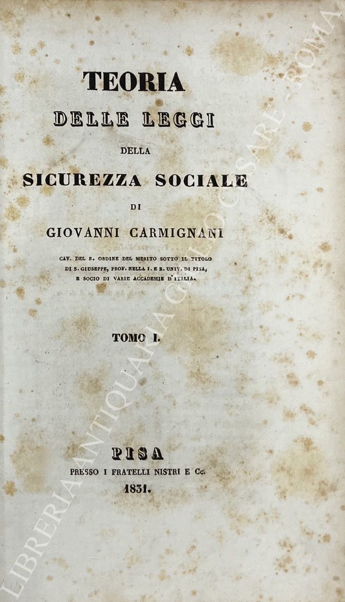 Prima edizione della più rappresentativa delle opere del Carmignani. Avanzatissima per il tempo la sua concezione della prevenzione sociale.