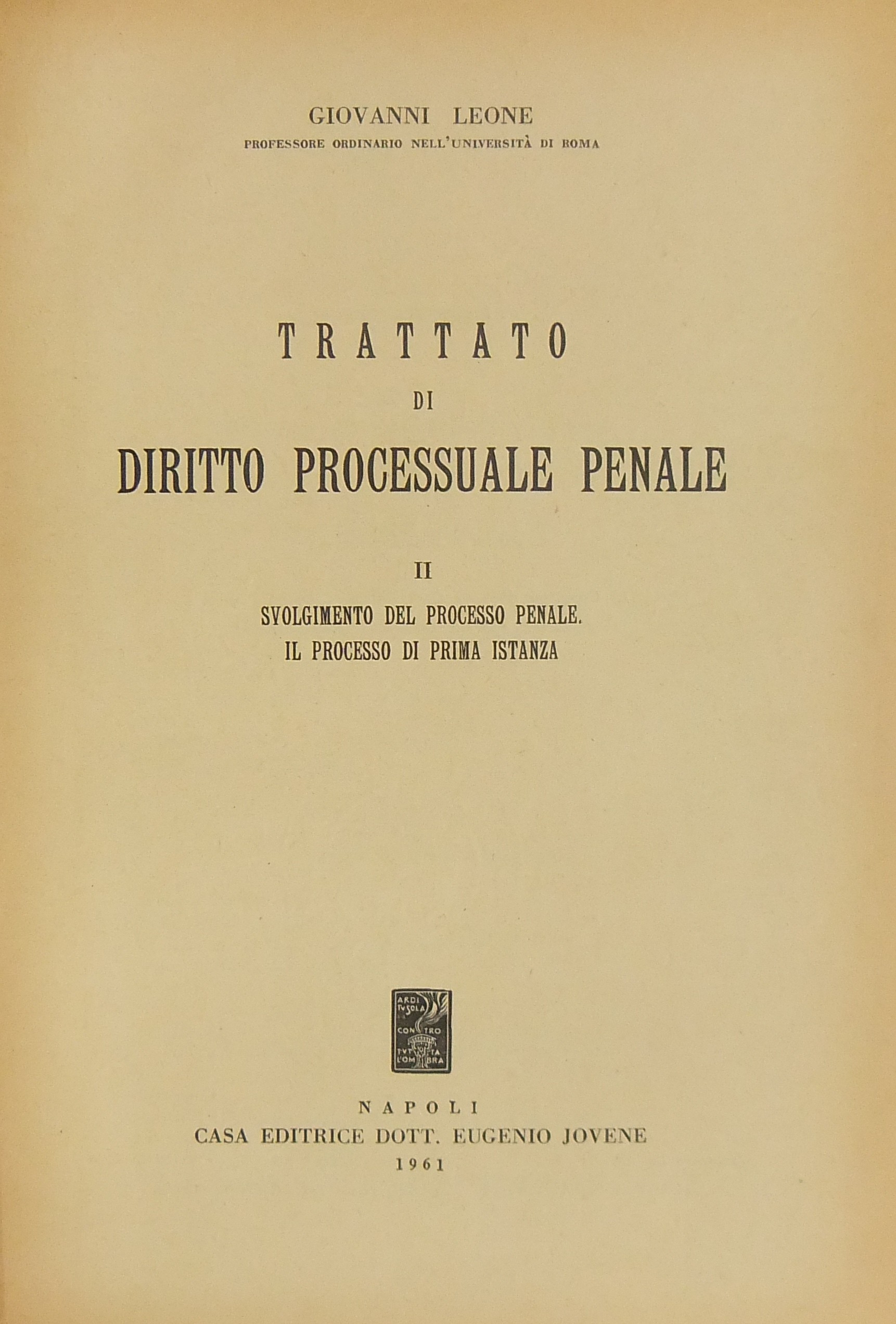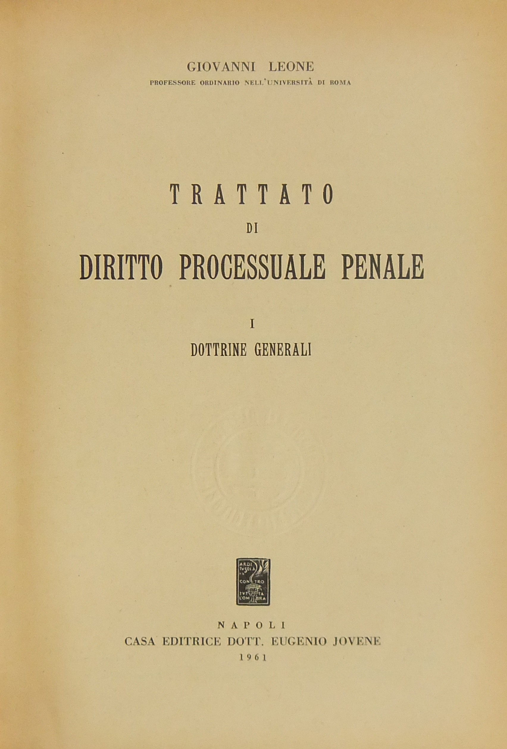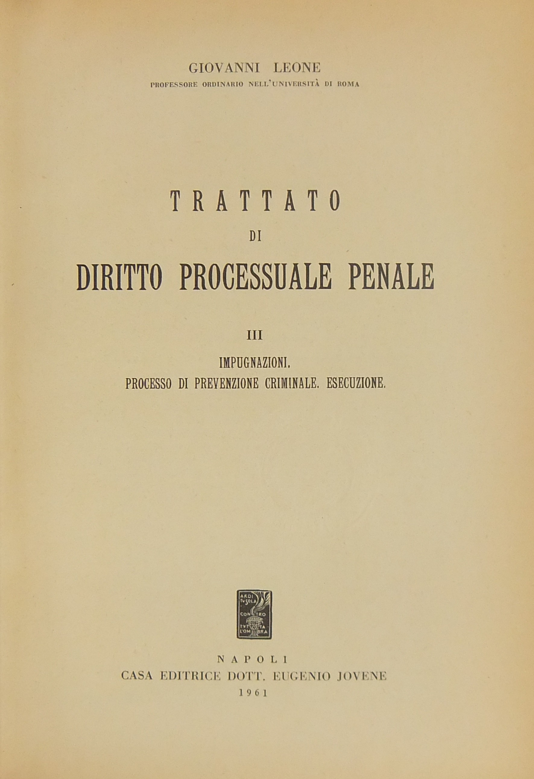 Trattato di diritto processuale penale. Vol. I - Dottrine generali. Vol. II - Svolgimento del processo penale. Il processo di prima istanza. Vol. III - Impugnazioni. Processo di prevenzione criminale. Esecuzione