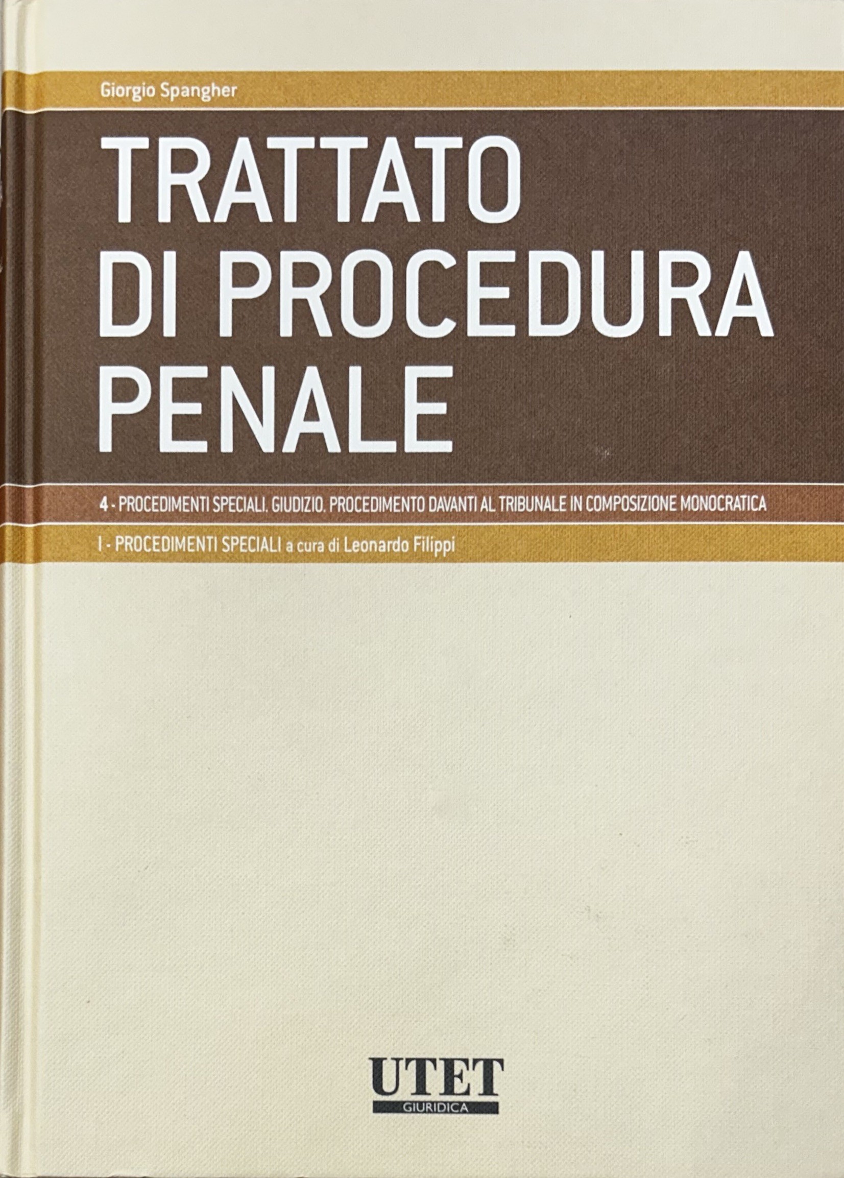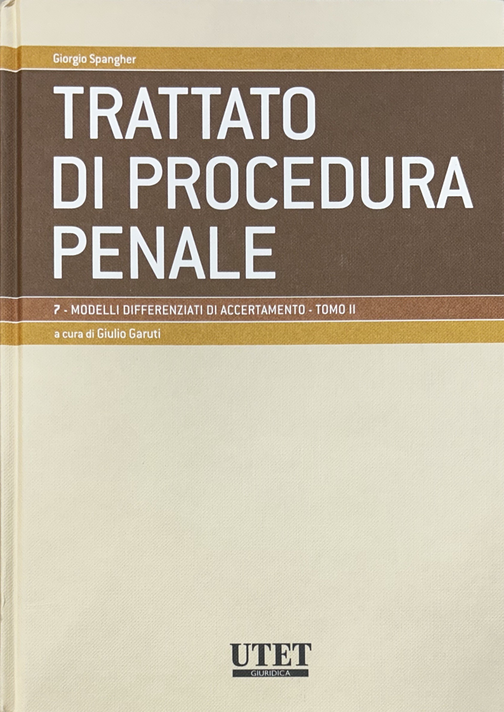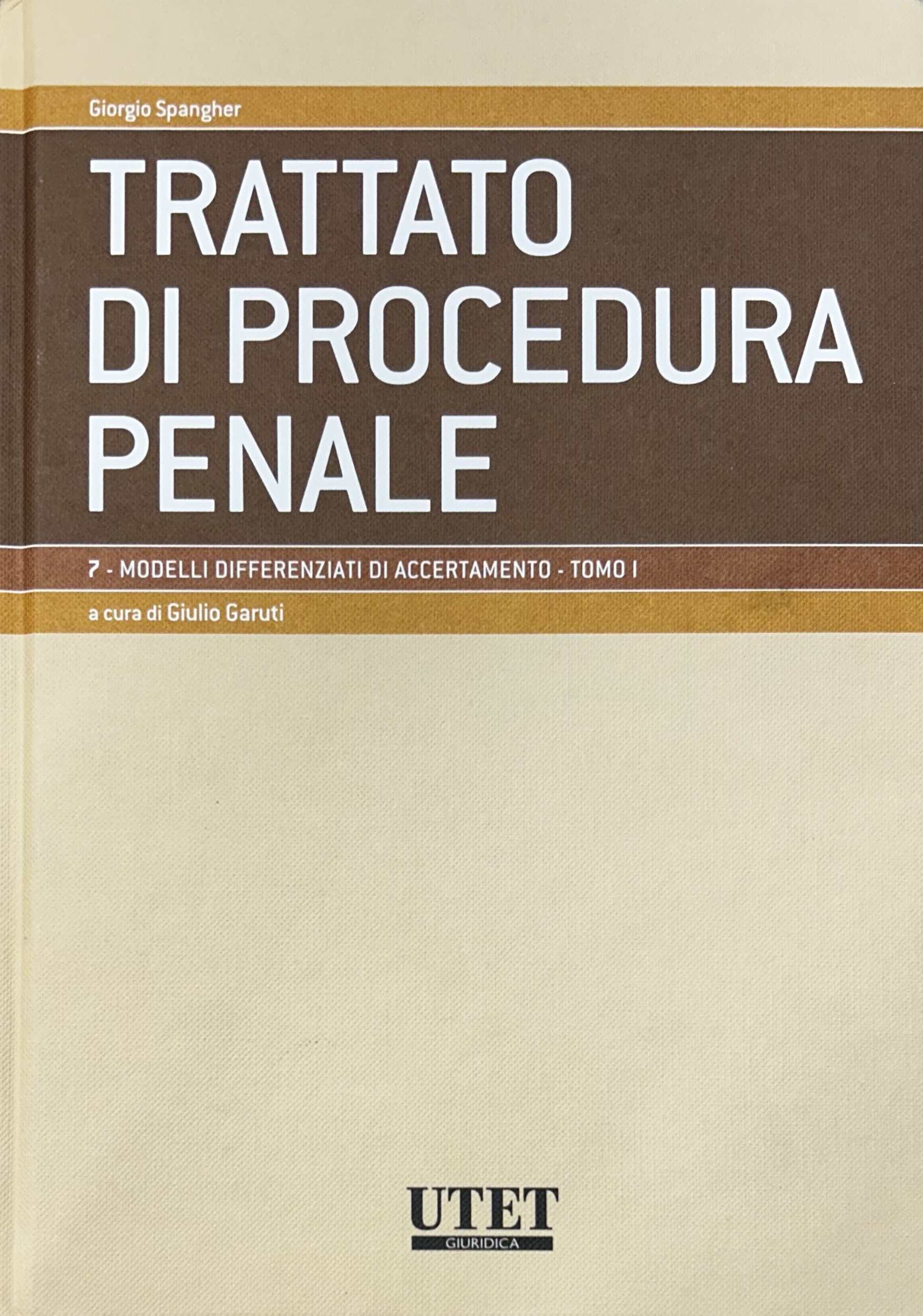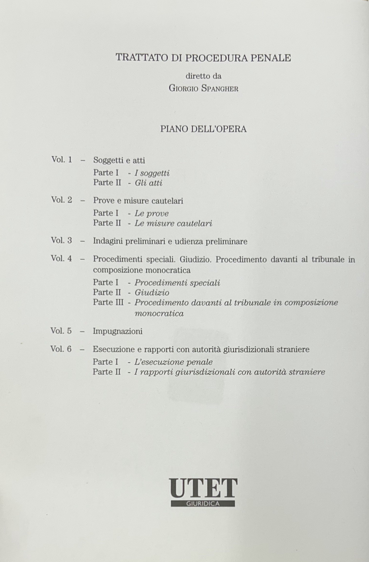 Trattato di procedura penale. Vol. I - Soggetti e atti. Tomo I: I soggetti a cura di Giovanni Dean; Tomo II: Gli atti a cura di Giovanni Dean; Vol. II - Prove e misure cautelari. Tomo I: Le prove a cura di Adolfo Scalfati; Tomo II: Le misure cautelari a cura di Adolfo Scalfati; Vol. III - Indagini preliminari e udienza prliminare a cura di Giulio Garuti; Vol. IV,1 - Procedimenti speciali. Giudizio. Procedimento davanti al tribunale in composizione monocratica. Tomo I: Procedimenti speciali a cura di Leonardo Filippi; Tomo II: Giudizio. Procedimento davanti al tribunale in composizione monocratica a cura di Giorgio Spangher; Vol. V - Impugnazioni a cura di Giorgio Spangher; Vol. VI - Esecuzione e rapporti con autorità giurisdizionali straniere a cura di Luigi Kalb; Vol. VII,1 e VII,2 - Modelli differenziati di accertamento a cura di Giulio Garuti
