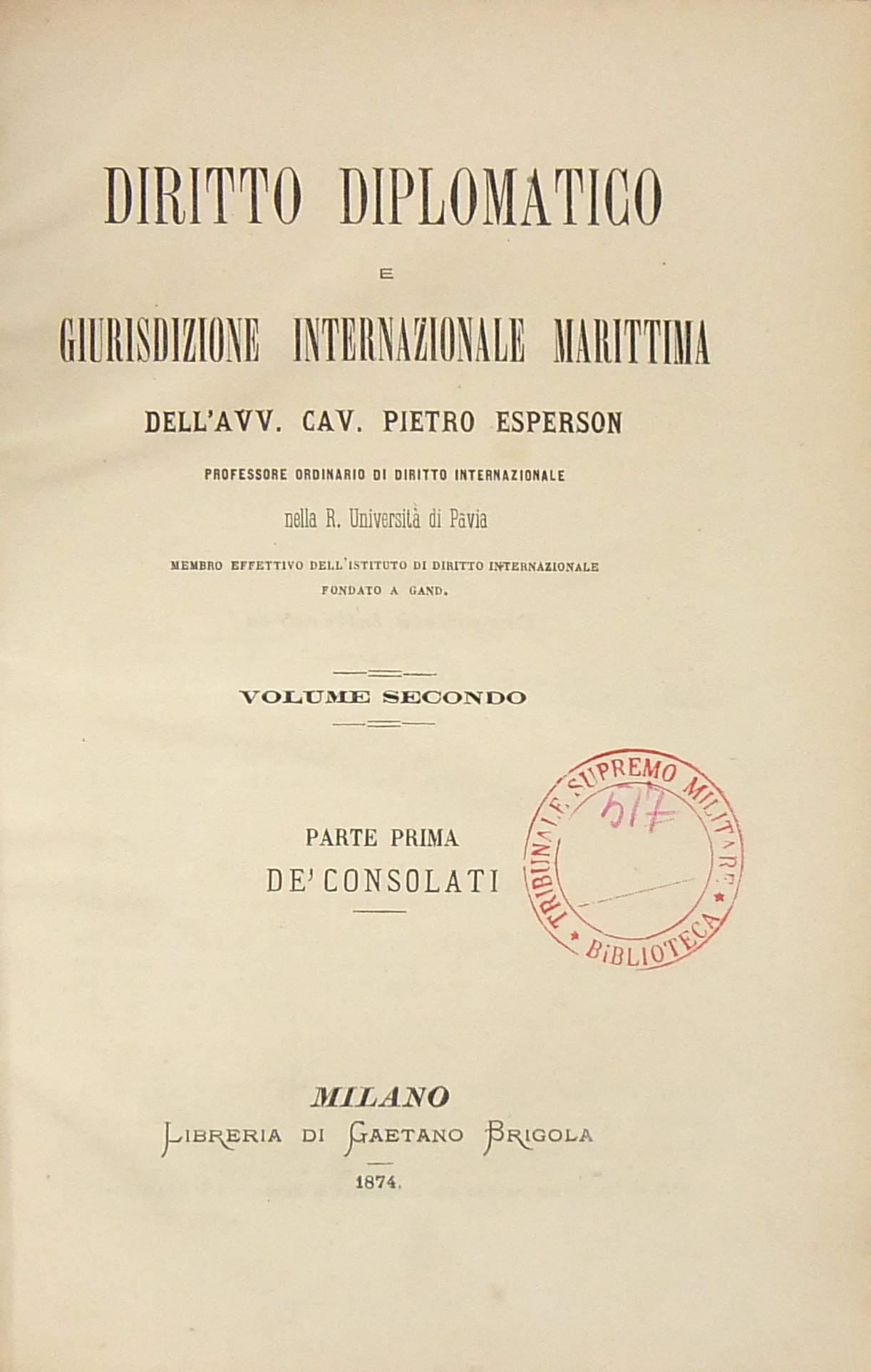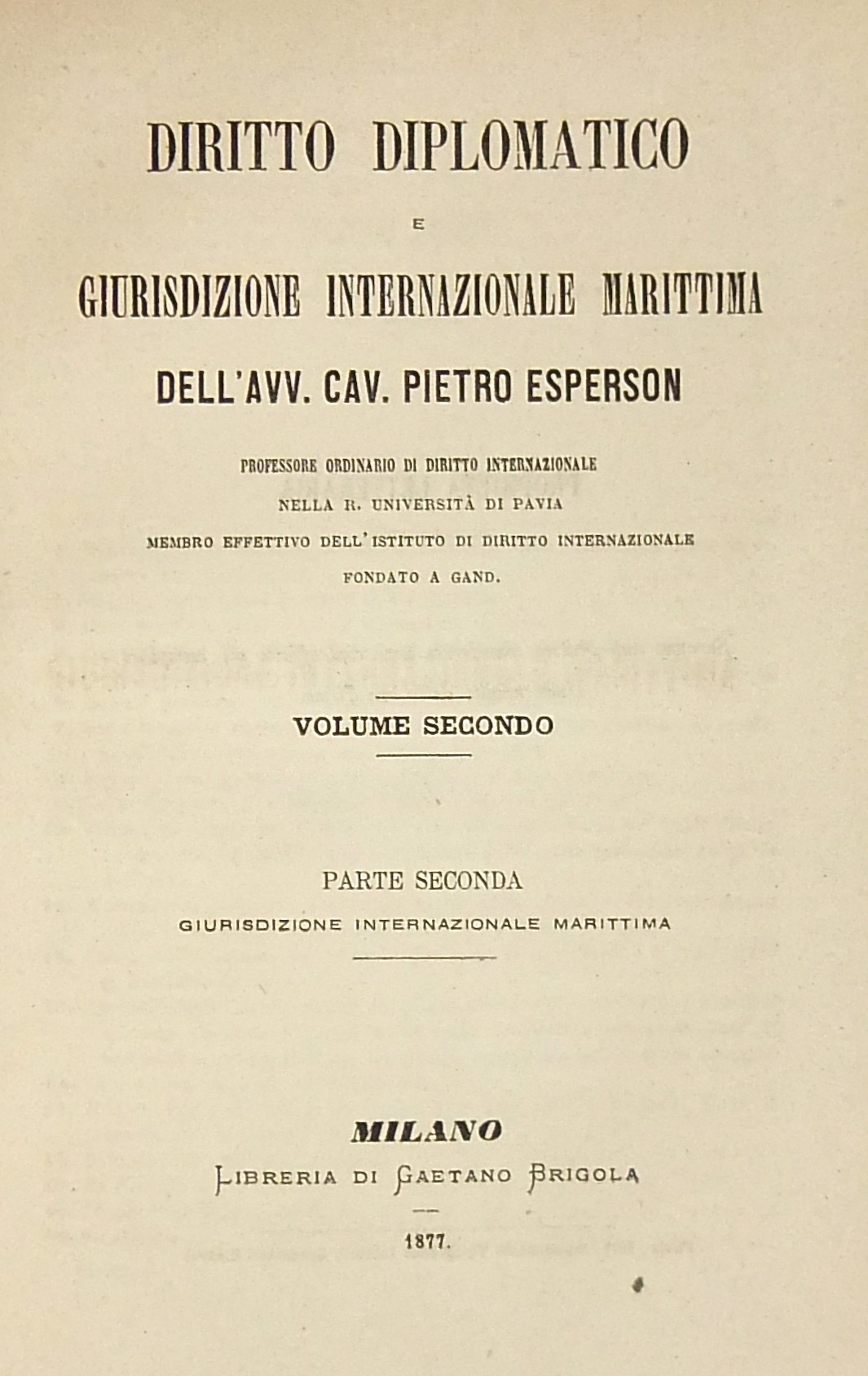 Diritto diplomatico e giurisdizione internazionale marittima con commento delle disposizioni della Legge Italiana del 13 maggio 1871 sulle relazioni della Santa Sede colle Potenze straniere. Vol. I; Vol. II, parte I - De' Consolati. Parte II - Giurisdizione internazionale marittima