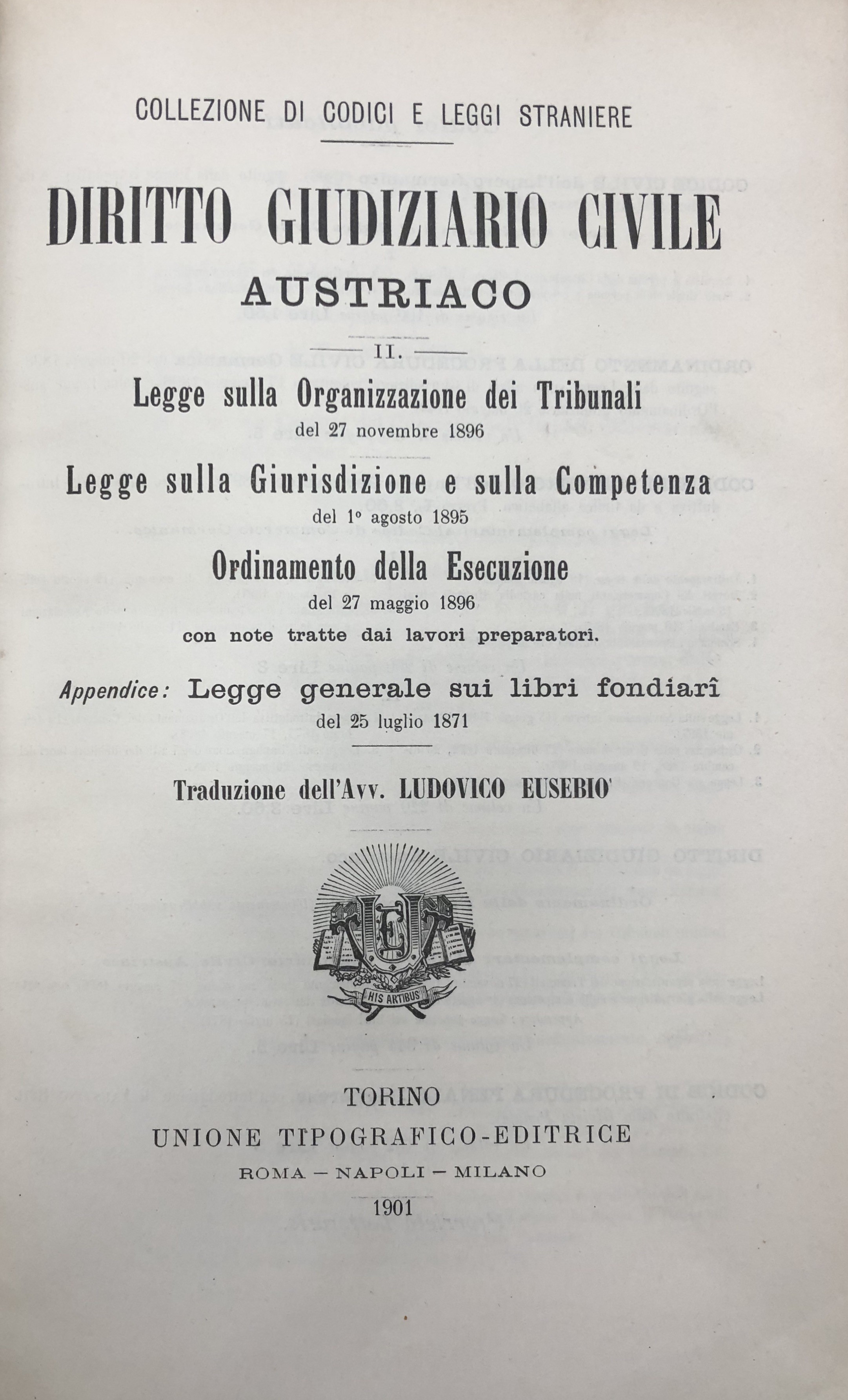 Diritto Giudiziario Civile Austriaco. Vol. I - Ordinamento della Procedura Civile del 1 agosto 1895. Appendice I - Procedimento nelle cause matrimoniali. Appendice II - Legge sull'Avvocatura del 6 luglio 1868. Vol. II - Legge sulla Organizzazione dei Tribunali del 27 novembre 1896. Legge sulla Giurisdizione e sulla Competenza del 1 agosto 1895. Ordinamento della Esecuzione del 27 maggio 1896 con note tratte dai lavori preparatori. Appendice Legge generale sui libri fondiari del 25 luglio 1871