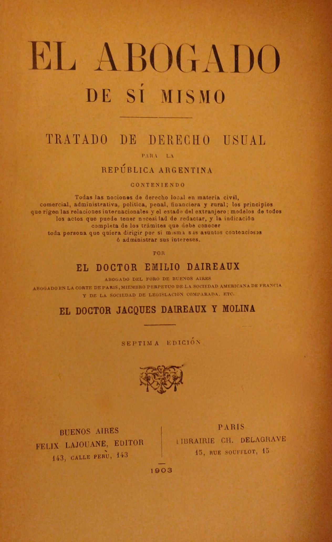 El abogado de si mismo. Tratado de derecho usual para la Republica Argentina. Conteniendo todas la nociones de derecho local en materia civil comercial administrativa politica penal financiera y rural los principios que rigen las relaciones internacionales y el estado del extranjero modelos de todos los actos que puede tener necesidad de redactar y la indicacion completa de los tramites que debe conocer toda persona que quiera dirigir por si misma sus asuntos contenciosos o administrar sus intereses