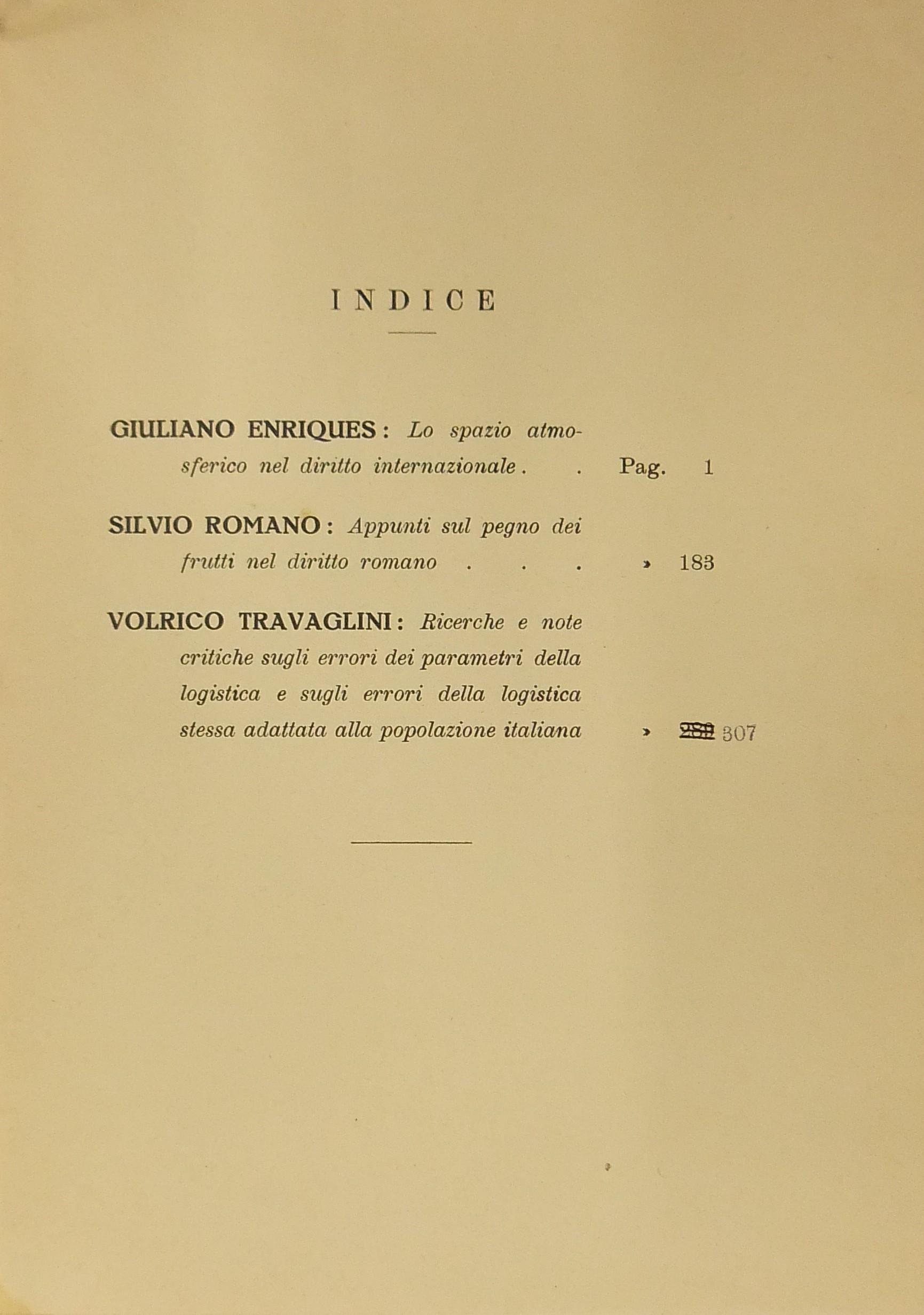 Lo spazio atmosferico nel diritto internazionale (Enriques). Appunti sul pegno dei frutti nel diritto romano (Romano). Ricerche e note critiche sugli errori dei parametri della logistica e sugli errori della logistica stessa adattata alla popolazione italiana (Travaglini)