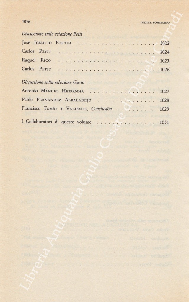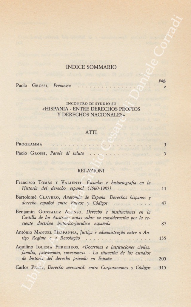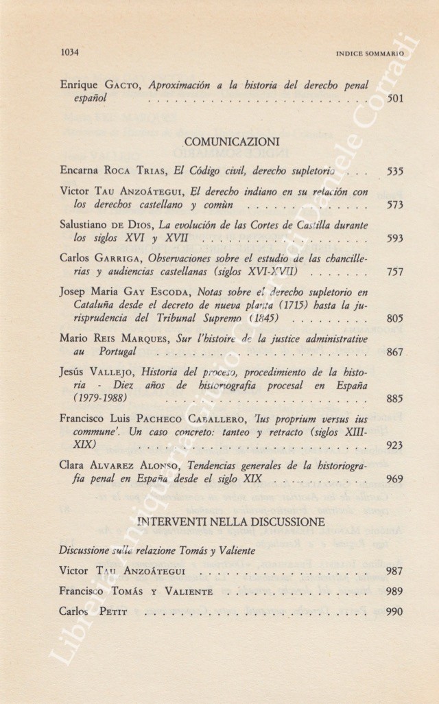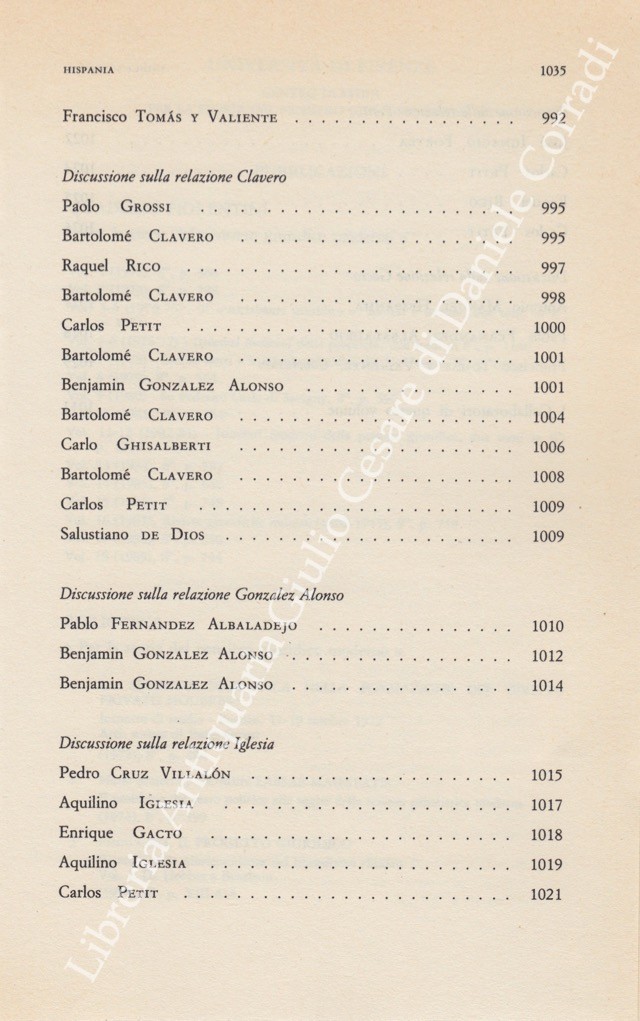 Scritti di: Albaladejo, Alvarez Alonso, Clavero, Cruz Villalon, De Dios, Fortea, Gacto, Garriga, Gay Escoda, Ghisalberti, Gonzalez Alonso, Grossi, Hespanha, Iglesia Ferreiros, Pacheco Caballero, Petit, Reis Marques, Rico, Roca Trias, Tau Anzoategui, Tomas Y Valiente, Vallejo.