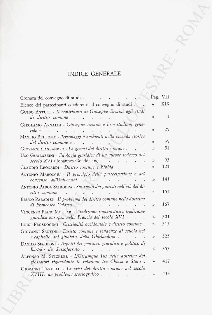 Scritti di: Arnaldi, Astuti, Bellomo, Cassandro, Gualazzini, Leonardi, Marongiu, Padoa Schioppa, Paradisi, Piano Mortari, Prosdocimi, Santini, Segoloni, Stickler, Tarello