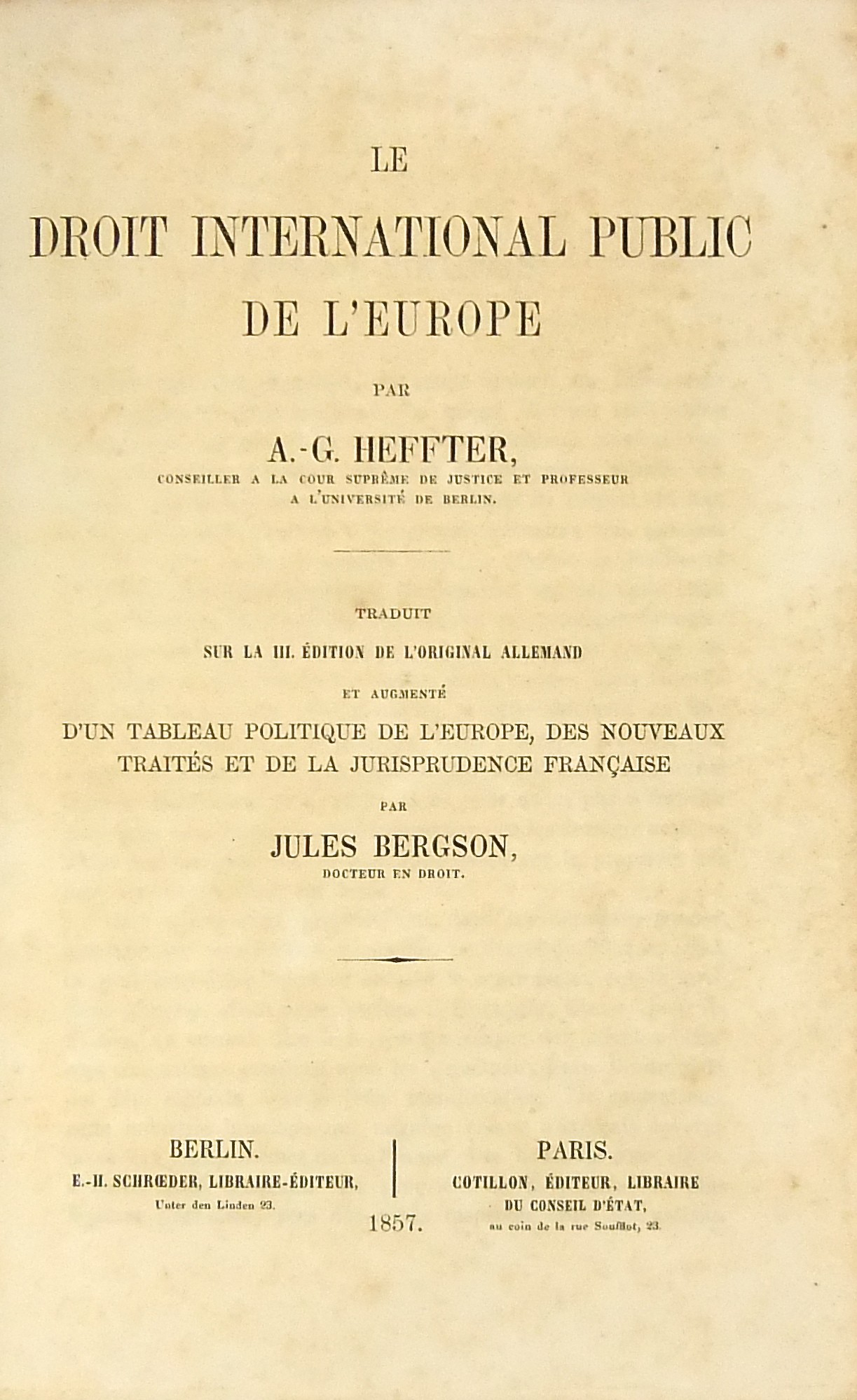 Le Droit International de l'Europe. Traduit sur la III edition de l'original allemand et augmentee d'un tableau politique de l'Europe des nouveaux traites et de la jurisprudence francaise par Jules Bergson