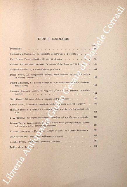 Scritti di: Bartoletti, Biondi, Biscardi, Cardascia, D'Ors, Gaudement, Horvat, Kaser, Paoli, Scherillo, Seidi, Stein, Thomas, Triantaphyllopoulos, Wieacker
