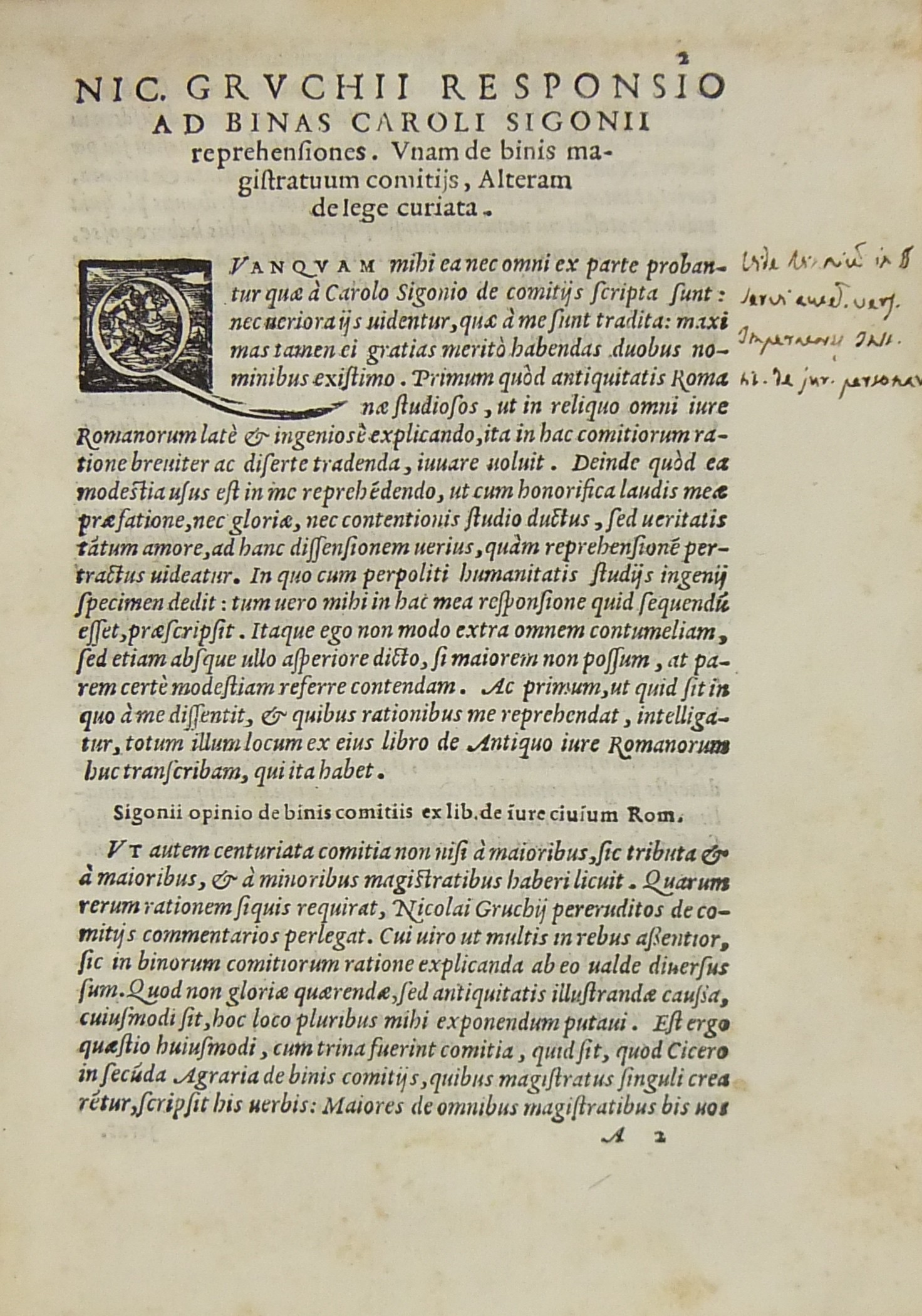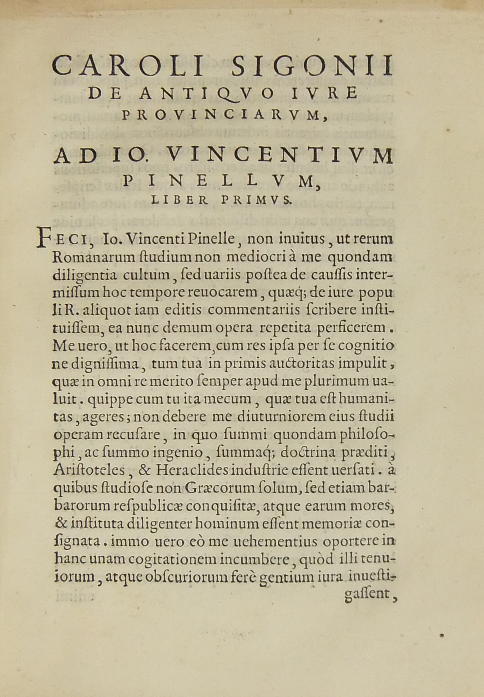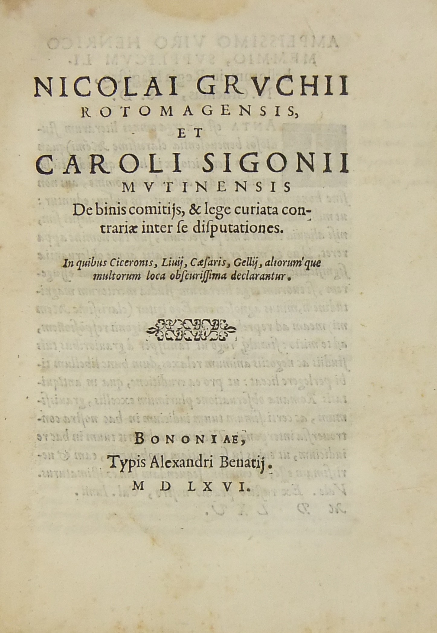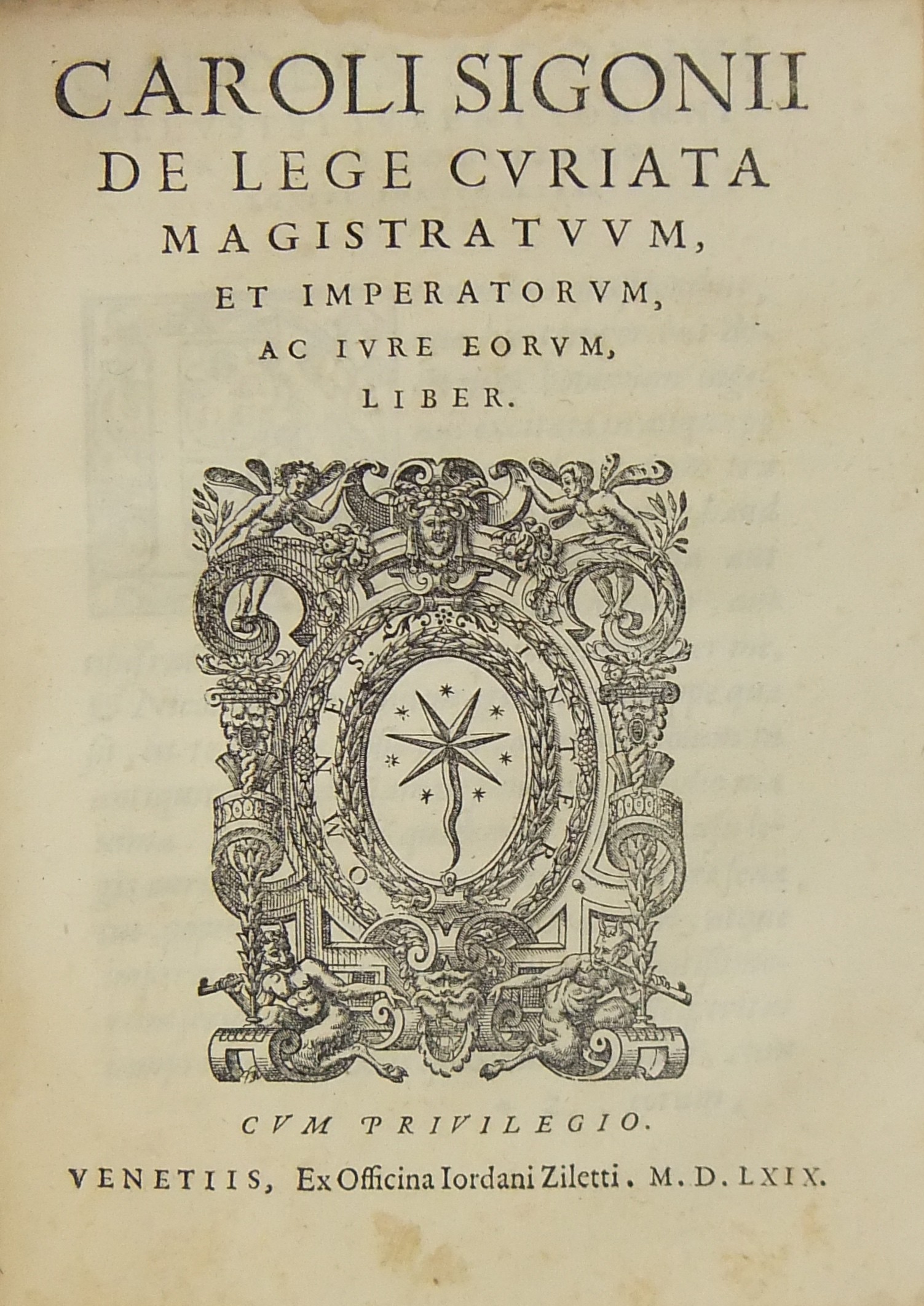 De antiquo iure Provinciarum Libri duo. Nunc primum in lucem editi. Index auctorum et rerum memorabilium. Venetijs ex officina Iordani Ziletti 1568 pp. (10) + 198 + (15). UNITO A: De lege curiata magistratuum ac imperatorum ac iure eorum liber. Venetijs, ex officina Iordani Ziletti, 1569, pp. (6) + 108 + (4). UNITO A: De binis comitijs et lege curiata contrariae inter se disputationes. In quibus Ciceronis Livij Caesaris Gellij altorumque multorum loca obscurissima declarantur. Bononiae, typis Alexandri Benatij, 1566, pp. 68