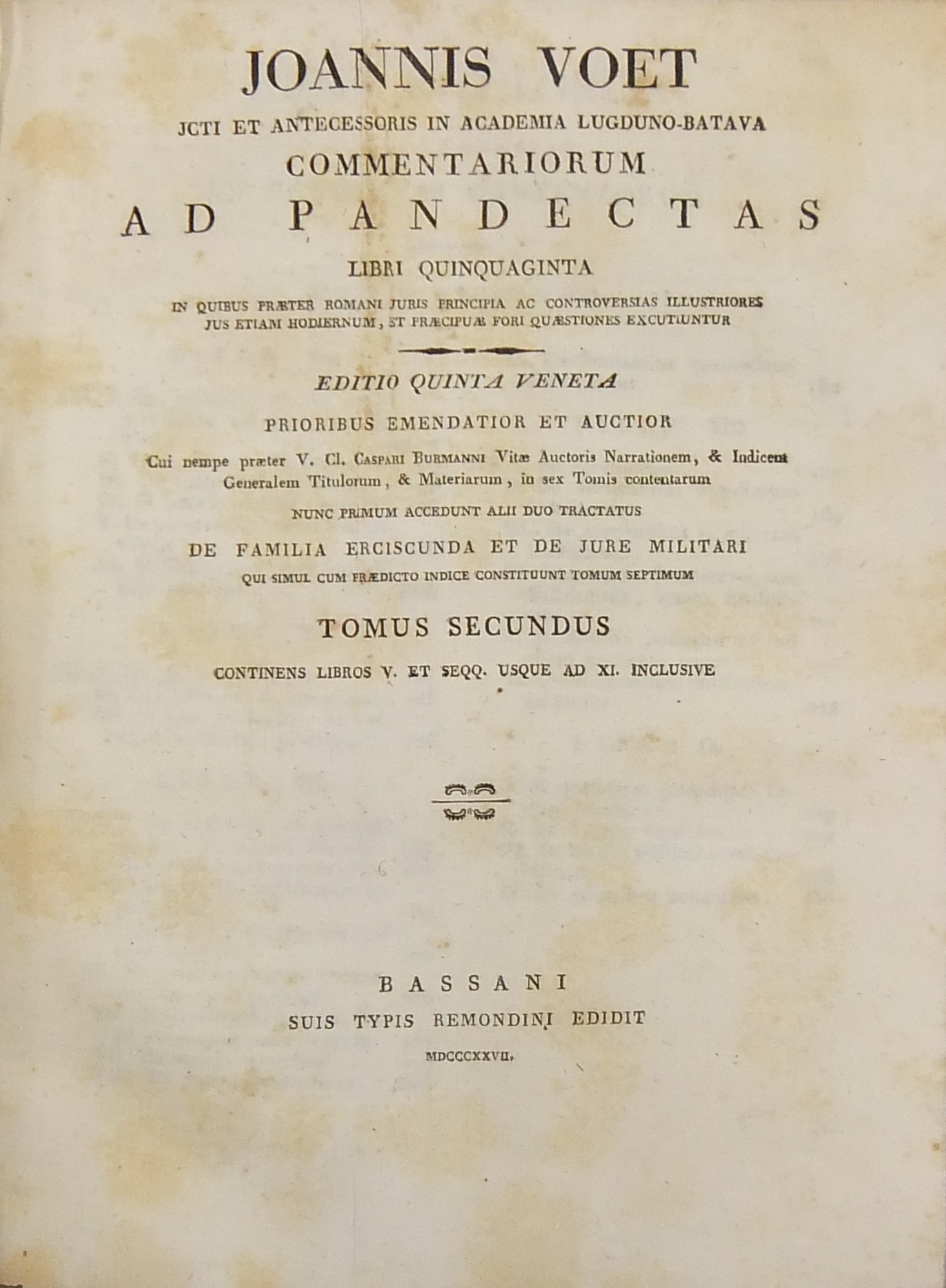 Commentariorum ad Pandectas libri quinquaginta in quibus praeter Romani Juris principia ac controversias illustriores Jus etiam hodiernum & praecipuae Fori Quaestiones excutiuntur. Editio quinta veneta prioribus emendatior et auctior cui nempe praeter V. Cl. Caspari Burmanni Vitae Auctoris Narrationem & Indicem Generalem Titulorum & Materiarum in sex Tomis contentarum nunc primum accedunt alii duo Tractatus de Familia Erciscunda et de Jure Militari qui simul cum praedicto Indice constituunt Tomum septimum