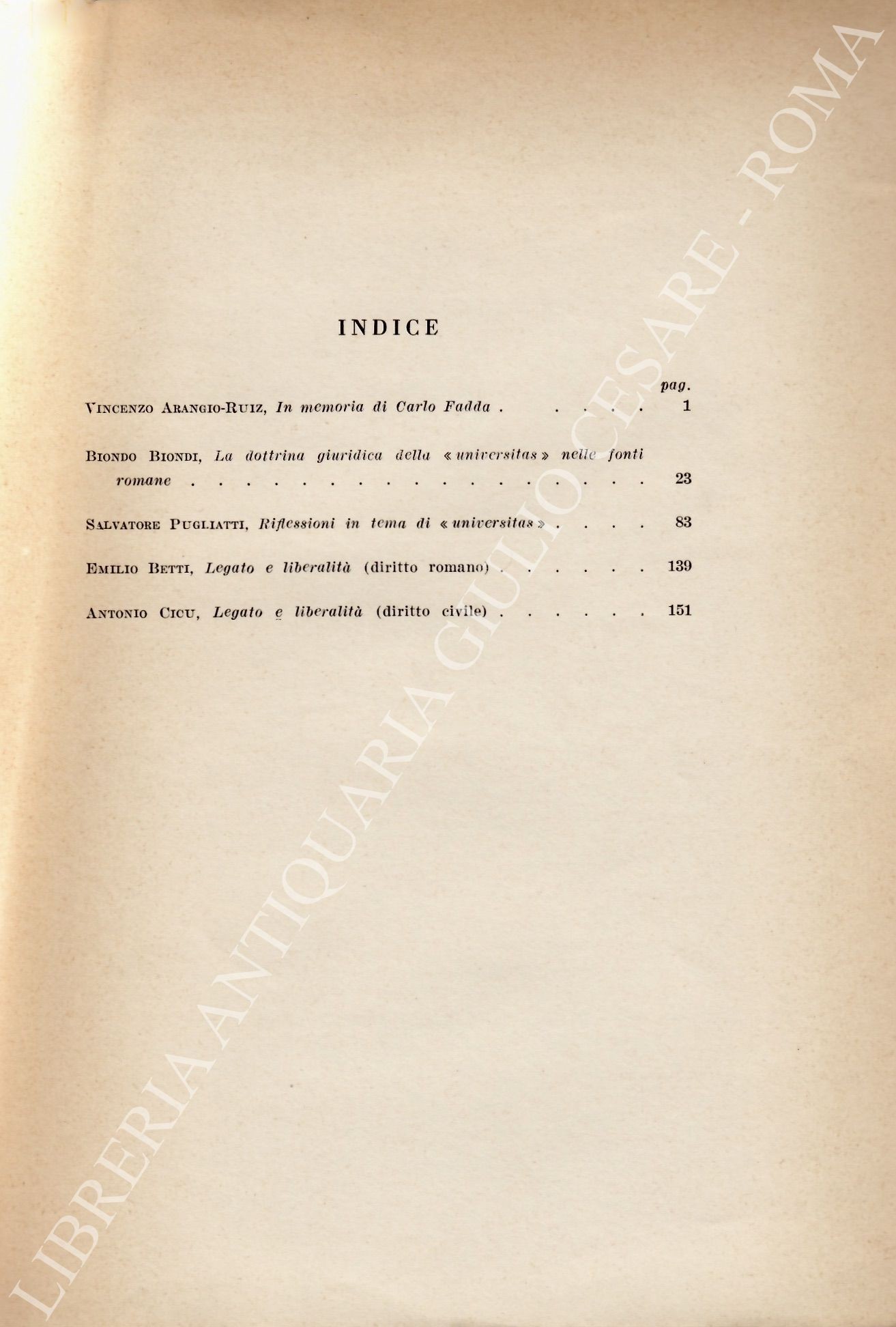 Vincenzo Arangio Ruiz: In memoria di Carlo Fadda. Biondo Biondi: La dotrrina giuridica della "universitas" nelle fonti romane. Salvatore Pugliatti: Riflessioni in tema di "universitas". Emilio Betti: Legato e liberalità (diritto romano). Antonio Cicu: Legato e liberalità (diritto civile)
