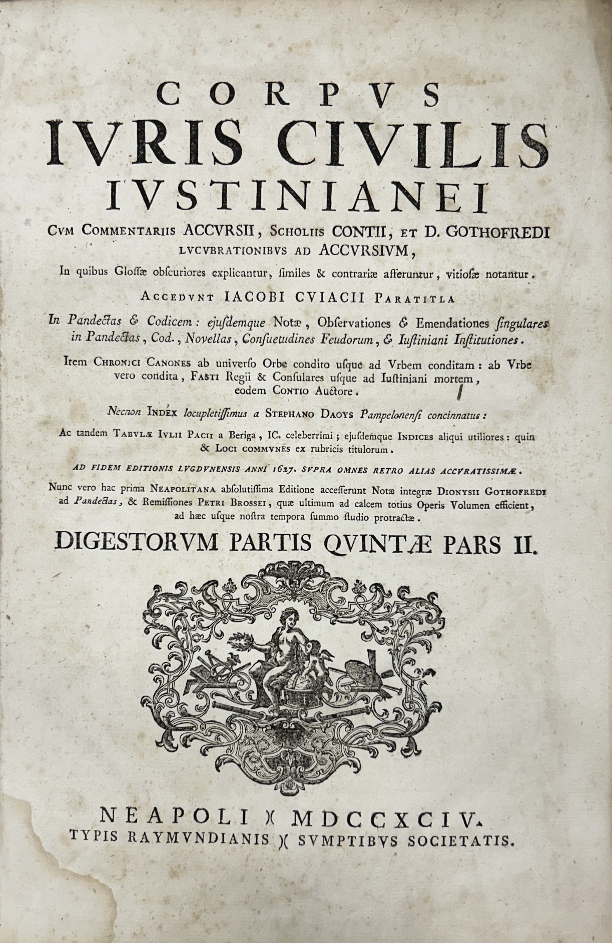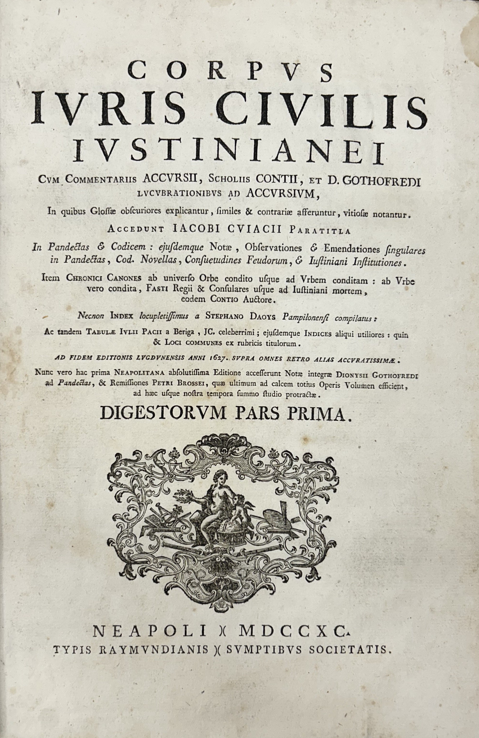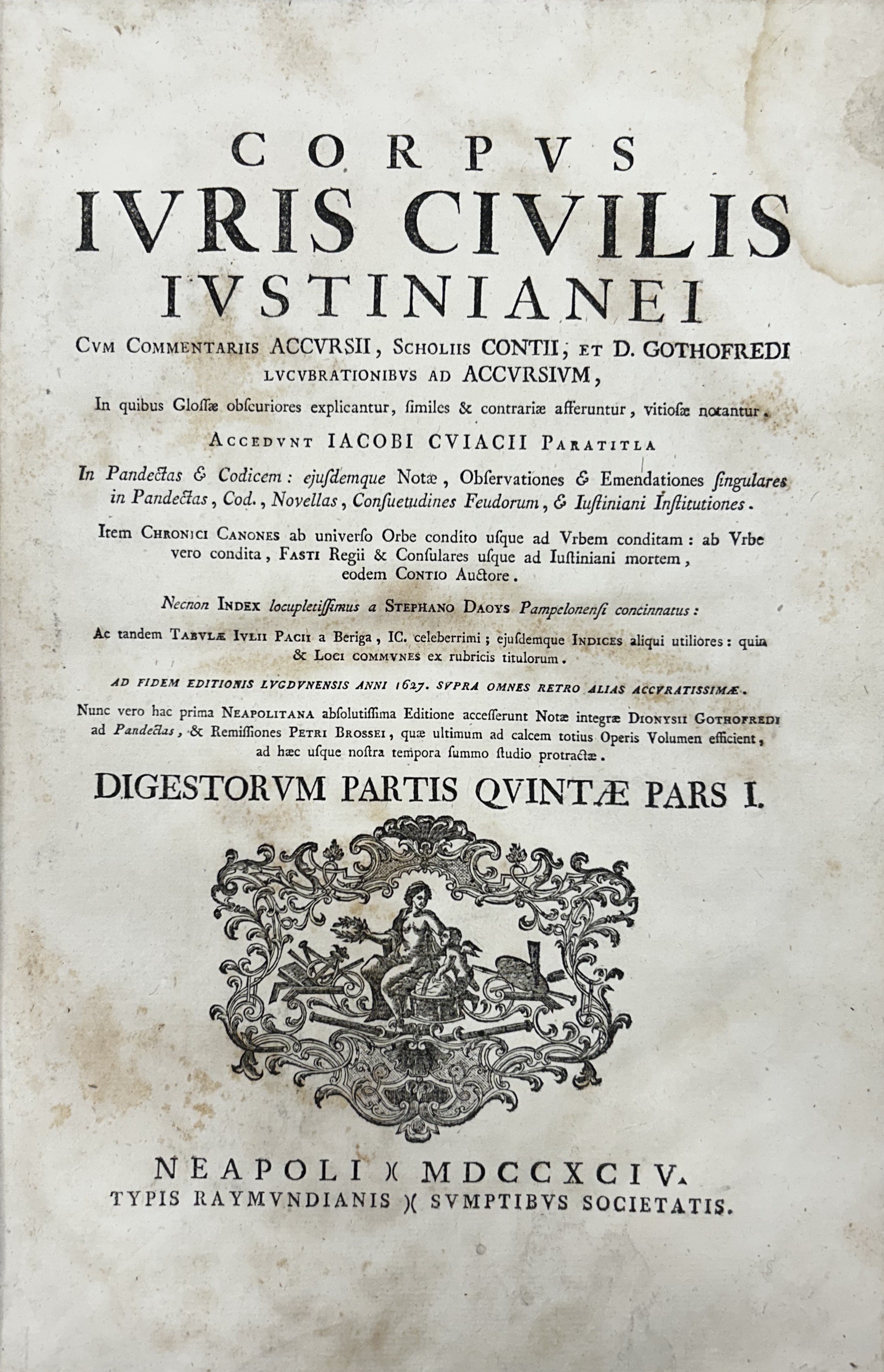 Corpus Iuris Civilis Iustinianei cum Commentariis Accursii, Scholiis Contii, et D. Gothofredi Lucubrationibus ad Accursium, in quibus Glossae obscuriores explicantur, similes et contrariae afferuntur, vitiosae notantur. Accedunt Iacobi Cuiacii Paratitla. In Pandectas et Codicem: ejusdemque Notae, Observationes et Emendationes singulares in Pandectas, Cod. Novellas, Consuetudines Feudorum, et Iustiniani Institutiones. Digestorum pars prima; Digestorum pars seconda; Digestorum pars tertia; Digestorum pars quarta; Digestorum partis quintae pars 1; Digestorum partis quintae pars 2