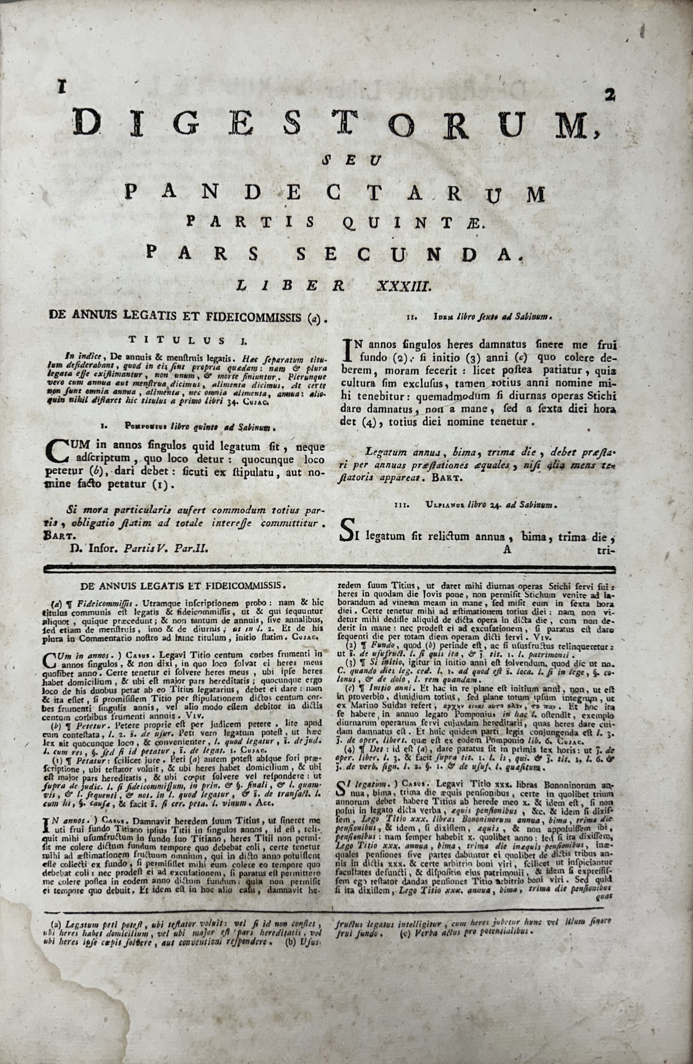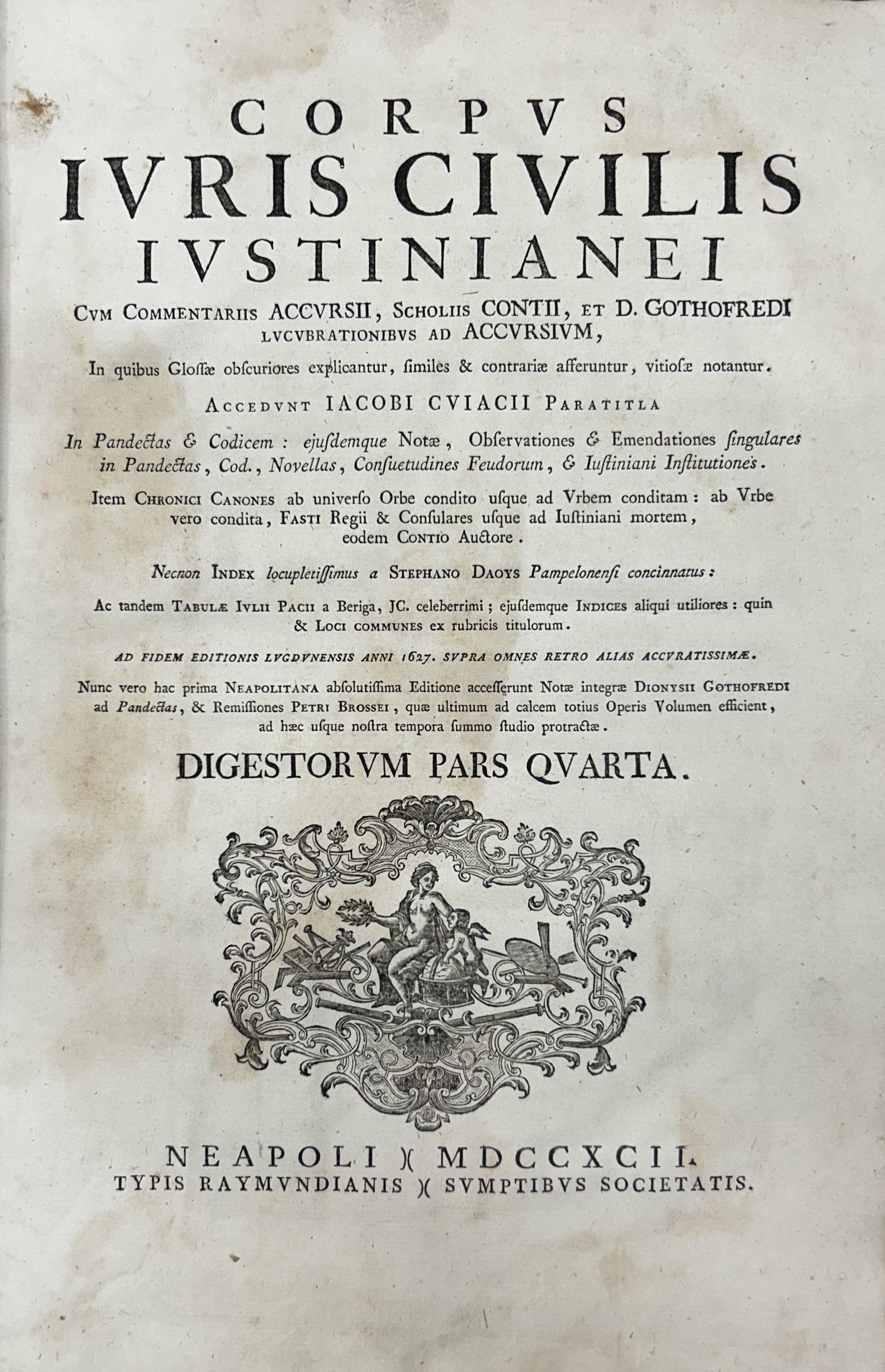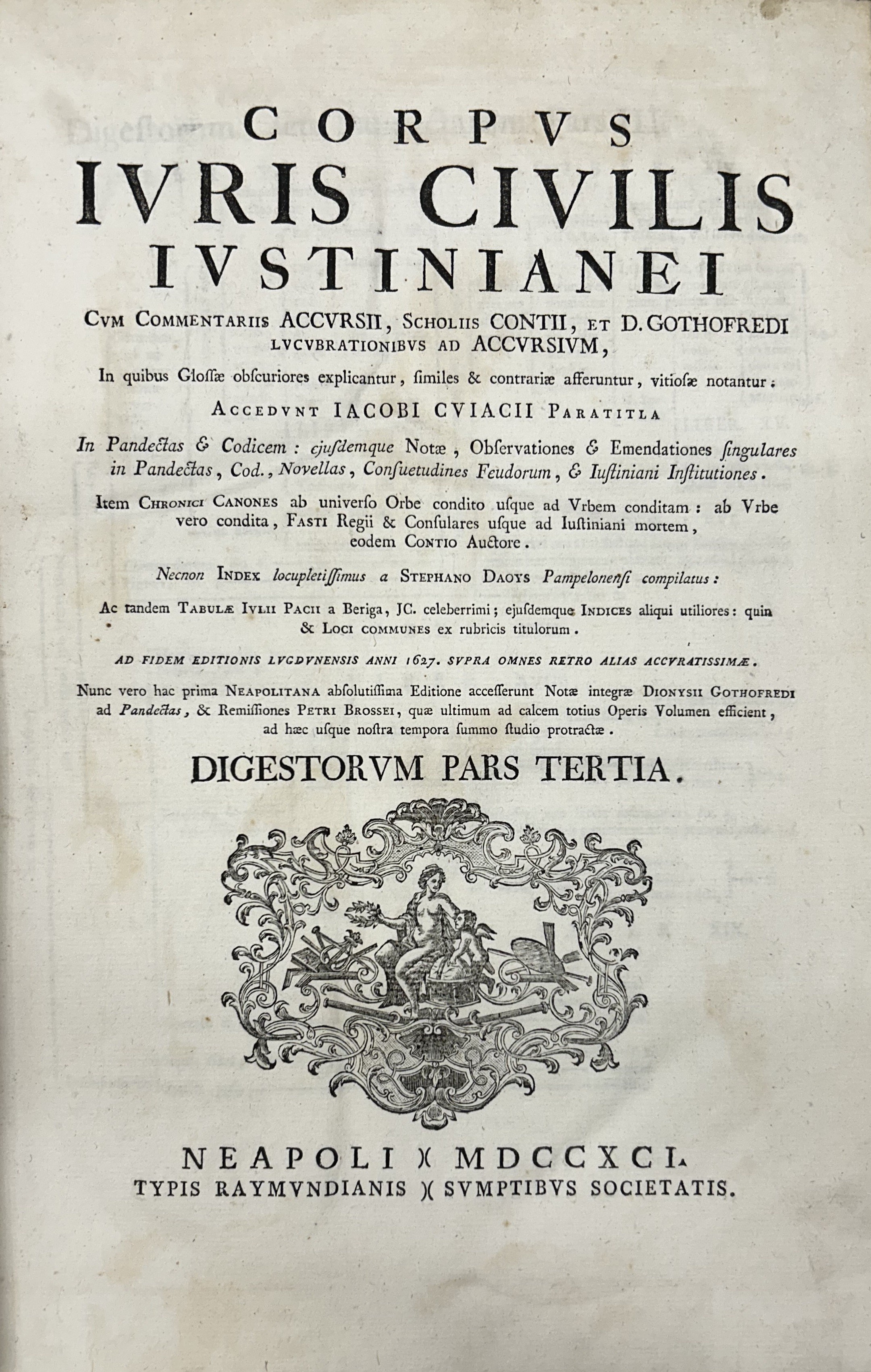 Corpus Iuris Civilis Iustinianei cum Commentariis Accursii, Scholiis Contii, et D. Gothofredi Lucubrationibus ad Accursium, in quibus Glossae obscuriores explicantur, similes et contrariae afferuntur, vitiosae notantur. Accedunt Iacobi Cuiacii Paratitla. In Pandectas et Codicem: ejusdemque Notae, Observationes et Emendationes singulares in Pandectas, Cod. Novellas, Consuetudines Feudorum, et Iustiniani Institutiones. Digestorum pars prima; Digestorum pars seconda; Digestorum pars tertia; Digestorum pars quarta; Digestorum partis quintae pars 1; Digestorum partis quintae pars 2