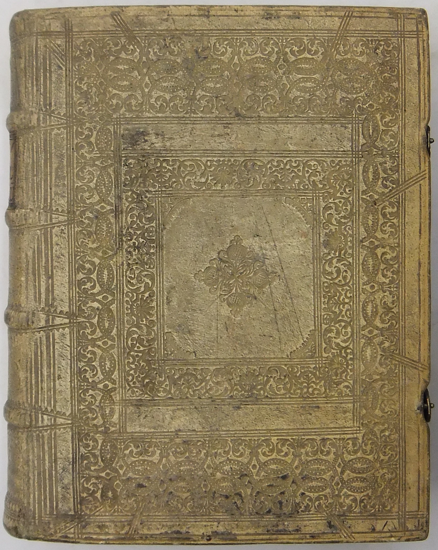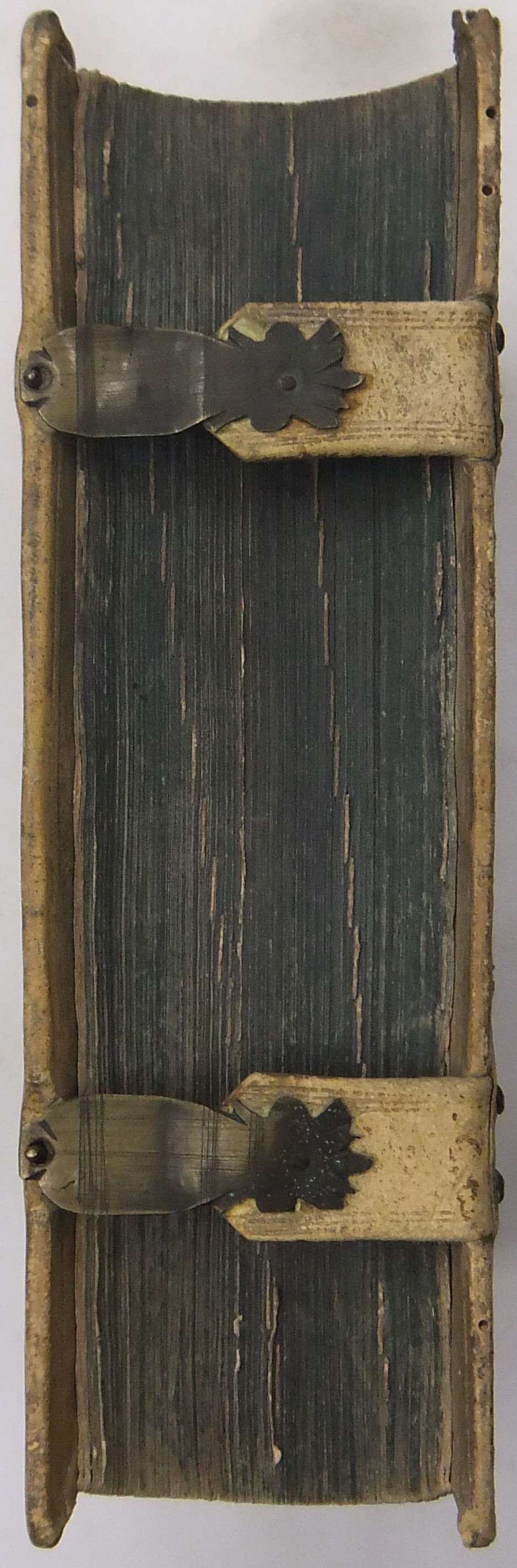 Rilegatura: bellissima legatura cordonata (4 nervi) coeva in piena pergamena su assi di legno con ricchi fregi fitomorfi mosaicati sui piatti e fermagli metallici