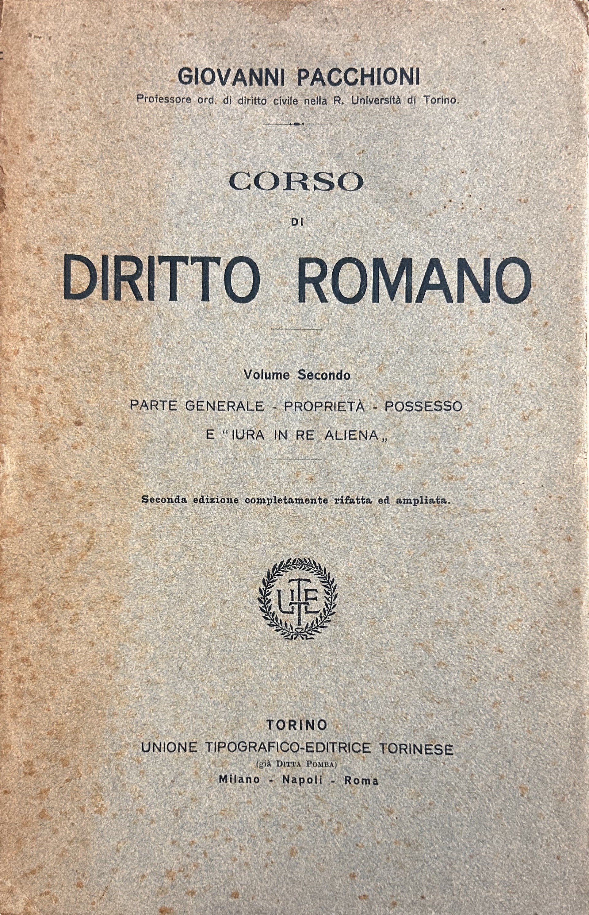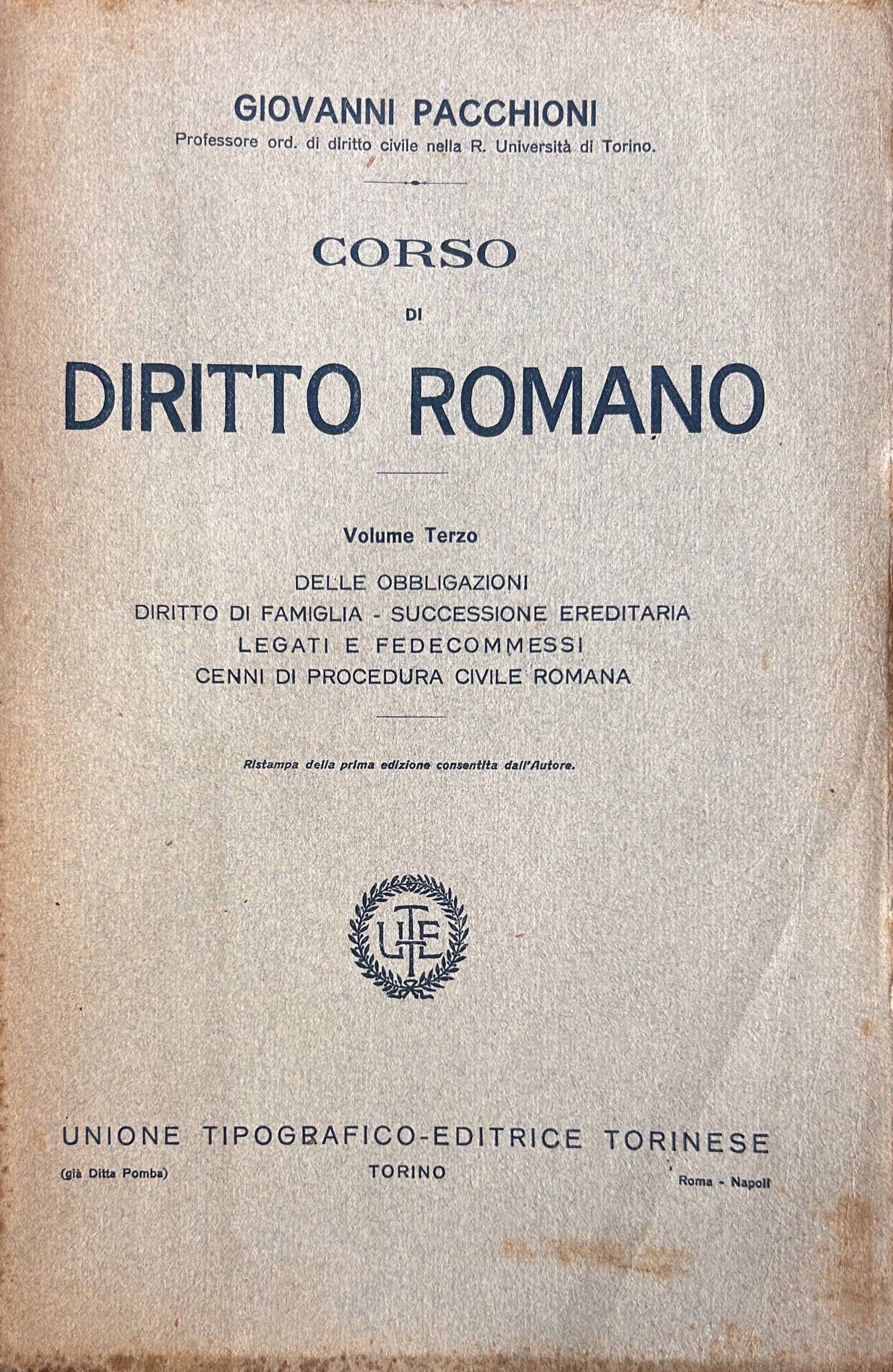 Corso di diritto romano. Vol. I - Storia della costituzione e delle fonti del diritto; Vol. II - Parte generale. Proprietà . Possesso e "iura in re aliena"; Vol. III - Delle obbligazioni. Diritto di famiglia. Successione ereditaria. Legati e fedecommessi. Cenni di procedura civile romana